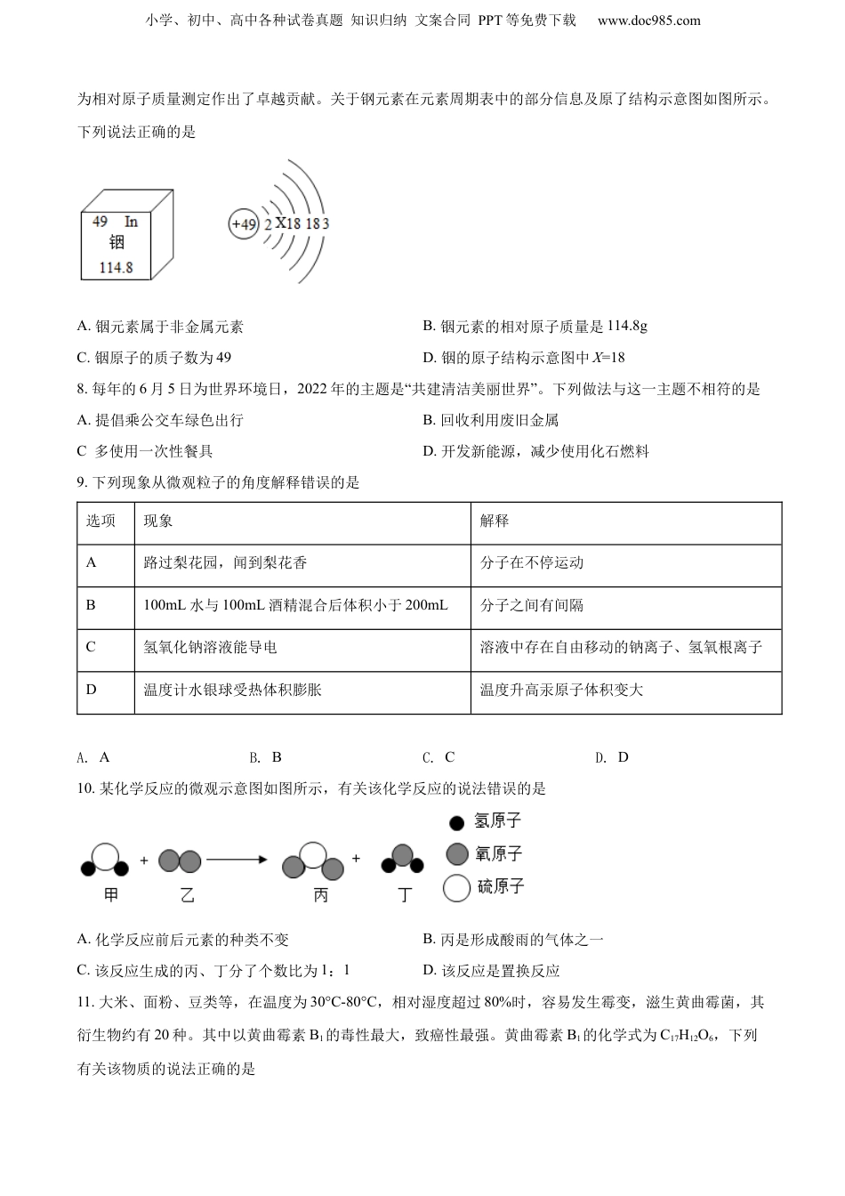 小学、初中、高中各种试卷真题知识归纳文案合同PPT等免费下载www.doc985.com2022年衡阳市初中学业水平考试试卷化学一、选择题(本题23小题,每小题2分,共46分。每小题只有一个正确答案。)1.衡阳市拥有众多非物质文化遗产。下列非物质文化遗产制作过程中,主要利用化学变化的是A.南岳剪纸B.石市竹木雕C.常宁版画D.未阳糯米酒2.下列实验操作错误的是A.量筒读数B.稀释浓硫酸C.滴加液体D.过滤3.下列有关实验现象描述正确的是A.细铁丝在氧气中燃烧生成红色固体B.红磷在空气中燃烧产生大量白烟C.Na2CO3溶液中滴加澄清石灰水,无明显现象D.硝酸铵溶于水时会放出大量的热4.下列关于空气的说法错误的是A.空气是一种混合物B.空气是一种宝贵的资源C.稀有气体化学性质很不活泼,不与任何物质发生化学反应D.空气中氧气的体积分数约为21%5.2021年10月16日神舟十三号载人飞船发射成功,开始中国迄今为止时间最长的载人飞行。太空舱里常用NiFe2O4作催化剂将航天员呼出的CO2转化为O2,已知NiFe2O4中Fe为+3价,则Ni的化合价为A.+1B.+2C.+3D.+46.下列物质含有氧分子的是A.H2O2B.O2C.KMnO4D.NO27.我国著名科学家、中国科学院院士张青莲教授主持测定了铟、铱、锑、铕等近十种元素的相对原子质量,小学、初中、高中各种试卷真题知识归纳文案合同PPT等免费下载www.doc985.com为相对原子质量测定作出了卓越贡献。关于钢元素在元素周期表中的部分信息及原了结构示意图如图所示。下列说法正确的是A.铟元素属于非金属元素B.铟元素的相对原子质量是114.8gC.铟原子的质子数为49D.铟的原子结构示意图中X=188.每年的6月5日为世界环境日,2022年的主题是“共建清洁美丽世界”。下列做法与这一主题不相符的是A.提倡乘公交车绿色出行B.回收利用废旧金属C.多使用一次性餐具D.开发新能源,减少使用化石燃料9.下列现象从微观粒子的角度解释错误的是选项现象解释A路过梨花园,闻到梨花香分子在不停运动B100mL水与100mL酒精混合后体积小于200mL分子之间有间隔C氢氧化钠溶液能导电溶液中存在自由移动的钠离子、氢氧根离子D温度计水银球受热体积膨胀温度升高汞原子体积变大A.AB.BC.CD.D10.某化学反应的微观示意图如图所示,有关该化学反应的说法错误的是A.化学反应前后元素的种类不变B.丙是形成酸雨的气体之一C.该反应生成的丙、丁分了个数比为1:1D.该反应是置换反应11.大米、面粉、豆类等,在温度为30°C-80°C,相对湿度超过80%时,容易发生霉变,滋生黄曲霉菌,其衍生物约有20种。其中以黄曲霉素B1的毒性最大,致癌性最强。黄曲霉素B1的化学式为C17H12O6,下列有关该物质的说法正确的是小学、初中、高中各种试卷真题知识归纳文案合同PPT等免费下载www.doc985.comA.黄曲霉素B1由35个原子构成B.黄曲霉素B1中碳元素、氢元素、氧元素的质量之比是17:12:6C.黄曲霉素B1中氧元素的质量分数最小D.黄曲霉素B1由三种元素组成12.实验室中的药品要求分类存放。某实验室1号柜存放的是单质,2号柜存放的是酸,3号柜存放的是碱,4号柜存放的是盐。纯碱应存放的实验柜是A.1号柜B.2号柜C.3号柜D.4号柜13.2022年北京冬奥会场馆中的国家速滑馆又称“冰丝带”,它的建设应用了智慧建造技术,减少使用钢材2800吨,采用当前冬季运动场馆最环保的制冰技术一二氧化碳跨临界直接制冰技术,该技术是通过压力变化使二氧化碳汽化实现制冷。下列说法错误的是A.钢属于铁合金B.利用干冰人工降雨与二氧化碳跨临界直接制冰,它们的原理相似C.二氧化碳跨临界直接制冰技术利用了其化学性质D.应用二氧化碳跨临界直接制冰技术符合“绿色奥运”理念14.下列有关燃烧与灭火的说法错误的是A.将煤球做成蜂窝状其日的是增大煤与空气的接触面积,使燃料充分燃烧B.用水灭火其原理是降低了可燃物的着火点C.遭遇火灾要采取必要的自救措施,如用湿毛巾捂住口鼻,蹲下靠近地面跑离着火区域等D.加油站、面粉加工厂必须严禁烟火15.下列实验方案,不能达到相应实验目的的是A.证明烧碱有吸水性B.比较Zn和Fe的金属活动性强弱小学、初中、高中各种试卷真题知识归纳文案合同PPT等免费下载www.doc985.comC.测定空气中氧气的含量D.验证蜡烛燃烧的产物中有水16.化肥对提高农作物的产...