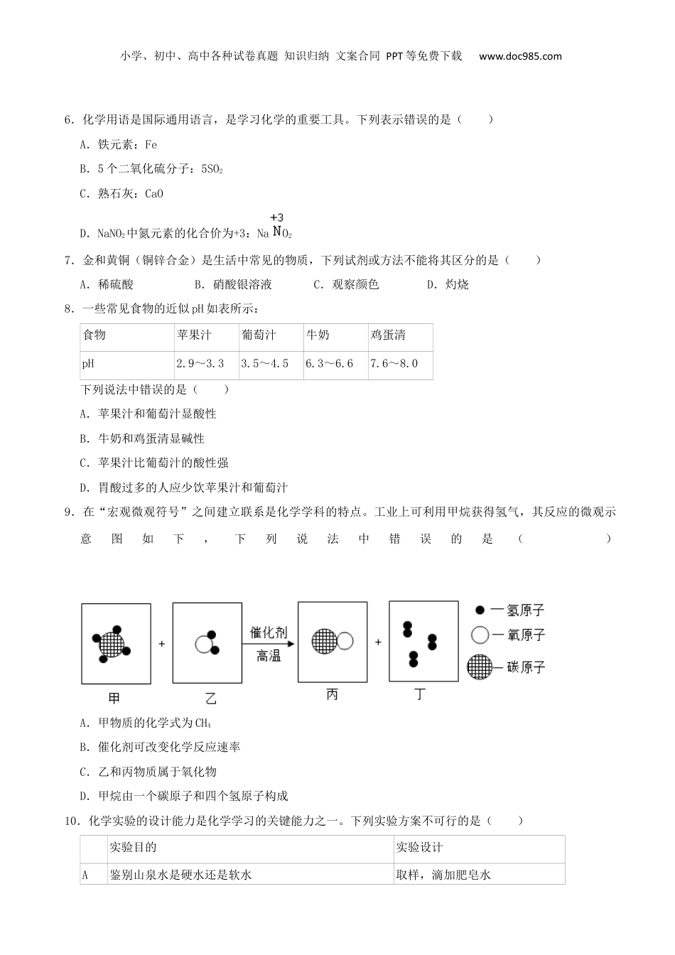 小学、初中、高中各种试卷真题知识归纳文案合同PPT等免费下载www.doc985.com2022年湖南省张家界市中考化学试卷一、选择题(本题共10小题,每小题2分,共20分。每小题只有1个选项符合题意)1.物质是不断变化的。下列变化过程没有发生化学变化的是()A.苹果腐烂B.盐酸除锈C.红磷燃烧D.冰块融化2.空气是一种宝贵的自然资源。下列有关空气的说法错误的是()A.洁净的空气属于纯净物B.食品包装中充氮气以防腐C.氧气供给人和动植物呼吸D.空气中氮气的体积分数约为78%3.正确的实验操作对实验结果、人身安全都非常重要。下列实验操作正确的是()A.量取液体B.滴加液体C.连接仪器D.稀释浓硫酸4.张家界市正在创建全国文明城市和国家食品安全示范城市。下列有关做法与创建要求不相符的是()A.实验废液统一回收处理B.用甲醛溶液处理海鲜产品C.不食用过期或变质食品D.矿泉水瓶放入可回收垃圾箱5.化学与生活息息相关。下列说法或做法错误的是()A.缺钙会引起贫血B.用白醋除去热水壶中的水垢C.炒菜时油锅着火可用锅盖盖灭D.用洗洁精除去餐具上的油污小学、初中、高中各种试卷真题知识归纳文案合同PPT等免费下载www.doc985.com6.化学用语是国际通用语言,是学习化学的重要工具。下列表示错误的是()A.铁元素:FeB.5个二氧化硫分子:5SO2C.熟石灰:CaOD.NaNO2中氮元素的化合价为+3:NaO27.金和黄铜(铜锌合金)是生活中常见的物质,下列试剂或方法不能将其区分的是()A.稀硫酸B.硝酸银溶液C.观察颜色D.灼烧8.一些常见食物的近似pH如表所示:食物苹果汁葡萄汁牛奶鸡蛋清pH2.9~3.33.5~4.56.3~6.67.6~8.0下列说法中错误的是()A.苹果汁和葡萄汁显酸性B.牛奶和鸡蛋清显碱性C.苹果汁比葡萄汁的酸性强D.胃酸过多的人应少饮苹果汁和葡萄汁9.在“宏观微观符号”之间建立联系是化学学科的特点。工业上可利用甲烷获得氢气,其反应的微观示意图如下,下列说法中错误的是()A.甲物质的化学式为CH4B.催化剂可改变化学反应速率C.乙和丙物质属于氧化物D.甲烷由一个碳原子和四个氢原子构成10.化学实验的设计能力是化学学习的关键能力之一。下列实验方案不可行的是()实验目的实验设计A鉴别山泉水是硬水还是软水取样,滴加肥皂水小学、初中、高中各种试卷真题知识归纳文案合同PPT等免费下载www.doc985.comB测定雨水的酸碱度取样,用pH试纸测定C鉴别氢氧化钙溶液和氢氧化钠溶液取样,分别滴加酚酞溶液D除去CO2中少量的CO将混合气体通过灼热的氧化铜A.AB.BC.CD.D二、填空题(本题共3小题,每空1分,共15分)11.(5分)2021年12月9日和2022年3月23日,宇航员进行了两次太空授课,解答同学们的疑问,传播和普及科学知识,凸显了我国蓬勃发展的航天事业!(1)宇航员所用的“再生水”是收集的尿液和舱内冷凝水经净化系统处理后形成的蒸馏水。在日常生活中净化水时常利用活性炭的性除去色素和异味。(2)宇航员需要的氧气是通过电解水得到的,其反应的化学方程式为。(3)王亚平老师将一片泡腾片放入蓝色水球中,球内迅速产生气泡,并闻到了阵阵香气。从分子的角度分析“闻到香气”的原因是。(4)“冰雪实验”是运用结晶的原理。乙酸钠在不同温度时的溶解度如表所示:温度(℃)10203040506080100溶解度(g)40.8846.554.5565.58313915317060℃时,向盛有100g水的烧杯中加入g乙酸钠固体,搅拌,恰好形成饱和溶液,将其饱和溶液降温到20℃时,可观察到的现象是。12.(5分)第24届冬奥会在我国如期举行,“绿色、科技、文化”是本届冬奥会的特点。(1)北京烤鸭是中国特色美食。从营养角度考虑,烤鸭能给人们提供的最主要的营养素是(选填“糖类”、“蛋白质”或“维生素”)。(2)北京冬奥会颁奖礼服的内胆添加了石墨烯(单层石墨)发热材料,其原理是将电能转化为热能且均匀传递,据此可知石墨烯具有的性质有(写一条)。小学、初中、高中各种试卷真题知识归纳文案合同PPT等免费下载www.doc985.com(3)北京冬奥会主火炬与赛场内的公交车首次用氢气作燃料,选择氢气替代天然气作燃料的优点。(4)碲化镉发电玻璃成为绿色和科技办奥交汇的创新点。碲在元...