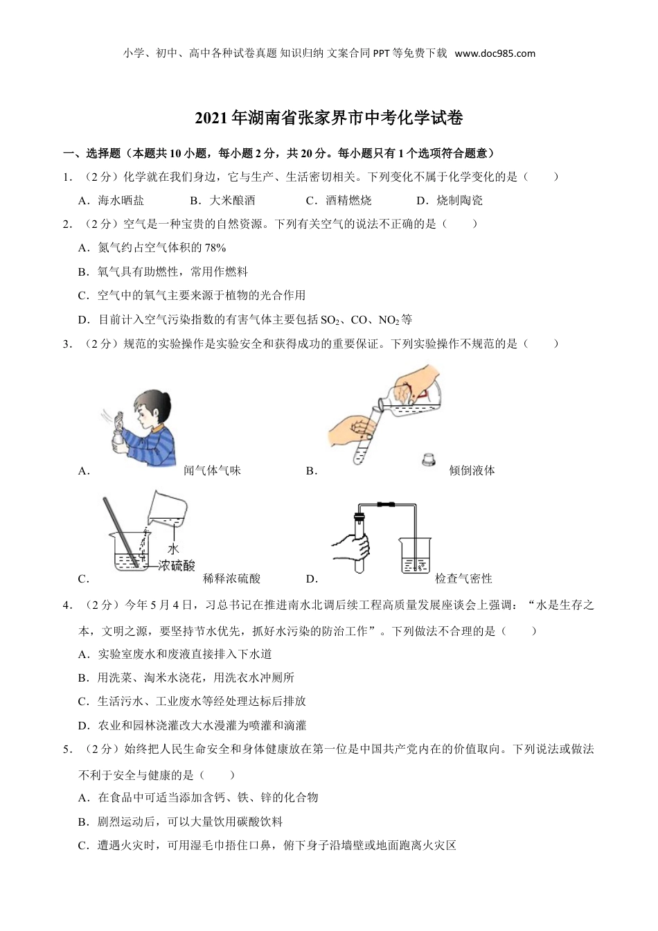 小学、初中、高中各种试卷真题知识归纳文案合同PPT等免费下载www.doc985.com2021年湖南省张家界市中考化学试卷一、选择题(本题共10小题,每小题2分,共20分。每小题只有1个选项符合题意)1.(2分)化学就在我们身边,它与生产、生活密切相关。下列变化不属于化学变化的是()A.海水晒盐B.大米酿酒C.酒精燃烧D.烧制陶瓷2.(2分)空气是一种宝贵的自然资源。下列有关空气的说法不正确的是()A.氮气约占空气体积的78%B.氧气具有助燃性,常用作燃料C.空气中的氧气主要来源于植物的光合作用D.目前计入空气污染指数的有害气体主要包括SO2、CO、NO2等3.(2分)规范的实验操作是实验安全和获得成功的重要保证。下列实验操作不规范的是()A.闻气体气味B.倾倒液体C.稀释浓硫酸D.检查气密性4.(2分)今年5月4日,习总书记在推进南水北调后续工程高质量发展座谈会上强调:“水是生存之本,文明之源,要坚持节水优先,抓好水污染的防治工作”。下列做法不合理的是()A.实验室废水和废液直接排入下水道B.用洗菜、淘米水浇花,用洗衣水冲厕所C.生活污水、工业废水等经处理达标后排放D.农业和园林浇灌改大水漫灌为喷灌和滴灌5.(2分)始终把人民生命安全和身体健康放在第一位是中国共产党内在的价值取向。下列说法或做法不利于安全与健康的是()A.在食品中可适当添加含钙、铁、锌的化合物B.剧烈运动后,可以大量饮用碳酸饮料C.遭遇火灾时,可用湿毛巾捂住口鼻,俯下身子沿墙壁或地面跑离火灾区小学、初中、高中各种试卷真题知识归纳文案合同PPT等免费下载www.doc985.comD.在使用和储存易燃、易爆物时,必须严格遵守有关规定,决不允许违章操作6.(2分)化学用语是国际通用语言,是学习化学的重要工具。下列化学用语书写不正确的是()A.铁元素:FeB.两个水分子:2H2OC.纯碱:NaOHD.一个臭氧分子由三个氧原子构成:O37.(2分)NaCl和KNO3的溶解度数据表和溶解度曲线如图所示,下列说法错误的是()物质温度/℃溶解度/g0102030405060NaCl35.735.836.036.336.637.037.3KNO313.320.931.645.863.985.5110A.甲是KNO3的溶解度曲线B.KNO3的溶解度大于NaCl的溶解度C.20℃时,向100g水中加入20gNaCl,形成不饱和溶液D.NaCl中混有少量的KNO3,可采用蒸发结晶的方法提纯8.(2分)推理是学习化学的重要思维方法,下列推理中合理的是()A.洗涤剂除油污是乳化作用,则汽油除油污也是乳化作用B.燃烧都伴随有发光、放热现象,则有发光、放热现象的一定是燃烧C.在空气中铁制品比铝制品更易腐蚀,则铁比铝的金属活动性强D.酸溶液能使紫色石蕊溶液变红色,则稀盐酸能使紫色石蕊溶液变成红色小学、初中、高中各种试卷真题知识归纳文案合同PPT等免费下载www.doc985.com9.(2分)“宏观一微观一符号”三重表征是化学独特的表示物质及其变化的方法。某反应的微观示意图如图所示。下列说法不正确的是()A.从宏观角度分析:甲、乙、丙、丁四种物质均由不同种元素组成B.从微观角度分析:化学反应前后原子的种类和数目都没有改变C.从表示方法分析:该反应的化学方程式为2NO+2CO2CO2+N2D.从社会价值分析:该反应将有毒气体转化为无毒气体,能有效控制环境污染10.(2分)下列实验方案不能达到实验目的的是()选项实验目的实验操作A区别硬水和软水取样,分别加入肥皂水,振荡B鉴别炭粉、铁粉和氧化铜粉末取样,分别滴加稀盐酸C区分KOH溶液和Ca(OH)2溶液取样,分别通入CO2D除去N2中少量的O2将混合气体通过装有铜丝网的玻璃管A.AB.BC.CD.D二、填空题(本题共3小题,每空1分,共15分)11.(5分)2021年我国政府工作报告指出:扎实做好碳达峰、碳中和各项工作。体现了我国主动承担应对气候变化的国际责任、推动构建人类命运共同体的责任担当。根据所学化学知识回答下列有关碳的问题:(1)碳原子的结构示意图为,请你写出一条从图中获取的信息。(2)“碳捕捉与封存”是我国的一项先进技术,每年可从燃煤发电厂“捕捉”约1600万吨二氧化碳并对其进行压缩封存,减少二氧化碳的排放。二氧化碳气体可压缩原因为;被封存的二氧化碳有许多用途,请写出其中的一条。(3)为实现...