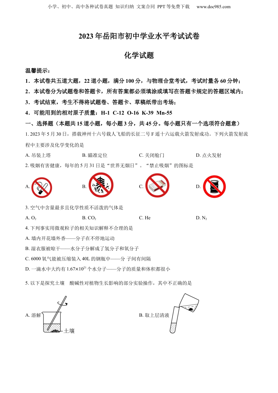 小学、初中、高中各种试卷真题知识归纳文案合同PPT等免费下载www.doc985.com2023年岳阳市初中学业水平考试试卷化学试题温馨提示:1.本试卷共五道大题,22道小题,满分100分,与物理合堂考试,考试时量各60分钟;2.本试卷分为试题卷和答题卡,所有答案都必须填涂或填写在答题卡规定的答题区域内;3.考试结束,考生不得将试题卷、答题卡、草稿纸带出考场;4.可能用到的相对原子质量:H-1C-12O-16K-39Mn-55一、选择题(本题共15道小题,每小题3分,共45分。每小题只有一个选项符合题意)1.2023年5月30日,搭载神州十六号载人飞船的长征二号F遥十六运载火箭发射成功。下列火箭发射流程中主要涉及化学变化的是A.吊装上塔B.瞄准定位C.关闭舱门D.点火发射2.吸姻有害健康,每年的5月31日是“世界无烟日”。“禁止吸烟”的图标是A.B.C.D.3.空气中含量最多且化学性质不活泼的气体是A.O2B.CO2C.HeD.N24.下列事实用微观粒子的相关知识解释不合理的是A.墙内开花墙外香——分子在不停地运动B.湿衣服被晾干——水分子分解成了氢分子和氧分子C.6000氧气能被压缩装入40L的钢瓶中——分子间有间隔D.一滴水中大约有1.67×1021个水分子——分子的质量和体积都很小5.以下是探究土壤的酸碱性对植物生长影响的部分实验操作,其中不正确的是A.溶解B.取上层清液小学、初中、高中各种试卷真题知识归纳文案合同PPT等免费下载www.doc985.comC.测酸碱性D.测pH6.物质的性质很大程度上决定了物质的用途,下列对应关系不正确的是选项物质性质用途A稀有气体在通电时能发出不同颜色的光制作霓虹灯B活性炭吸附性作冰箱除味剂C熟石灰碱性改良酸性土壤D一氧化碳有毒冶炼金属A.AB.BC.CD.D7.下图是氢气在氯气中燃烧生成氯化氢的微观示意图。下列有关该反应的说法正确的是A.反应前后原子的种类没有改变B.反应前后分子的种类没有改变C.反应前后氢元素的化合价没有改变D.反应的化学方程式为H2+Cl2HCl8.化学是推动人类社会可持续发展的重要力量,在解决与资源、能源、材料、环境等相关问题中起重要作用,下列有关说法不正确的是A.农业上改漫灌为喷灌或滴灌,有利于保护水资源B.煤、石油、天然气属于不可再生能源C.合金属于合成材料D.开发利用可降解塑料,可减少“白色污染”小学、初中、高中各种试卷真题知识归纳文案合同PPT等免费下载www.doc985.com9.实验是科学探究的重要手段,下列实验不能达到目的的是A.测定空气中氧气的含量B.探究燃烧需要氧气C.验证质量守恒定律D.探究石墨的导电性10.没食子酸(化学式为C6H7O5)是世界上最早制得的有机酸,中医常用其治疗流感。明代李梃的《医学入门》中记载了制取没食子酸的方法。下列有关没食子酸的描述正确的是A.没食子酸由碳、氢、氧三种元素组成B.没食子酸属于氧化物C.没食子酸中碳、氢、氧元素的质量比为6:7:5D.没食子酸中氧元素的质量分数最小11.甲、乙两种物质的溶解度曲线如图所示。下列分析正确的是小学、初中、高中各种试卷真题知识归纳文案合同PPT等免费下载www.doc985.comA.t1℃时,甲的溶解度大于乙的溶解度B.t2℃时,甲溶液的溶质质量分数比乙的大C.t2℃时,欲配制100g甲的饱和溶液,需要甲的质量为60gD.甲中混有少量乙时,可用冷却热的饱和溶液的方法提纯甲12.推理是化学学习的一种常用思维方法。下列推理正确的是A.分子能构成物质,所以物质都是由分子构成B.离子是带电的微观粒子,所以带电的微观粒子都是离子C.由同种元素组成的纯净物是单质,所以单质只含有一种元素D.碳酸钙能与稀盐酸反应生成气体,所以与稀盐酸反应产生气体的物质一定是碳酸钙13.对物质的鉴别和分离提纯是化学学习的重要部分,下列实验设计不能达到实验目的的是选项实验目的实验设计A鉴别NH4NO3固体和NaOH固体加水B鉴别真黄金和假黄金(铜锌合金)加稀硫酸C除去铜粉中含有的少量CuO通入氧气加热D除去CO2中混有的少量O2将气体通过灼热的铜网A.AB.BC.CD.D14.下列图像能正确反映其对应关系的是A.向NaOH溶液中不断加水B.向稀盐酸与CuCl2的混合溶液中滴加NaOH溶液小学、初中、高中各种试卷真题知识归纳文案合同PPT等免费下载www.doc985.comC.电解水实验D.向MnO2固体粉末中不断加入H2O2溶液15.甲、...