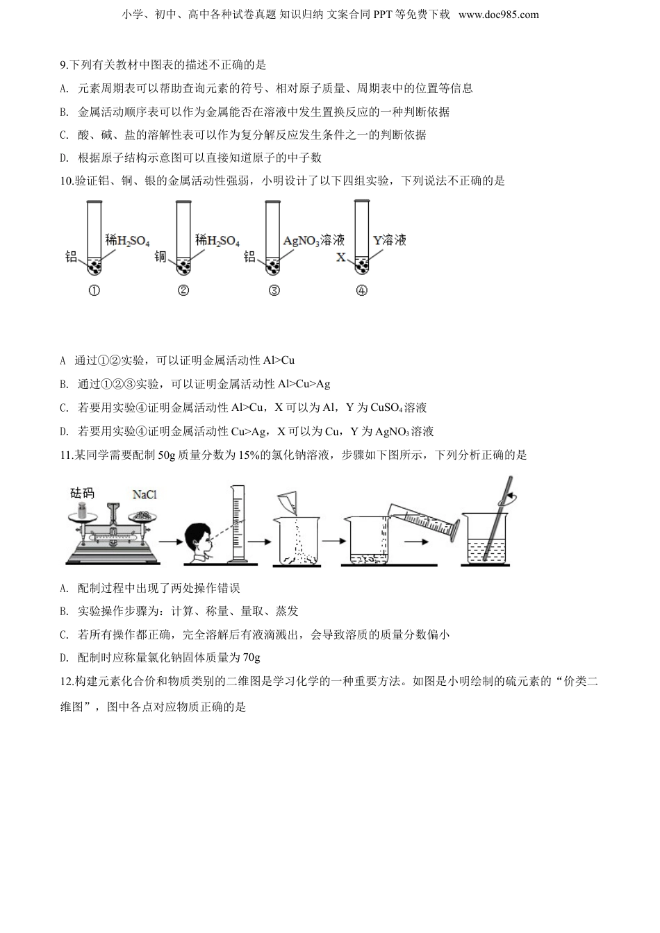 小学、初中、高中各种试卷真题知识归纳文案合同PPT等免费下载www.doc985.com湖南省岳阳市2020年中考化学试题可能用到的相对原子质量:H-1C-12N-14O-16Na-23S-32C-35.5Fe-56一、选择题(每小题只有一个选项符合题意。本题共15道小题,每小题3分,共45分)1.美丽生活劳动创造,小明喜爱劳动,做下列家务劳动时涉及到化学变化的是A.对垃圾进行分类B.用自来水淘米C.用清水擦洗家具D.用醋清洗水垢2.空气是一种宝贵的资源,有关空气成分的描述正确的是A.氧气:可以做保护气B.氮气:空气中体积分数最大的气体C.二氧化碳:空气中的一种污染物D.稀有气体:化学性质不稳定3.如图中和分别表示不同元素的原子,根据图示推断,该反应属于A.化合反应B.分解反应C.置换反应D.复分解反应4.疫情期间,小明在家用酒精进行消毒时,可闻到一股气味,说明了A.分子是由原子构成的B.分子之间有间隔C.分子是不断运动的D.原子是化学变化中的最小粒子5.野炊时,小明发现火焰很小,他将木柴架空一些后火焰变大,架空的目的是A.增大木柴与空气的接触面积B.升高木柴的温度小学、初中、高中各种试卷真题知识归纳文案合同PPT等免费下载www.doc985.comC.降低木柴的着火点D.便于观察火焰的大小6.化学实验中经常用到玻璃棒,下列有关玻璃棒用途的描述不正确的是A.溶解时,搅拌加速溶解B.过滤时,引流C.蒸发时,转移固体D.测酸碱度时,取用少量液体药品7.下列有关实验现象描述正确的是A.铁片加入稀盐酸中,产生气泡,溶液变成黄色B.铁丝在氧气中剧烈燃烧,火星四射,生成黑色固体C.向氢氧化钠溶液中滴加硫酸铜溶液,出现红色固体D.硫在氧气中燃烧,发出蓝紫色火焰,生成二氧化硫气体8.北斗“收官之星”于6月23日成功发射,比原定计划推迟7天的原因是控制液氧流量的稳压器出现故障,火箭推进剂中的燃料出现变化,螺栓出现轻微腐蚀。下列说法正确的是A.液氧是一种化合物,推进器利用它的助燃性支持燃料充分燃烧B.N2H4常作为火箭推进剂的燃料,N2H4中氮、氢元素质量比为1∶2C.金属螺栓腐蚀的原因是与空气中的氧气、水蒸气等发生了化学反应D.制造火箭常用到的钛合金是一种合成材料小学、初中、高中各种试卷真题知识归纳文案合同PPT等免费下载www.doc985.com9.下列有关教材中图表的描述不正确的是A.元素周期表可以帮助查询元素的符号、相对原子质量、周期表中的位置等信息B.金属活动顺序表可以作为金属能否在溶液中发生置换反应的一种判断依据C.酸、碱、盐的溶解性表可以作为复分解反应发生条件之一的判断依据D.根据原子结构示意图可以直接知道原子的中子数10.验证铝、铜、银的金属活动性强弱,小明设计了以下四组实验,下列说法不正确的是A.通过①②实验,可以证明金属活动性Al>CuB.通过①②③实验,可以证明金属活动性Al>Cu>AgC.若要用实验④证明金属活动性Al>Cu,X可以为Al,Y为CuSO4溶液D.若要用实验④证明金属活动性Cu>Ag,X可以为Cu,Y为AgNO3溶液11.某同学需要配制50g质量分数为15%的氯化钠溶液,步骤如下图所示,下列分析正确的是A.配制过程中出现了两处操作错误B.实验操作步骤为:计算、称量、量取、蒸发C.若所有操作都正确,完全溶解后有液滴溅出,会导致溶质的质量分数偏小D.配制时应称量氯化钠固体质量为70g12.构建元素化合价和物质类别的二维图是学习化学的一种重要方法。如图是小明绘制的硫元素的“价类二维图”,图中各点对应物质正确的是小学、初中、高中各种试卷真题知识归纳文案合同PPT等免费下载www.doc985.comA.SO2B.SO3C.H2SO4D.Na2SO413.下列实验操作能达到实验目的的是选项实验目的实验操作A将硬水软化沉淀、过滤、吸附B鉴别NaCl、NaOH、NH4NO3固体加水溶解C粗盐中难溶性杂质的去除溶解、加AgNO3溶液沉淀、过滤D鉴别CO2和HC1气体将气体通入石蕊溶液中、观察现象A.AB.BC.CD.D14.下列图像能正确反映其对应变化关系的是A.图①:蜡烛在装满空气的密闭容器中燃烧,CO2体积分数的变化B.图②:向等质量,等浓度的盐酸中不断加入Na2CO3和NaHCO3溶液,产生气体质量的变化C.图③:在高温下,向Fe2O3固体中通入CO,固体质量的变化小学、初中、高中各种试卷真题知识归纳文案合同PPT等免费下载www.doc985.comD.图④...