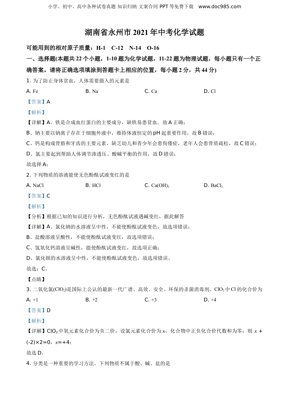 小学、初中、高中各种试卷真题知识归纳文案合同PPT等免费下载www.doc985.com湖南省永州市2021年中考化学试题可能用到的相对原子质量:H-1C-12N-14O-16一、选择题(本题共22个小题,1-10题为化学试题,11-22题为物理试题,每小题只有一个正确答案。请将正确选项填涂到答题卡上相应的位置,每小题2分,共44分)1.为了防止身体贫血,人体需要摄入的元素是A.FeB.NaC.CaD.Cl【答案】A【解析】【详解】A、铁是合成血红蛋白的主要成分,缺铁易患贫血.故A正确;B、钠主要以钠离子存在于细胞外液中,维持体液恒定的pH起重要作用,故B错误;C、钙是构成骨胳和牙齿的主要元素,缺乏幼儿和青少年会患佝偻症,老年人会患骨质疏松,故C错误;D、氯主要起到帮助人体调节渗透压、酸碱平衡的作用,故D错误;故选择A;2.下列物质的溶液能使无色酚酞试液变红的是A.NaClB.HClC.Ca(OH)2D.BaCl2【答案】C【解析】【分析】根据已知的知识进行分析,无色酚酞试液遇碱变红,据此解答【详解】A、氯化钠的水溶液呈中性,不能使酚酞试液变色,故选项错误;B、盐酸溶液呈酸性,不能使酚酞试液变红,故选项错误;C、氢氧化钙溶液呈碱性,能使酚酞试液变红,故选项正确;D、氯化钡的水溶液呈中性,不能使酚酞试液变色,故选项错误。故选:C。【点睛】3.二氧化氯(ClO2)是国际上公认的最新一代广谱、高效、安全、环保的杀菌消毒剂。ClO2中Cl的化合价为A.+1B.+2C.+3D.+4【答案】D【解析】【详解】ClO2中氧元素化合价为负二价,设氯元素化合价为x,化合物中正负化合价代数和为零;则x+(-2)×2=0,x=+4;故选D。4.分类是一种重要的学习方法,下列物质不属于酸、碱、盐的是小学、初中、高中各种试卷真题知识归纳文案合同PPT等免费下载www.doc985.comA.SO2B.Na2CO3C.H2SO4D.Ba(OH)2【答案】A【解析】【分析】酸是电离出的阳离子全是氢离子的化合物,碱是电离出的阴离子全是氢氧根的化合物,盐是由酸根离子和金属离子或铵根离子组成的化合物;【详解】根据分析,SO2不属于酸、碱、盐,Na2CO3是盐,H2SO4是酸,Ba(OH)2是碱;故选择A;5.下列实验操作正确的是A.稀释浓硫酸B.排水法收集O2C.检查气密性D.倾倒CO2【答案】B【解析】【详解】A、稀释浓硫酸必须把浓硫酸倒入水中,错误;B、氧气不易溶于水,可以排水法收集O2,正确;C、检查装置的气密性的方法是将仪器连接好后,将玻璃导管的一端放入水中,用双手握住试管,观察是否有气泡冒出,如有气泡冒出,则气密性良好,错误;D、二氧化碳密度大于空气,不燃烧也不支持燃烧;在做阶梯蜡烛实验时,应将二氧化碳从低的蜡烛一侧沿器壁慢慢倒入,错误。故选B。6.“绿水青山就是金山银山”,保护永州生态环境,人人有责,下列有关做法不正确的是A.工业废水应处理达标后排放B.根据作物、虫害和农药的特点按规定施用农药C.将废旧电池及时就地用土填埋D.政府要求超市、商场和集贸市场不得免费提供塑料购物袋【答案】C【解析】小学、初中、高中各种试卷真题知识归纳文案合同PPT等免费下载www.doc985.com【分析】根据造成环境污染的原因以及防止环境污染的措施来分析。【详解】A.、工业废水应处理达标后排放,可减少水体污染,利于保护环境,故选项正确;B、根据作物、虫害和农药的特点按规定施用农药,减少农药的使用,利于保护环境,故选项正确;C、废旧电池就地用土填埋会造成土壤污染和水体污染,不利于环境保护,故选项错误;工业废水未经处理,随意排放会造成水体污染,不利于环境保护,故选项错误;D、政府要求超市、商场和集贸市场不得免费提供塑料购物袋,能减少白色污染,利于保护环境,故选项正确。故选:C。7.工业法生产硝酸的一个中间反应可用微观模型表示如下,下列说法正确的是A.该反应前后分子的数目无变化B.该反应前后元素种类没有变化C.该反应过程中氧气分子全部参与了反应D.该反应的化学方程式可表示为:【答案】B【解析】【分析】由图示可知,一氧化氮和氧气反应生成二氧化氮,反应为;【详解】由分析得:A.该反应前后分子的数目发生改变,错误;B.该反应前后元素种类没有变化,正确;C.该反应过程中氧气分子没有全部参与反应,错误D.该反应的化学方程式可表示为:,...