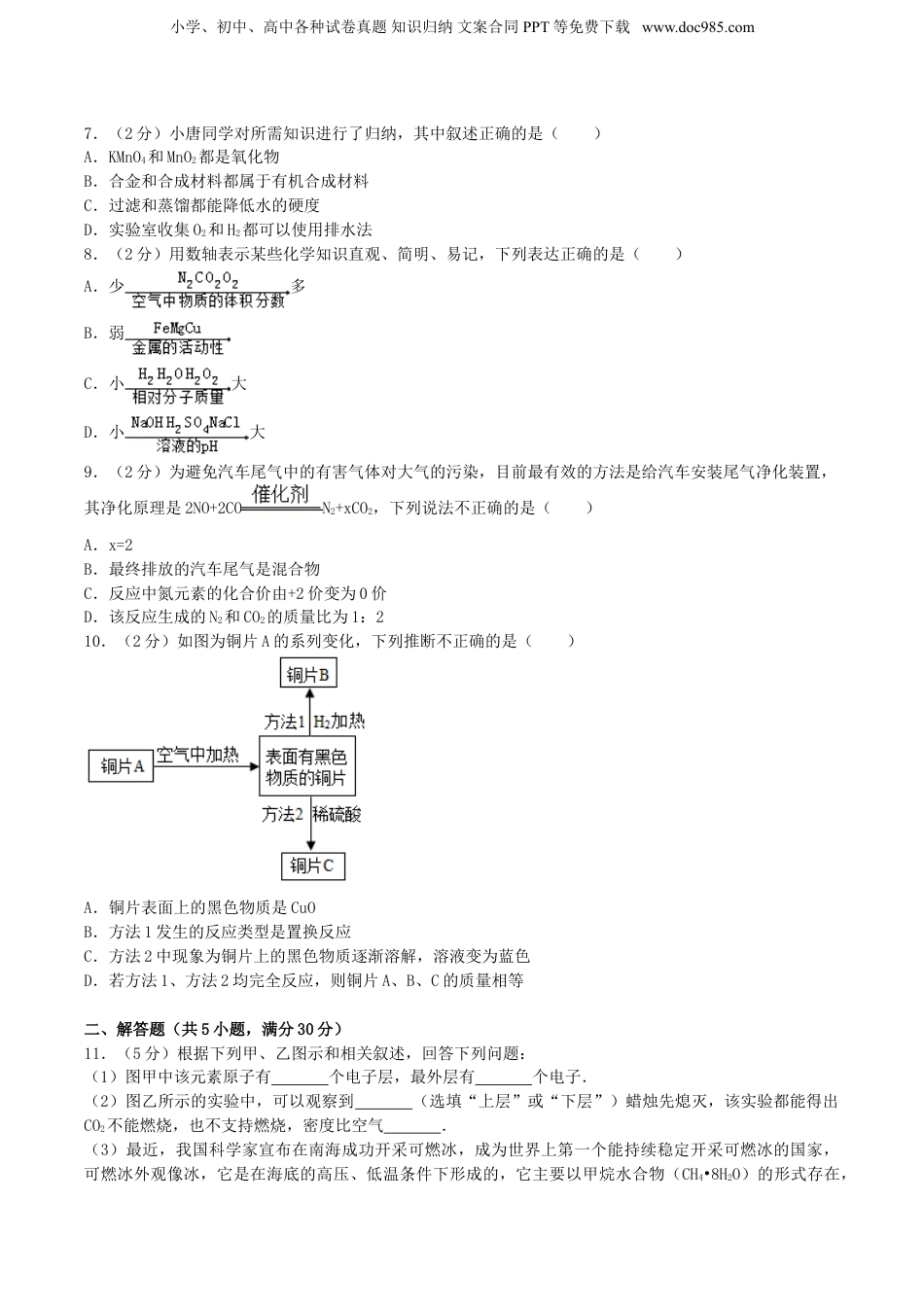 小学、初中、高中各种试卷真题知识归纳文案合同PPT等免费下载www.doc985.com2017年湖南省永州市中考化学真题及答案一、选择题(共10小题,每小题2分,满分20分)1.(2分)从物质变化的角度分析,下列典故主要体现化学变化的是()A.火烧赤壁B.凿壁偷光C.悬梁刺股D.刻舟求剑2.(2分)下列实验操作不会引起安全事故的是()A.点燃酒精灯B.移走蒸发皿C.闻气味D.浓硫酸稀释3.(2分)下列化学用语书写正确的是()A.干冰﹣﹣CO2B.镁离子﹣﹣C.2个氮分子﹣﹣2ND.﹣2价的硫元素S2﹣4.(2分)1滴水中大约有1.67×1021个水分子,这是因为()A.分子间有间隔B.分子的质量和体积都很小C.分子可分为原子D.分子在不断地运动5.(2分)化学在环境保护、资源核能源利用等方面起着重要的作用.下列说法不正确的是()A.涂油和刷油漆能防止钢铁生锈B.使用可降解塑料可以减少“白色污染”C.PM2.5专用口罩中使用了活性炭,是利用了活性炭的吸附性D.目前计入空气污染指数的有害气体主要包括:SO2、CO、NO2、O2等6.(2分)1828年,德国化学家维勒通过蒸发氰酸铵(NH4CNO)水溶液得到了尿素[CO(NH2)2],尿素[CO(NH2)2]属于()A.复合肥料B.氮肥C.磷肥D.钾肥小学、初中、高中各种试卷真题知识归纳文案合同PPT等免费下载www.doc985.com7.(2分)小唐同学对所需知识进行了归纳,其中叙述正确的是()A.KMnO4和MnO2都是氧化物B.合金和合成材料都属于有机合成材料C.过滤和蒸馏都能降低水的硬度D.实验室收集O2和H2都可以使用排水法8.(2分)用数轴表示某些化学知识直观、简明、易记,下列表达正确的是()A.少多B.弱C.小大D.小大9.(2分)为避免汽车尾气中的有害气体对大气的污染,目前最有效的方法是给汽车安装尾气净化装置,其净化原理是2NO+2CON2+xCO2,下列说法不正确的是()A.x=2B.最终排放的汽车尾气是混合物C.反应中氮元素的化合价由+2价变为0价D.该反应生成的N2和CO2的质量比为1:210.(2分)如图为铜片A的系列变化,下列推断不正确的是()A.铜片表面上的黑色物质是CuOB.方法1发生的反应类型是置换反应C.方法2中现象为铜片上的黑色物质逐渐溶解,溶液变为蓝色D.若方法1、方法2均完全反应,则铜片A、B、C的质量相等二、解答题(共5小题,满分30分)11.(5分)根据下列甲、乙图示和相关叙述,回答下列问题:(1)图甲中该元素原子有个电子层,最外层有个电子.(2)图乙所示的实验中,可以观察到(选填“上层”或“下层”)蜡烛先熄灭,该实验都能得出CO2不能燃烧,也不支持燃烧,密度比空气.(3)最近,我国科学家宣布在南海成功开采可燃冰,成为世界上第一个能持续稳定开采可燃冰的国家,可燃冰外观像冰,它是在海底的高压、低温条件下形成的,它主要以甲烷水合物(CH4•8H2O)的形式存在,小学、初中、高中各种试卷真题知识归纳文案合同PPT等免费下载www.doc985.com其中它的主要可燃成分是(填化学式)12.(5分)分析处理图表中的信息是学习化学的一种重要方法,如表是NH4Cl和KNO3在不同温度时的溶解度数据:温度/℃10305070溶解度/gNH4Cl33.341.450.455.2KNO320.945.885.5110根据上述数据,回答下列问题:(1)从上表可知,50℃时,NH4Cl的溶解度为g.(2)NH4Cl和KNO3的溶解度受温度影响比较大的物质是(填化学式).(3)欲配制质量分数为10%的KNO3溶液,需要的玻璃仪器有烧杯、量筒、胶头滴管和.(4)烧杯中A中是60℃时,含有100g水的NH4Cl不饱和溶液,经过如图1的变化过程(在整个过程中,不考虑水分的蒸发),则C烧杯中溶液的质量为g.(5)某同学欲验证NH4Cl固体溶于水时吸收热量,设计如图2实验,通过观察到现象得以验证.A.a端液面高于b端液面B.a端液面低于b端液面.13.(8分)如图为教材中实验室模拟炼铁的实验改进装置(部分夹持仪器略去).实验步骤如下:Ⅰ.连接好装置,并检查装置的气密性;Ⅱ.装好药品,先通一会儿CO,再点燃酒精喷灯;Ⅲ.实验结束,先撤去酒精喷灯,继续通CO直至玻璃管冷却:回答下列问题:(1)实验中可看到A处玻璃管里的粉末由红色逐渐变黑,说明Fe2O3转化为(填化学式),B瓶中澄清石灰水变浑浊...