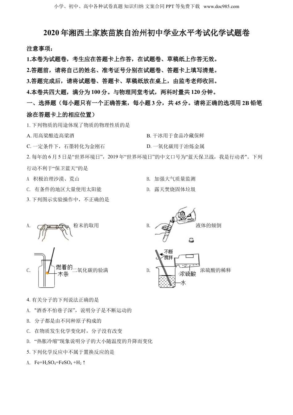 小学、初中、高中各种试卷真题知识归纳文案合同PPT等免费下载www.doc985.com2020年湘西土家族苗族自治州初中学业水平考试化学试题卷注意事项:1.本卷为试题卷,考生应在答题卡上作答,在试题卷、草稿纸上作答无效。2.答题前,请将自己的姓名、准考证号分别在试题卷、答题卡上填写清楚。3.答题完成后,请将试题卷、答题卡、草稿纸放在桌上,由监考老师收回。4.本卷共四大题,满分为100分。与物理同堂考试,两科时量共120分钟。一、选择题(每小题只有一个正确答案,每小题3分,共45分。请将正确的选项用2B铅笔涂在答题卡上的相应位置)1.下列物质的用途体现了物质的物理性质的是A.用高梁酿造高梁酒B.干冰用于食品冷藏保鲜C.一定条件下,石墨转化为金刚石D.一氧化碳用于冶炼金属2.每年的6月5日是“世界环境日”,2019年“世界环境日”的中文口号为“蓝天保卫战,我是行动者"。下列行动不利于“保卫蓝天”的是A.积极治理沙漠、荒山B.加强大气质量监测C.有条件的地区大量使用太阳能D.露天焚烧固体垃圾3.下列图示实验操作中,不正确的是A.粉末的取用B.液体的倾倒C.二氧化碳的验满D.浓硫酸的稀释4.有关分子的下列说法正确的是A."酒香不怕巷子深”,说明分子是不断运动的B.分子都是由不同种原子构成的C.在物质发生化学变化时,分子没有改变D.“热胀冷缩”现象说明分子的大小随温度的升降而变化5.下列化学反应中不属于置换反应的是A.Fe+H2SO4=FeSO4+H2↑小学、初中、高中各种试卷真题知识归纳文案合同PPT等免费下载www.doc985.comB.CO+CuOCu+CO2C.Cl2+2NaI=2NaCl+I2D.Fe+CuSO4=FeSO4+Cu6.煤中含有少量的硫元素,在煤中加入X可有效防止煤燃烧时生成的SO2对大气造成污染,发生反应的化学方程式是2X+2SO2+O2=2CaSO4+2CO2,则X的化学式是A.CaOB.Na2CO3C.Ca(HCO3)2D.CaCO37.下列关于CO2、CO的说法不正确的是A.CO是许多气体燃料(如水煤气)的主要成分B.冬天用煤火取暖时,在媒炉上放一壶水不能防止CO中毒C.CO2无毒,当空气中的CO2超过正常含量时,不会对人体健康产生影响D.大气中的CO2能起到对地球保温的作用8.你认为下列灭火的措施或行为错误的是A.电烤炉着火时,用水浇灭B.炒菜时油锅着火,用锅盖盖灭C.堆放杂物的纸箱着火时,用水浇灭D.不慎碰倒酒精灯,洒出的酒精在桌上燃烧起来,立即用湿抹布扑盖9.建国以来,中国航运经济取得迅猛发展,现在已成为航运大国,正向航运强国迈进。为保证船舶的使用寿命,船舶要进行防锈处理,下列防锈措施不可行的是A.刷防锈漆B.用抗锈蚀性能优异的合金制造船舶的零部件C.给某些部位涂油D.船体表面镀一层黄金10.关于溶液,下列说法正确的是A.将20毫升汽油放入烧杯中,加50毫升水搅拌,得到溶液B.溶液中的溶质可以是气体、液体和固体C.凡是均一的、稳定的液体一定是溶液D.氢氧化钠溶于水形成溶液时,温度下降11.将甲、乙两种金属片分别放入CuSO4溶液中,甲表面析出金属Cu,乙表面没有发生反应,据此判断,三种金属的活动性顺序是()A.甲>铜>乙B.铜>甲>乙C.乙>铜>甲D.甲>乙>铜12.人类为了维持生命和健康,必须摄取食物。吸食下列物品有害人体健康的是小学、初中、高中各种试卷真题知识归纳文案合同PPT等免费下载www.doc985.comA."芙蓉”牌香烟B.“鲁花”牌花生油C.湘西红心猕猴桃D.“雀巢”牌奶粉13.下列关于酸、碱的说法错误的是A.苛性钠、烧碱、火碱都是氢氧化钠B.氢氧化钙可以用来改良酸性土壤C.稀盐酸能够使酚酞溶液变红D.生活中许多常见的物质(如柠檬、柑橘)中含有酸14.能将硝酸银、碳酸钠、氯化钾三种溶液鉴别出来的试剂是A.铜丝B.硝酸钠的溶液C.稀盐酸D.氢氧化钠溶液15.下列除去杂质所选用的方法正确的是选项物质杂质除杂方法ACO2CO点燃BBaSO4Na2SO4固体加足量水搅拌,过滤,洗涤,干燥CKOH溶液K2CO3加过量稀盐酸D银粉锌粉加过量硫酸铜溶液,过滤,洗涤。干燥A.AB.BC.CD.D二、填空题(本大题共6小题,每空2分,共36分)16.写出符合下列要求的化学符号(1)氮气_______。(2)2个氢氧根离子________。17.某元素的原子结构示意图为(1)x=______。(2)该元素的名称是__________。(3)该元素的单质与氯气反应生成化合物的化学式为___。18.甲、...