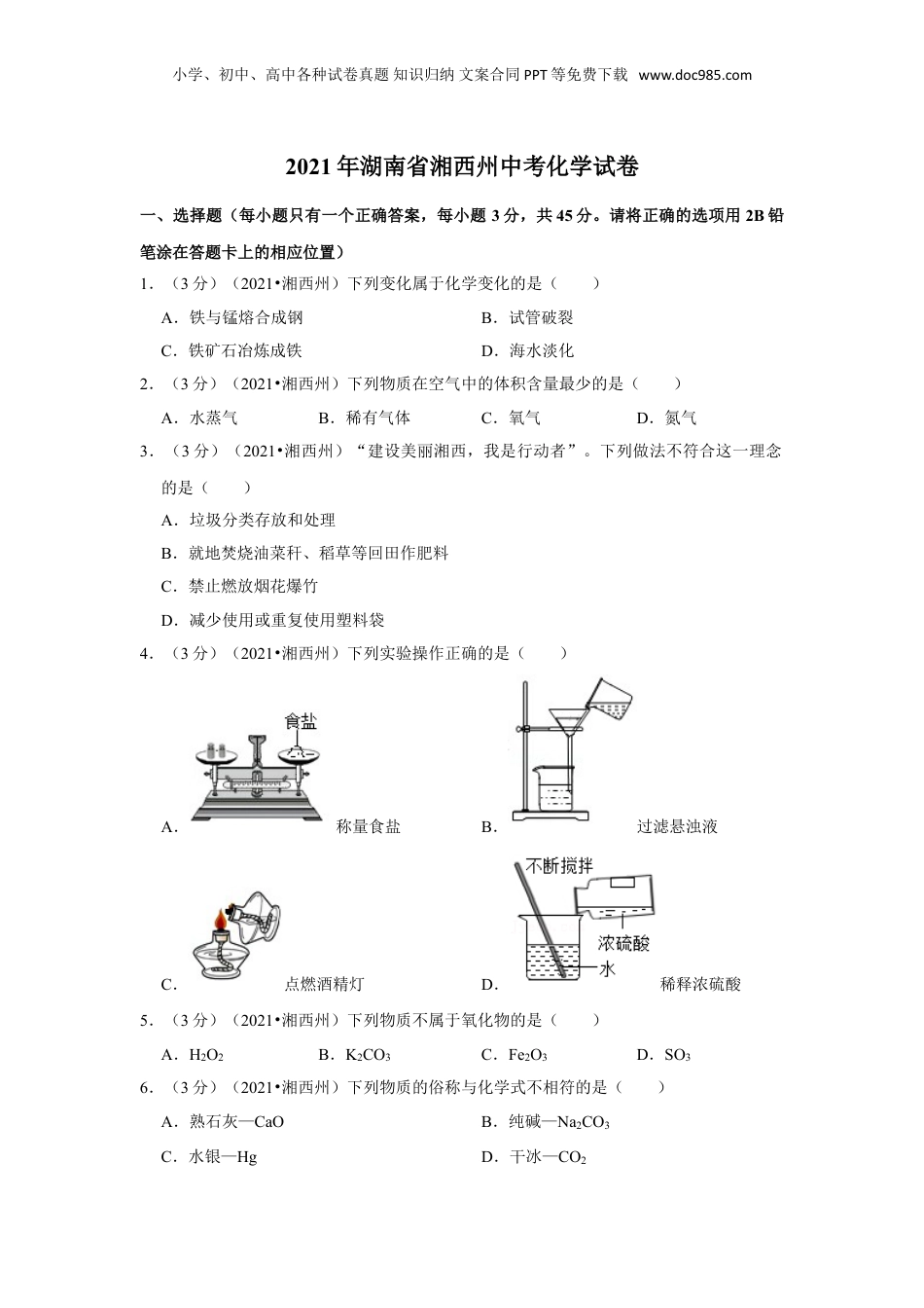 小学、初中、高中各种试卷真题知识归纳文案合同PPT等免费下载www.doc985.com2021年湖南省湘西州中考化学试卷一、选择题(每小题只有一个正确答案,每小题3分,共45分。请将正确的选项用2B铅笔涂在答题卡上的相应位置)1.(3分)(2021•湘西州)下列变化属于化学变化的是()A.铁与锰熔合成钢B.试管破裂C.铁矿石冶炼成铁D.海水淡化2.(3分)(2021•湘西州)下列物质在空气中的体积含量最少的是()A.水蒸气B.稀有气体C.氧气D.氮气3.(3分)(2021•湘西州)“建设美丽湘西,我是行动者”。下列做法不符合这一理念的是()A.垃圾分类存放和处理B.就地焚烧油菜秆、稻草等回田作肥料C.禁止燃放烟花爆竹D.减少使用或重复使用塑料袋4.(3分)(2021•湘西州)下列实验操作正确的是()A.称量食盐B.过滤悬浊液C.点燃酒精灯D.稀释浓硫酸5.(3分)(2021•湘西州)下列物质不属于氧化物的是()A.H2O2B.K2CO3C.Fe2O3D.SO36.(3分)(2021•湘西州)下列物质的俗称与化学式不相符的是()A.熟石灰—CaOB.纯碱—Na2CO3C.水银—HgD.干冰—CO2小学、初中、高中各种试卷真题知识归纳文案合同PPT等免费下载www.doc985.com7.(3分)(2021•湘西州)用于防控新型冠状病毒肺炎的“84”消毒剂的有效成分是次氯酸钠﹣﹣NaClO,则次氯酸钠中“Cl”元素的化合价是()A.﹣1价B.0价C.+1价D.+5价8.(3分)(2021•湘西州)下列关于分子的描述正确的是()A.“热胀冷缩”现象是物质的分子大小随温度变化而变化B.同种分子在不同环境和状态下化学性质不同C.分子都是由原子构成的D.气体和液体物质的分子在不断运动,而固体物质的分子是静止不动的9.(3分)(2021•湘西州)治疗虐疾的特效药一青蒿素的化学式为:C15H22O5。下列关于青蒿素的说法错误的是()A.青蒿素是由碳、氢、氧三种元素组成的有机化合物B.青蒿素中含有22个氢原子C.青蒿素中碳、氢、氧三种元素的质量比为90:11:40D.每个青蒿素分子由42个原子构成10.(3分)(2021•湘西州)下列化学反应(反应条件已省略)不属于置换反应的是()A.2KI+Cl2═I2+2KClB.Fe+CuSO4═FeSO4+CuC.CuO+CO═Cu+CO2D.Zn+H2SO4═ZnSO4+H2↑11.(3分)(2021•湘西州)锌与浓硝酸反应的化学方程式为:Zn+4HNO3(浓)═Zn(NO3)2+2H2O+2X↑。则X的化学式为()A.H2B.N2C.NOD.NO212.(3分)(2021•湘西州)水稻产量大幅提升主要归功于我国袁隆平院士的“杂交水稻”的问世。当然也少不了农药、化肥的保障。下列四种化肥,不属于复合肥的是()A.NH4HCO3B.NH4H2PO4C.KNO3D.KH2PO413.(3分)(2021•湘西州)某保健品广告语“钙、铁、锌、硒﹣﹣黄金搭档”中的四种元素,属于人体所需的常量元素,若缺少会引起佝偻病的是()A.钙B.铁C.锌D.硒14.(3分)(2021•湘西州)将X、Y、Z三种金属放入稀硫酸中,发现Y表面有大量气泡产生,再将X、Z两种金属放入硝酸银溶液中,Z表面有银白色固体析出,X无明显小学、初中、高中各种试卷真题知识归纳文案合同PPT等免费下载www.doc985.com现象,由此可知三种金属活动性由强到弱的顺序为()A.X>Z>YB.Y>X>ZC.Z>Y>XD.Y>Z>X15.(3分)(2021•湘西州)晾晒海水获得的粗盐中含有可溶性杂质MgCl2、CaCl2等。现要除去粗盐溶液中的MgCl2和CaCl2,需先依次加入足量的a和b,过滤后再加c。则a、b、c分别是()A.Na2CO3、稀盐酸、NaOHB.K2CO3、NaOH、稀盐酸C.NaOH、Na2CO3、稀盐酸D.KOH、稀盐酸、Na2CO3二、填空题(每空2分,共30分。把答案填写在答题卡上相应题号的空格上)16.(6分)(2021•湘西州)写出符合下列要求的化学符号。(1)3个铝原子。(2)2个氢离子。(3)1个最简单的有机化合物分子。17.(6分)(2021•湘西州)某原子的结构示意图为:,根据该原子结构示意图回答下列问题:(1)该原子的元素在分类中属于元素(填“金属”“非金属”“稀有气体”)。(2)该原子在化学反应中容易得到电子变成离子(填“阳”或“阴”),其离子的结构示意图为。18.(6分)(2021•湘西州)A、B、C三种物质的溶解度曲线如图所示。请完成下列问题:(1)2...