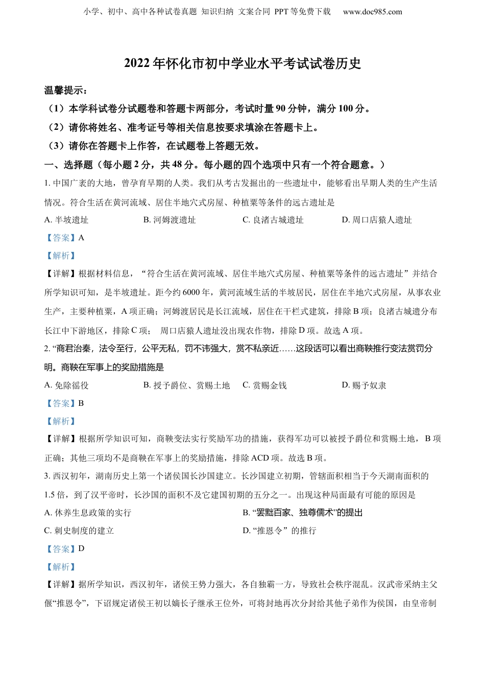 小学、初中、高中各种试卷真题知识归纳文案合同PPT等免费下载www.doc985.com2022年怀化市初中学业水平考试试卷历史温馨提示:(1)本学科试卷分试题卷和答题卡两部分,考试时量90分钟,满分100分。(2)请你将姓名、准考证号等相关信息按要求填涂在答题卡上。(3)请你在答题卡上作答,在试题卷上答题无效。一、选择题(每小题2分,共48分。每小题的四个选项中只有一个符合题意。)1.中国广袤的大地,曾孕育早期的人类。我们从考古发掘出的一些遗址中,能够看出早期人类的生产生活情况。符合生活在黄河流域、居住半地穴式房屋、种植粟等条件的远古遗址是A.半坡遗址B.河姆渡遗址C.良渚古城遗址D.周口店猿人遗址【答案】A【解析】【详解】根据材料信息,“符合生活在黄河流域、居住半地穴式房屋、种植粟等条件的远古遗址”并结合所学知识可知,是半坡遗址。距今约6000年,黄河流域生活的半坡居民,居住在半地穴式房屋,从事农业生产,主要种植粟,A项正确;河姆渡居民是长江流域,居住在干栏式建筑,排除B项;良渚古城遗分布长江中下游地区,排除C项;周口店猿人遗址没出现农作物,排除D项。故选A项。2.“……商君治秦,法令至行,公平无私,罚不讳强大,赏不私亲近这段话可以看出商鞅推行变法赏罚分明。商鞅在军事上的奖励措施是A.免除徭役B.授予爵位、赏赐土地C.赏赐金钱D.赐予奴隶【答案】B【解析】【详解】根据所学知识可知,商鞅变法实行奖励军功的措施,获得军功可以被授予爵位和赏赐土地,B项正确;其他三项均不是商鞅在军事上的奖励措施,排除ACD项。故选B项。3.西汉初年,湖南历史上第一个诸侯国长沙国建立。长沙国建立初期,管辖面积相当于今天湖南面积的1.5倍,到了汉平帝时,长沙国的面积不及它建国初期的五分之一。出现这种局面最有可能的原因是A.休养生息政策的实行B.“”罢黜百家、独尊儒术的提出C.刺史制度的建立D.“推恩令”的推行【答案】D【解析】【详解】据所学知识,西汉初年,诸侯王势力强大,各自独霸一方,导致社会秩序混乱。汉武帝采纳主父偃“推恩令”,下诏规定诸侯王初以嫡长子继承王位外,可将封地再次分封给其他子弟作为侯国,由皇帝制小学、初中、高中各种试卷真题知识归纳文案合同PPT等免费下载www.doc985.com定封号。这样诸侯国越来越多,诸侯王的封地和势力越来越小,分析题干,西汉初年,湖南历史上第一个诸侯国长沙国建立。长沙国建立初期,管辖面积相当于今天湖南面积的1.5倍,到了汉平帝时,长沙国的面积不及它建国初期的五分之一,可以得出是“推恩令”的推行,D项正确;汉高祖吸取秦朝因暴政导致速亡的教训,采取了休养生息政策,排除A项;“罢黜百家、独尊儒术”的提出,确立儒家学说的正统地位,排除B项;刺史制度是朝廷监视州部内的地方官吏、豪强及其子弟,严禁他们为非作歹,排除C项。故选D项。4.曹操的诗句“白骨露于野,千里无鸡鸣。生民百遗一,念之断人肠”记录了战争给社会带来的巨大灾难。东汉末年,曹操为统一北方打下基础的战役是A.赤壁之战B.淝水之战C.官渡之战D.郾城大捷【答案】C【解析】【详解】根据所学知识,200年曹操在官渡之战中以少胜多,打败袁绍,为统一北方打下基础,C项正确;赤壁之战为三国鼎立局面形成奠定基础,排除A项;淝水之战是中国历史上著名的以少胜多的战例,拥有绝对优势的前秦败给了东晋,排除B项;郾城大捷是指岳飞指挥岳家军将士以少胜多,在平原旷野地区大败完颜宗弼(兀术)所统率的金国女真军队主力,取得郾城大捷,排除D项。故选C项。5.中国的书法艺术是中华文化中的瑰宝。唐朝在书法艺术方面建树颇丰。下列书法家中都属于唐代名家的一组是A.钟繇、胡昭B.颜真卿、柳公权C.王羲之、怀素D.赵孟頰、欧阳询【答案】B【解析】【详解】根据所学知识,唐代的书法家有欧阳询、颜真卿、柳公权、诸遂良。继王羲之后,我国书法史上最有成就的大书法家是颜真卿,自创“颜体”,其楷书结构方正茂密,笔画横轻竖重,笔力雄强圆滑,气势庄严雄浑;柳公权博采众长,别出心裁,自成“柳体”,他的字方折俊丽、骨力劲力,后人把柳书和颜书并成为“颜筋柳骨”,B项正确;钟繇、胡昭是三国魏初时期,二人皆以工书擅名,...