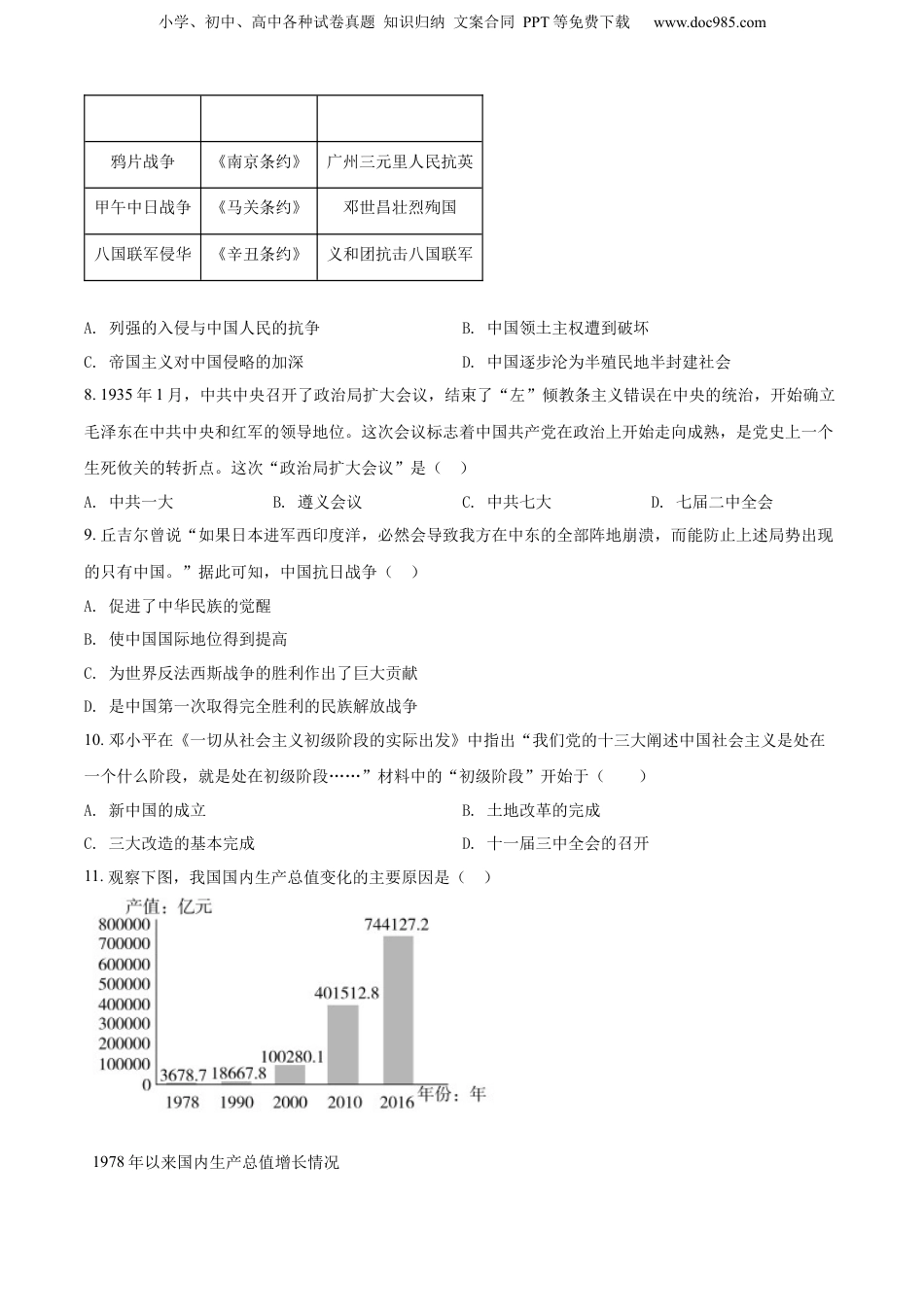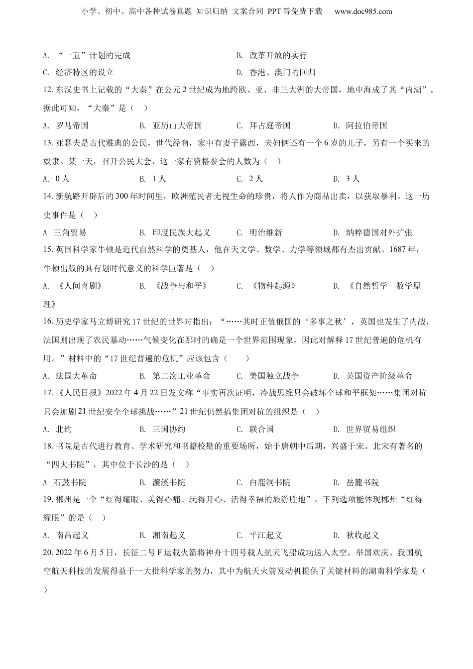 小学、初中、高中各种试卷真题知识归纳文案合同PPT等免费下载www.doc985.com2022年郴州市初中学业水平考试一、选择题(本大题其20小题,每小题2分,具40分。每个小题只有一项最符合要求)1.小华暑假参观了陕西一处古人类遗址,在这里他看到粟的遗存、彩陶和半地穴式房屋复原模型。他参观的遗址可能是()A.元谋人遗址B.北京人遗址C.河姆渡遗址D.半坡遗址2.“坐堂行医”一词源于我国古代一位名医,他写成《伤寒杂病论》,是中医临床理论体系的开创者,被后世称为“医圣”。这位“坐堂医生”是()A.扁鹊B.张仲景C.华佗D.李时珍3.下图是北魏时期的陶笼冠佣,该陶俑头戴纱织笼冠,身穿大袖上衣,下穿长裙,腰间系带,是当时着汉装的侍女形象,这种“胡人汉服”的现象主要是因为()A.商鞅变法B.前秦的统一C.孝文帝改革D.王安石变法4.“结束了数百年的政权分立局面,创立的制度成为后世选拔官员的主要途径,社会风气开放,文化发达,中外交流活跃,在当时世界上有巨大影响力。”材料描述的是()A.秦汉时期B.魏晋时期C.隋唐时期D.明清时期5.宋朝虽经济繁荣、文化昌盛、科技发达,但在与北方少数民族政权的战争中多次失败,这与其实行的治国政策有关。下列选项最能反映宋朝治国政策的是()A.宁为百夫长,不作一书生B.送子军中饮,家书醉里题C.文臣不爱钱,武将不惜死D.做人莫作军,做铁莫作针6.传统节日习俗是中华文化的重要组成部分,悬历史长期积淀的结果,在诗词作品中广为出现。苏轼词中“屈子冤魂终古在,楚乡遗俗至今留”描绘的传统节日是()A.春节B.清明节C.端午节D.中秋节7.对下表内容分析归纳最恰当的是()侵华战争不平等条约中国人民抗争小学、初中、高中各种试卷真题知识归纳文案合同PPT等免费下载www.doc985.com鸦片战争《南京条约》广州三元里人民抗英甲午中日战争《马关条约》邓世昌壮烈殉国八国联军侵华《辛丑条约》义和团抗击八国联军A.列强的入侵与中国人民的抗争B.中国领土主权遭到破坏C.帝国主义对中国侵略的加深D.中国逐步沦为半殖民地半封建社会8.1935年1月,中共中央召开了政治局扩大会议,结束了“左”倾教条主义错误在中央的统治,开始确立毛泽东在中共中央和红军的领导地位。这次会议标志着中国共产党在政治上开始走向成熟,是党史上一个生死攸关的转折点。这次“政治局扩大会议”是()A.中共一大B.遵义会议C.中共七大D.七届二中全会9.丘吉尔曾说“如果日本进军西印度洋,必然会导致我方在中东的全部阵地崩溃,而能防止上述局势出现的只有中国。”据此可知,中国抗日战争()A.促进了中华民族的觉醒B.使中国国际地位得到提高C.为世界反法西斯战争的胜利作出了巨大贡献D.是中国第一次取得完全胜利的民族解放战争10.邓小平在《一切从社会主义初级阶段的实际出发》中指出“我们党的十三大阐述中国社会主义是处在一个什么阶段,就是处在初级阶段……”材料中的“初级阶段”开始于()A.新中国的成立B.土地改革的完成C.三大改造的基本完成D.十一届三中全会的召开11.观察下图,我国国内生产总值变化的主要原因是()1978年以来国内生产总值增长情况小学、初中、高中各种试卷真题知识归纳文案合同PPT等免费下载www.doc985.comA.“一五”计划的完成B.改革开放的实行C.经济特区的设立D.香港、澳门的回归12.东汉史书上记载的“大秦”在公元2世纪成为地跨欧、亚、非三大洲的大帝国,地中海成了其“内湖”。据此可知,“大秦”是()A.罗马帝国B.亚历山大帝国C.拜占庭帝国D.阿拉伯帝国13.亚瑟夫是古代雅典的公民,世代经商,家中有妻子露西,夫妇俩还有一个6岁的儿子,另有一个买来的奴隶。某一天,召开公民大会,这一家有资格参会的人数为()A.0人B.1人C.2人D.3人14.新航路开辟后的300年时间里,欧洲殖民者无视生命的珍贵,将人作为商品出卖,以获取暴利。这一历史事件是()A.三角贸易B.印度民族大起义C.明治维新D.纳粹德国对外扩张15.英国科学家牛顿是近代自然科学的奠基人,他在天文学、数学、力学等领域都有杰出贡献。1687年,牛顿出版的具有划时代意义的科学巨著是()A.《人间喜剧》B.《战争与和平》C.《物种起源》D.《自然哲学的数学原理》16.历史学家马立博...