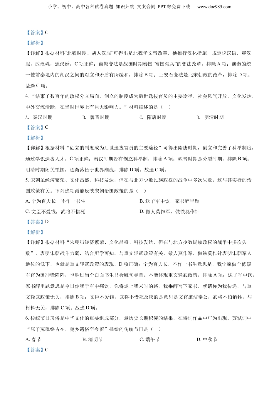 小学、初中、高中各种试卷真题知识归纳文案合同PPT等免费下载www.doc985.com2022年郴州市初中学业水平考试一、选择题(本大题其20小题,每小题2分,具40分。每个小题只有一项最符合要求)1.小华暑假参观了陕西一处古人类遗址,在这里他看到粟的遗存、彩陶和半地穴式房屋复原模型。他参观的遗址可能是()A.元谋人遗址B.北京人遗址C.河姆渡遗址D.半坡遗址【答案】D【解析】【详解】根据材料“看到粟的遗存、彩陶和半地穴式房屋复原模型”,结合所学可知,半坡人生活在陕西,黄河流域温暖湿润,半坡人的房屋主要是半地穴式圆形房屋;D项正确;元谋人遗址位于金沙江边的崇山峻岭之间,气候干燥炎热,是滇中地区著名的“热坝”,排除A项;北京人遗址,位于北京市西南约50公里的房山区周口店村旁的龙骨山上,排除B项;河姆渡遗址,位于浙江省宁波市余姚市河姆渡镇河姆渡村的东北,排除C项。故选D项。2.“坐堂行医”一词源于我国古代一位名医,他写成《伤寒杂病论》,是中医临床理论体系的开创者,被后世称为“医圣”。这位“坐堂医生”是()A.扁鹊B.张仲景C.华佗D.李时珍【答案】B【解析】【详解】根据所学知识可知,东汉名医张仲景写出《伤寒杂病论》,是中医临床理论体系的开创者,被后世称为“医圣”,B项正确;扁鹊是春秋战国时的名医、华佗是东汉末年的名医、李时珍是明朝的名医,写成了《本草纲目》,排除ACD项。故选B项。3.下图是北魏时期的陶笼冠佣,该陶俑头戴纱织笼冠,身穿大袖上衣,下穿长裙,腰间系带,是当时着汉装的侍女形象,这种“胡人汉服”的现象主要是因为()A.商鞅变法B.前秦的统一C.孝文帝改革D.王安石变法小学、初中、高中各种试卷真题知识归纳文案合同PPT等免费下载www.doc985.com【答案】C【解析】【详解】根据材料“北魏时期、胡人汉服”可得出是北魏孝文帝改革,他推行汉化措施,规定说汉语,穿汉服,改汉姓,通汉婚,C项正确;商鞅变法是战国时期秦国“富国强兵”的变法改革,排除A项;前秦的统一使前秦境内的胡汉之间的对立和矛盾有所缓和,排除B项;王安石变法是北宋朝政的改革,排除D项。故选C项。4.“结束了数百年的政权分立局面,创立的制度成为后世选拔官员的主要途径,社会风气开放,文化发达,中外交流活跃,在当时世界上有巨大影响力。”材料描述的是()A.秦汉时期B.魏晋时期C.隋唐时期D.明清时期【答案】C【解析】【详解】根据材料“创立的制度成为后世选拔官员的主要途径”可得出隋唐时期,创立和完善了科举制度,通过学识选拔人才,C项正确;秦汉时期没有创立科举制,排除A项;魏晋时期是分裂时期,排除B项;明清时期闭关锁国,逐渐落伍于世界潮流,排除D项。故选C项。5.宋朝虽经济繁荣、文化昌盛、科技发达,但在与北方少数民族政权的战争中多次失败,这与其实行的治国政策有关。下列选项最能反映宋朝治国政策的是()A.宁为百夫长,不作一书生B.送子军中饮,家书醉里题C.文臣不爱钱,武将不惜死D.做人莫作军,做铁莫作针【答案】D【解析】【详解】根据材料“宋朝虽经济繁荣、文化昌盛、科技发达,但在与北方少数民族政权的战争中多次失败”,表明宋朝战斗力弱,结合所学可知,与重文轻武政策有关,做人莫作军,做铁莫作针表明宋朝军人地位的低下,也就是重文轻武政策的表现,D项正确;宁为百夫长,不作一书生意思是,我宁愿做个低级军官为国冲锋陷阵,也胜过当个白面书生只会雕句寻章。不能体现重文轻武政策,排除A项;送子军中饮,家书醉里题意思是今日你我于军中痛饮,你将走上我来时的路。我乘醉写下家书,就请你为我传递,与重文轻武政策无关,排除B项;文臣不爱钱,武将不惜死反映的是意思是文官廉洁奉公,武将不怕牺牲,与材料无关,排除C项。故选D项。6.传统节日习俗是中华文化的重要组成部分,悬历史长期积淀的结果,在诗词作品中广为出现。苏轼词中“屈子冤魂终古在,楚乡遗俗至今留”描绘的传统节日是()A.春节B.清明节C.端午节D.中秋节【答案】C小学、初中、高中各种试卷真题知识归纳文案合同PPT等免费下载www.doc985.com【解析】【详解】根据所学知识可知,苏轼词中的“屈子”指的是战国时楚国的屈原,相传端午节就是为了纪...