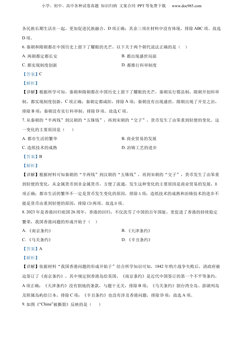 小学、初中、高中各种试卷真题知识归纳文案合同PPT等免费下载www.doc985.com2023年湖南省常德市中考历史真题考生注意:1、请考生在试题卷卷首填写好准考证号及姓名。2、请将答案填写在答题卡上,填写在试题卷上的无效。3、本学科试题卷共6页,两道大题,满分100分,考试时量90分钟。一、选择题(每小题2分,共48分。每小题只有一个最佳答案。)1.海内外华人以炎黄子孙自称。每年,满怀虔诚与崇敬的中华儿女会以多种形式祭祀炎帝和黄帝。其原因是()A.他们创造了使用至今的汉字B.他们带领人们根治了水患C.他们建立了我国第一个国家D.他们是中华民族的人文初祖【答案】D【解析】【详解】根据题干,结合所学可知,距今约四五千年,生活在黄河流域炎帝部落和黄帝部落联合在涿鹿一战中打败蚩尤部落。从此,炎帝、黄帝部落结成联盟,经过长期发展形成日后的华夏族,华夏族是汉族的前身,中华民族的主干部分。黄帝和炎帝被后人尊称为中华民族的“人文初祖”,D项正确;黄帝炎帝时期没有创造使用至今的汉字,排除A项;黄帝炎帝时期没有治理水患,排除B项;炎帝黄帝时期没有建立国家,排除C项。故选D项。2.下列是中国古代主要朝代(时期)沿革示意图(部分),在相应的空格内依次填入秦→□→东汉→三国→西晋→……□→唐→……→□→明→清()A.西汉、宋、元B.汉、东晋、元C.西汉、隋、元D.汉、五代、宋【答案】C【解析】【详解】根据材料结合所学知识,西汉灭亡以后,西汉宗室刘秀在公元25年建立政权,定都洛阳,史称东汉。隋朝灭亡后,618年,李渊称帝,建立唐朝,定都长安。1368年,朱元璋称帝,建立明朝,随后明军占领元大都,结束了元朝的统治,综上所述西汉后的主要朝代是东汉、隋朝后的主要朝代是唐、明朝前面的朝代是元,C项正确;北宋位于五代十国以后,南宋被元所灭,排除A项;汉朝分为西汉、东汉,题干示意图已有西汉,排除B项;五代是在唐朝灭亡后,排除D项。故选C项。3.某班开展历史知识竞赛活动,有一谜语的谜面是“统一多民族国家的建立和巩固”。其谜底应是()A.秦汉时期特征B.明清时期特征C.隋唐时期特征D.宋元时期特征【答案】A小学、初中、高中各种试卷真题知识归纳文案合同PPT等免费下载www.doc985.com【解析】【详解】依据题干信息“统一多民族国家的建立和巩固”,结合所学可知,秦始皇建立起中国历史上第一个统一的多民族的封建国家,汉武帝统治时期,大一统的局面得到进一步的巩固和发展,“统一多民族国家的建立和巩固”是秦汉时期的特征,A项正确;明清时期的特征是统一多民族国家的巩固与发展,排除B项;隋唐时期的特征是繁荣与开放,排除C项;宋元时期的特征是民族政权并立、民族进一步交融、由民族政权并立到统一、经济重心南移,排除D项。故选A项。4.下图所示内容的变化反映了()唐(750)人口占比分布北宋初期(1078年)人口占比分布A.土地兼并空前严重B.财政收入得到提高C.经济重心不断南移D.耕地面积逐渐增加【答案】C【解析】【详解】根据题干信息,750年人口分布黄河流域多,到1078年人口分布长江流域多,说法当时经济重心不断南移。安史之乱后北方战乱频繁,南方相对稳定,因此从唐朝中期开始经济重心南移,到南宋时最后完成,这一时期南方经济发展起来,人口逐渐超过北方,因此出现材料中长江流域人口超过黄河流域人口,C项正确;材料强调南北人口分布变化,不能体现土地兼并空前严重,排除A项;材料无法反映财政收入,排除B项;耕地面积与材料无关,排除D项。故选C项。5.魏晋时期的北方,胡汉合舞已成为普遍的风气;元朝时期,各族之间的通婚很普遍。这些现象反映了A.文化昌盛B.中央集权加强C.江南地区开发D.民族交融发展【答案】D【解析】【详解】根据材料“魏晋时期的北方,胡汉合舞已成为普遍的风气;元朝时期,各族之间的通婚很普遍。”中的胡汉合舞,通婚等,结合所学可知,东汉开始北方少数民族内迁,各民族不断融合,到元朝时,小学、初中、高中各种试卷真题知识归纳文案合同PPT等免费下载www.doc985.com各民族长期生活在一起,更加促进民族融合,D项正确;其余三项在材料中没有体现,排除ABC项。故选D项。6.秦朝和隋朝都在中国历史上留...