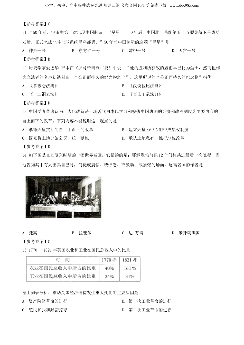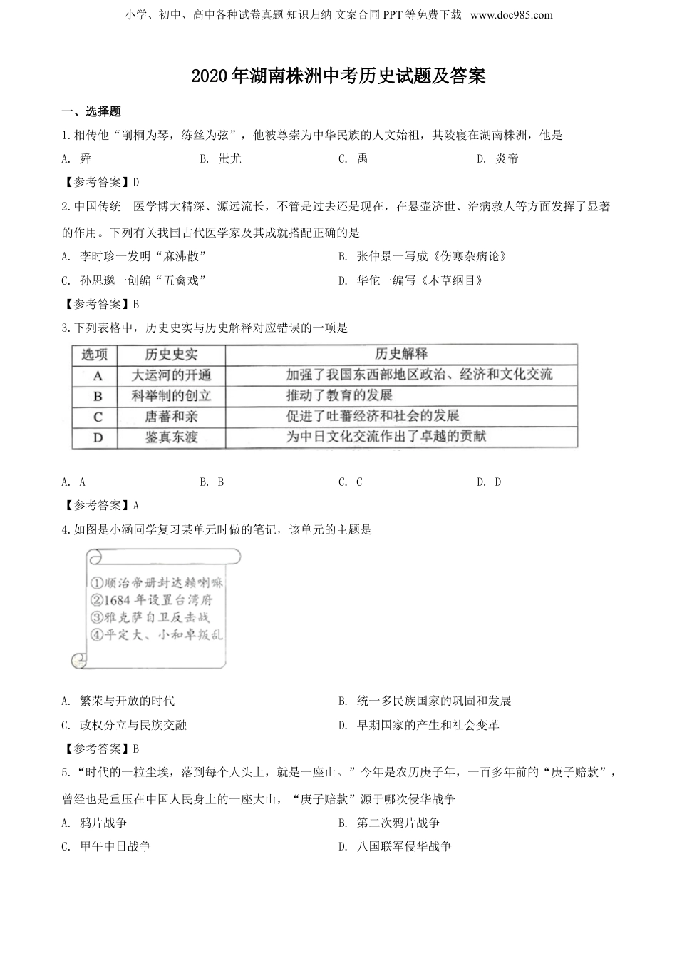 小学、初中、高中各种试卷真题知识归纳文案合同PPT等免费下载www.doc985.com2020年湖南株洲中考历史试题及答案一、选择题1.相传他“削桐为琴,练丝为弦”,他被尊崇为中华民族的人文始祖,其陵寝在湖南株洲,他是A.舜B.蚩尤C.禹D.炎帝【参考答案】D2.中国传统的医学博大精深、源远流长,不管是过去还是现在,在悬壶济世、治病救人等方面发挥了显著的作用。下列有关我国古代医学家及其成就搭配正确的是A.李时珍一发明“麻沸散”B.张仲景一写成《伤寒杂病论》C.孙思邈一创编“五禽戏”D.华佗一编写《本草纲目》【参考答案】B3.下列表格中,历史史实与历史解释对应错误的一项是A.AB.BC.CD.D【参考答案】A4.如图是小涵同学复习某单元时做的笔记,该单元的主题是A.繁荣与开放的时代B.统一多民族国家的巩固和发展C.政权分立与民族交融D.早期国家的产生和社会变革【参考答案】B5.“时代的一粒尘埃,落到每个人头上,就是一座山。”今年是农历庚子年,一百多年前的“庚子赔款”,曾经也是重压在中国人民身上的一座大山,“庚子赔款”源于哪次侵华战争A.鸦片战争B.第二次鸦片战争C.甲午中日战争D.八国联军侵华战争小学、初中、高中各种试卷真题知识归纳文案合同PPT等免费下载www.doc985.com【参考答案】D6.孙中山说:“革命为唯一法门.举政治革命、社会革命毕其功于一役。”他领导的哪场“革命”宣告了中国两千多年君主专制制度的终结A.二次革命B.辛亥革命C.护国战争D.国民革命【参考答案】B7.毛泽东说:“讲到重工业不能忘记张之洞,讲到轻工业不能忘记张謇。”下列表格中的哪项组合能充分印证这一观点A.AB.BC.CD.D【参考答案】D8.国民党《中央日报》总主笔陶希圣对报社的编辑们说:“我们明知共产党不会来渝谈判,我们要假戏真做,制造空气。”这反映了国民党电邀毛泽东赴重庆谈判的真实目的在于A.和平建国B.“假和平,真内战”C.共商国是D.结束内战【参考答案】B9.如图人物1960年到大庆参加石油大会战,当井喷险情发生时,他不顾腿伤跳进泥浆池,用身体搅拌泥浆,制服了井喷。他是A.王进喜B.焦裕禄C.黄继光D.雷锋【参考答案】A10.1984年,邓小平视察了深圳、珠海、厦门经济特区后说:“特区是个窗口,是技术的窗口,管理的窗口,知识的窗口,也是对外政策的窗口。”这句话概括了我国设立经济特区的A.背景B.条件C.作用D.格局小学、初中、高中各种试卷真题知识归纳文案合同PPT等免费下载www.doc985.com【参考答案】C11.“50年前,宇宙中第一次出现中国制造的‘星星’;50年后,中国北斗系统第五十五颗导航卫星成功发射,正式完成北斗全球系统星座部署。”50年前中国制造的这颗“星星”是A.神舟一号B.东方红一号C.嫦娥一号D.天宫一号【参考答案】B12.历史学家爱德华.吉本在《罗马帝国衰亡史》中说:“他的胜利所获致的虛衔早已化为尘土,然而他作为立法者的名声却镌刻在一个公正而持久的纪念物之上”。这里所说的“公正而持久的纪念物”指优A.《拿破仑法典》B.《汉谟拉比法典》C.《十二铜表法》D.《查士丁尼法典》【参考答案】D13.中国学者普遍认为:大化改新是一场舌代白本以学习和模仿中国唐朝的经济和政治制度为主要内容的自上而下的改革。下列内容不能说明这一观点的是A.孝德天皇实行的自,上而下的改革B.建立天皇为中心的中央集权制度C.国家将土地分给公民,统一赋税D.承认土地私有,推行地税改革【参考答案】D14.如下图是文艺复兴时期的一幅世界名画,它描绘的是:耶稣遇难前跟12个门徒共进最后一次晚餐,当他告知其中有人出卖自己时,门徒或震惊、或愤怒、或激动、或紧张的场面。这幅名画的作者是A.梵高B.拉斐尔C.达.芬奇D.米开朗琪罗【参考答案】C15.1770一1821年英国农业和工业在国民总收入中的比重据上如表分析,推动英国经济结构发生重大变化的主要原因是A.资产阶级革命的进行B.第一次工业革命的进行C.殖民扩张和野蛮掠夺D.第二次工业革命的进行小学、初中、高中各种试卷真题知识归纳文案合同PPT等免费下载www.doc985.com【参考答案】B16.“我们应该朝着他的精神方向努力:不是通过暴力达到我们的目的,而是不同你认为邪恶的势力结盟。”这是美国科学家爱因斯坦对印度哪位民族领...