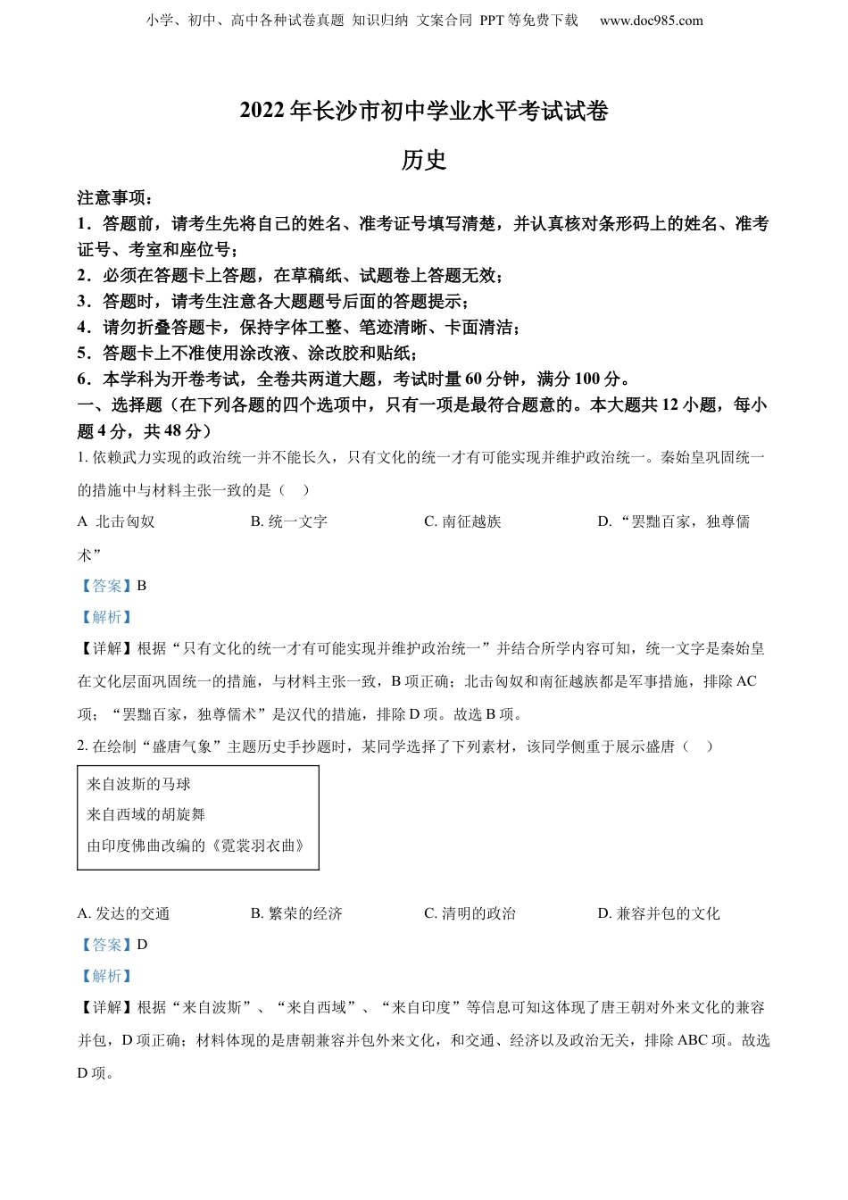 小学、初中、高中各种试卷真题知识归纳文案合同PPT等免费下载www.doc985.com2022年长沙市初中学业水平考试试卷历史注意事项:1.答题前,请考生先将自己的姓名、准考证号填写清楚,并认真核对条形码上的姓名、准考证号、考室和座位号;2.必须在答题卡上答题,在草稿纸、试题卷上答题无效;3.答题时,请考生注意各大题题号后面的答题提示;4.请勿折叠答题卡,保持字体工整、笔迹清晰、卡面清洁;5.答题卡上不准使用涂改液、涂改胶和贴纸;6.本学科为开卷考试,全卷共两道大题,考试时量60分钟,满分100分。一、选择题(在下列各题的四个选项中,只有一项是最符合题意的。本大题共12小题,每小题4分,共48分)1.依赖武力实现的政治统一并不能长久,只有文化的统一才有可能实现并维护政治统一。秦始皇巩固统一的措施中与材料主张一致的是()A.北击匈奴B.统一文字C.南征越族D.“罢黜百家,独尊儒术”【答案】B【解析】【详解】根据“只有文化的统一才有可能实现并维护政治统一”并结合所学内容可知,统一文字是秦始皇在文化层面巩固统一的措施,与材料主张一致,B项正确;北击匈奴和南征越族都是军事措施,排除AC项;“罢黜百家,独尊儒术”是汉代的措施,排除D项。故选B项。2.在绘制“盛唐气象”主题历史手抄题时,某同学选择了下列素材,该同学侧重于展示盛唐()来自波斯的马球来自西域的胡旋舞由印度佛曲改编的《霓裳羽衣曲》A.发达的交通B.繁荣的经济C.清明的政治D.兼容并包的文化【答案】D【解析】【详解】根据“来自波斯”、“来自西域”、“来自印度”等信息可知这体现了唐王朝对外来文化的兼容并包,D项正确;材料体现的是唐朝兼容并包外来文化,和交通、经济以及政治无关,排除ABC项。故选D项。小学、初中、高中各种试卷真题知识归纳文案合同PPT等免费下载www.doc985.com3.它是中国历史上版图最大的时期,对边疆地区实施了长时间和比较稳定的统治:它对边疆的管理更多地呈现出与内地一体化的趋向。材料描述的是()A.汉朝B.隋朝C.唐朝D.元朝【答案】D【解析】【详解】根据题干“它是中国历史上版图最大的时期”结合所学知识,元朝的版图是我国历史上最大的,今天的新疆、西藏、云南、东北的广大第七,台湾及其附属岛屿,都在元朝的统治范围之内,D项正确;汉朝、隋朝、唐朝与“中国历史上版图最大的时期”不符,排除ABC项。故选D项。4.明朝鼎盛时期全国人口达到1亿多,乾隆末年全国人口发展到3亿。顺治十八年,全国耕地面积549万余顷,到乾隆三十一年,全国耕地面积达到741万余顷。这反映了清前期()A.社会经济迅速发展B.商品经济十分活跃C.实行闭关锁国政策D.君主专制进一步强化【答案】A【解析】【详解】根据材料内容可知,清朝乾隆时期全国的人口和耕地面积都大大增加,这体现了社会经济的迅速发展,A项正确;清朝实行重农抑商政策,商品经济并不是十分活跃,排除B项;材料无法体现闭关锁国政策和君主专制的强化,排除CD项。故选A项。5.1896年春,谭嗣同写下《有感》一诗:世间无物抵春愁,合向苍冥一哭休。四万万人齐下泪,天涯何处是神州。”最可能引发谭嗣同发出这一感慨的是()A.鸦片战争B.第二次鸦片战争C.甲午中日战争D.八国联军侵华战争【答案】C【解析】【详解】根据材料“1896年春、四万万人齐下泪”并结合材料可知,最可能引发谭嗣同发出这一感慨的是1894-1895年的甲午中日战争,C项正确;鸦片战争是1840-1842年,不符合题意,排除A项;第二次鸦片战争是1856-1860年,排除B项;八国联军侵华战争是1900-1901年,排除D项。故选C项。6.以下是武汉市喻桥乡贫农陈友汉在不同时期的家庭情况对比表。他家生产生活发生巨大变化的主要原因是()新中国成立前1953年土地极少15亩多农具无农具齐全稻谷收成350千克1600千克小学、初中、高中各种试卷真题知识归纳文案合同PPT等免费下载www.doc985.comA.土地改革B.农业合作化C.实施第一个五年计划D.实行家庭联产承包责任制【答案】A【解析】【详解】结合所学内容可知,新中国成立之初,贫农陈友汉之所以能够获得土地和农具,获得粮食的丰收,主要是因为当时实行了土地改革,使他们获得了土地和农具,A项正确;农业合作...