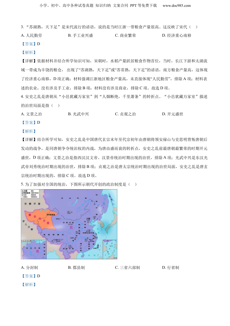 小学、初中、高中各种试卷真题知识归纳文案合同PPT等免费下载www.doc985.com2023年岳阳市初中学业水平考试试卷历史温馨提示:1.本试卷分两道大题,24小题,满分100分,和道德与法治合堂考试,考试时量各60分钟;2.本试卷分为试题卷和答题卡两部分,所有答案都必须填涂或填写在答题卡上规定的答题区域内;3.考试结束时,考生不得将试题卷、答题卡、草稿纸带出考场。一、选择题(本大题共20小题,每小题2分,共40分。各小题的四个选项中,只有一项符合题目要求。1.“”所表示的是中国已发现的最早的文字,这种文字被称为()A.甲骨文B.钟鼎文C.大篆D.小篆【答案】A【解析】【详解】根据所学可知,甲骨文是中国已发现的古代文字中年代最早、体系较为完整的文字,对中国文字的形成与发展有深远的影响,A项正确;钟鼎文多是铸刻在钟、鼎上面,从商代中晚期开始出现,数量较少,比甲骨文晚,排除B项;大篆是西周晚期普遍采用的字体,不符题意,排除C项;小篆是秦统一后的文字,不符题意,排除D项。故选A项。2.如果有机会让你穿越到秦朝,在都城咸阳生活,你购买生活用品使用的货币是()A.B.C.D.【答案】C【解析】【详解】根据材料“秦朝,在都城咸阳生活”结合所学知识可知,秦统一全国后,统一全国货币,在全国范围内使用圆形方孔的半两钱,因此选项中的C项符合题意,C项正确;秦统一后使用的货币是圆形方孔钱,A项是战国时期楚国蚁鼻钱,不属于圆形方孔钱,排除A项;B项货币是战国时期的刀币,不符合题意,排除B项;D项是春秋时期晋国耸肩尖足空首布币,不符合题意,排除D项。故选C项。小学、初中、高中各种试卷真题知识归纳文案合同PPT等免费下载www.doc985.com3.“苏湖熟,天下足”是宋代流行的谚语,说的是当时江浙一带粮食产量很高。这反映了宋代()A.人民勤劳B.手工业兴盛C.商业繁荣D.经济重心南移【答案】D【解析】【详解】依据材料并结合所学知识可知,宋朝时,水稻产量跃居粮食作物首位,当时,长江下游和太湖流域一带成为丰饶的粮仓,出现了“苏湖熟,天下足”或“苏常熟,天下足”的谚语,南方粮食产量高,这体现了经济重心南移,D项正确;材料强调江浙地区粮食产量高,未直接体现“人民勤劳”,排除A项;材料表述的农业,没有涉及手工业,排除B项;材料没有涉及商业,排除C项。故选D项。4.安史之乱是唐朝从“小邑犹藏万家室”到“人烟断绝,千里萧条”的转折点。“小邑犹藏万家室”描述的治世局面是指()A.文景之治B.光武中兴C.贞观之治D.开元盛世【答案】D【解析】【详解】结合所学可知,安史之乱是中国唐代玄宗末年至代宗初年由唐朝将领安禄山与史思明背叛唐朝后发动的战争,是同唐朝争夺统治权的内战,为唐由盛而衰的转折点,安史之乱前最唐朝最繁荣的时期开元盛世,D项正确;文景之治是指西汉汉文帝、汉景帝统治时期出现的治世,排除A项;光武中兴是东汉光武帝刘秀统治时期出现的治世,排除B项;贞观之治是唐太宗统治时期出现的治世局面,安史之乱是唐玄宗统治时期出现的,排除C项。故选D项。5.为了加强对全国的统治,下图所示朝代开创的政治制度是()A.分封制B.郡县制C.三省六部制D.行省制【答案】D【解析】小学、初中、高中各种试卷真题知识归纳文案合同PPT等免费下载www.doc985.com【详解】根据所学解读图片可知,图片中有“辽阳行省”“甘肃行省”等内容,这说明图片反映的是元朝开创的行省制度,D项正确;从图片中的“元朝疆域”可知,图片反映的朝代是元朝,而分封制是西周出现的制度,秦朝建立后已经进一步废除,被郡县制取代,三省六部制出现于隋朝,完善于唐朝,均与元朝无关,排除ABC三项。故选D项。6.原始史料是指接近或直接在历史发生当时所产生、能够较直接作为历史根据的史料。据此,下列属于原始史料的是()A.桃园三结义的故事B.司母戊鼎C.电视剧《康熙王朝》D.《西游记》【答案】B【解析】【详解】根据材料信息可知,原始史料是指接近或直接在历史发生当时所产生、能够较直接作为历史根据的史料,选项中司母戊鼎属于出土的文物、为实物史料,可信度较高,属于原始史料,B项正确;桃园三结义的故事、电视剧《康熙王朝》均经过一定的演绎,非原始...
