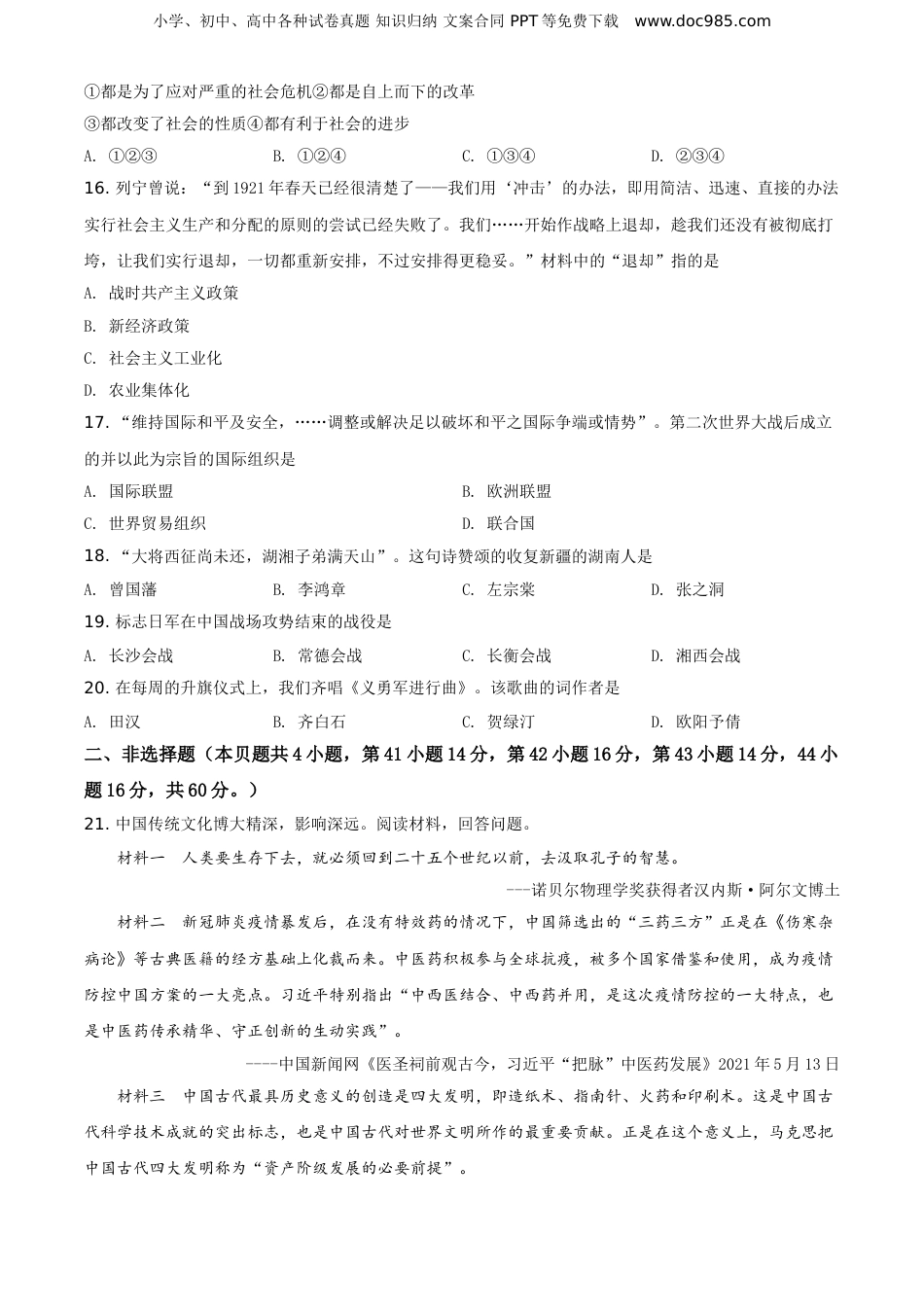 小学、初中、高中各种试卷真题知识归纳文案合同PPT等免费下载www.doc985.com2021年湖南省岳阳市中考历史试题(原卷版)温馨提示:1.本试卷共两道大题,24小题,满分100分。和道德与法治合堂考试,考试时量各60分钟:2.本试卷分为试题卷和答题卡两部分,所有答案都必须填涂或填写在答题卡上规定的答题区域内;3.考试结束时,考生不得将试题卷、答题卡、草稿纸带出考场。.一、选择题(在下列各题的四个选项中,只有一项符合题目要求。本大题共20小题,每小题2分,共40分。1.提取下列四幅图片的历史信息,归纳唐朝的时代特征。正确的是A.统一多民族国家的建立和巩固B.政权分立与民族交融C.繁荣与开放D.统一多民族国家的巩固与发展2.清代史学家赵翼在《檐曝杂记》中说:“(军机大臣)只供传述缮撰,而不能稍有赞画于其间也”。由此可知A.皇帝独掌朝政B.皇帝与军机大臣共掌朝政C.皇帝与军机大臣相互制衡D.军机处高于皇权3.1882年底,英国商人比尔兹利在年度财务报告中写道:“统计结果表明,我们的航运公司今年亏损额达到了400万两白银,当然,法国的轮船公司也大致如此。照这样下去,我们将很快退出上海航运市场了一造成这种局面的原因是李鸿章先生蒸蒸日上的轮船招商局”。这则材料反映了上海轮船招商局的创办A.启动了中国近代化的进程B.使中国开始走上富强道路C.促进了中国民族资本主义的产生D.对外国资本的入侵起到了一定的抵制作用4.1915年,陈独秀在上海创办《青年杂志》。如果要你为这本杂志添加出版年代,按照当时中国的纪年法,正确的是A.民国三年B.民国四年C.民国1915年D.公元1915年5.抗日战争胜利的决定性因素是A.抗日战争是反侵略的正义战争B.中国共产党发挥了中流砥柱的作用小学、初中、高中各种试卷真题知识归纳文案合同PPT等免费下载www.doc985.comC.世界上爱好和平与正义的国家和人民的支持D.中国人民的民族觉醒、民族团结、民族抗争6.将下列电影反映的历史事件,按发生的时间先后顺序排列,正确的是①《西安事变》②《甲午风云》③《火烧圆明园》④《渡江侦察记》⑤《建军大业》A.③②⑤①④B.③②①⑤④C.②③①⑤④D.②③⑤①④7.1952年底,我国彻底摧毁了存在2000多年的封建土地制度,农民翻了身,成为土地的主人。这得益于A.土地改革运动B.农业合作化运动C.人民公社化运动D.家庭联产承包责任制8.抗美援朝时期,涌现出了-批“最可爱的人”,黄继光、邱少云等成为这个时代的典型化表。他们身上共同体现了A.开天辟地、立党为公的红船精神B.忧国忧民、敢于斗争的五四精神C.保家卫国、不怕牺牲的上甘岭精神D.艰苦创业无私奉献的“铁人”精神9.为实现“禾下乘凉梦”在斗一生的“杂交水稻之父”是A.邓稼先B.袁隆平C.钱学森D.屠呦呦10.黑格尔曾说:古希腊是“整个欧洲人的精神家园”。这里的“精神”是指A.《汉谟拉比法典》B.种姓制度C.雅典民主政治D.《查士丁尼法典》11.中世纪西欧庄园内有治铁等作坊,奶酪、衣服等也自己制作。黄梅戏《天仙配》有一句唱词“你耕田来我织布,你挑水来我浇园”。二者体现的经济特征,相同的是A.实行土地公有B.都是自由农民C.都具有司法权D.经济自给自足12.6-9世纪,日本朝野醉心于学习和模仿唐朝的制度与文化。下列与日本学习和模仿唐朝有关的是A.大和统一日本B.大化改新C.幕府统治建立D.彼得一世改革13.文艺复兴的先驱但丁说:“走自己的路,让别人说去吧”。这句话体现的时代思潮是A.封建神学B.浪漫主义C.人文主义D.启蒙思想14.运用时间轴培养时空观是历史学习的基本方法之一。下列时间轴中,与③对应的事件是A.美国独立战争B.英国资产阶级革命C.拿破仑帝国D.法国大革命15.俄国农奴制改革、日本明治维新、中国戊戌变法的共同点是小学、初中、高中各种试卷真题知识归纳文案合同PPT等免费下载www.doc985.com①都是为了应对严重的社会危机②都是自上而下的改革③都改变了社会的性质④都有利于社会的进步A.①②③B.①②④C.①③④D.②③④16.列宁曾说:“到1921年春天已经很清楚了——我们用‘冲击’的办法,即用简洁、迅速、直接的办法实行社会主义生产和分配的原则的尝试已经失败了。我们……开始作战略上退却,趁我们还没有被彻底打垮,...