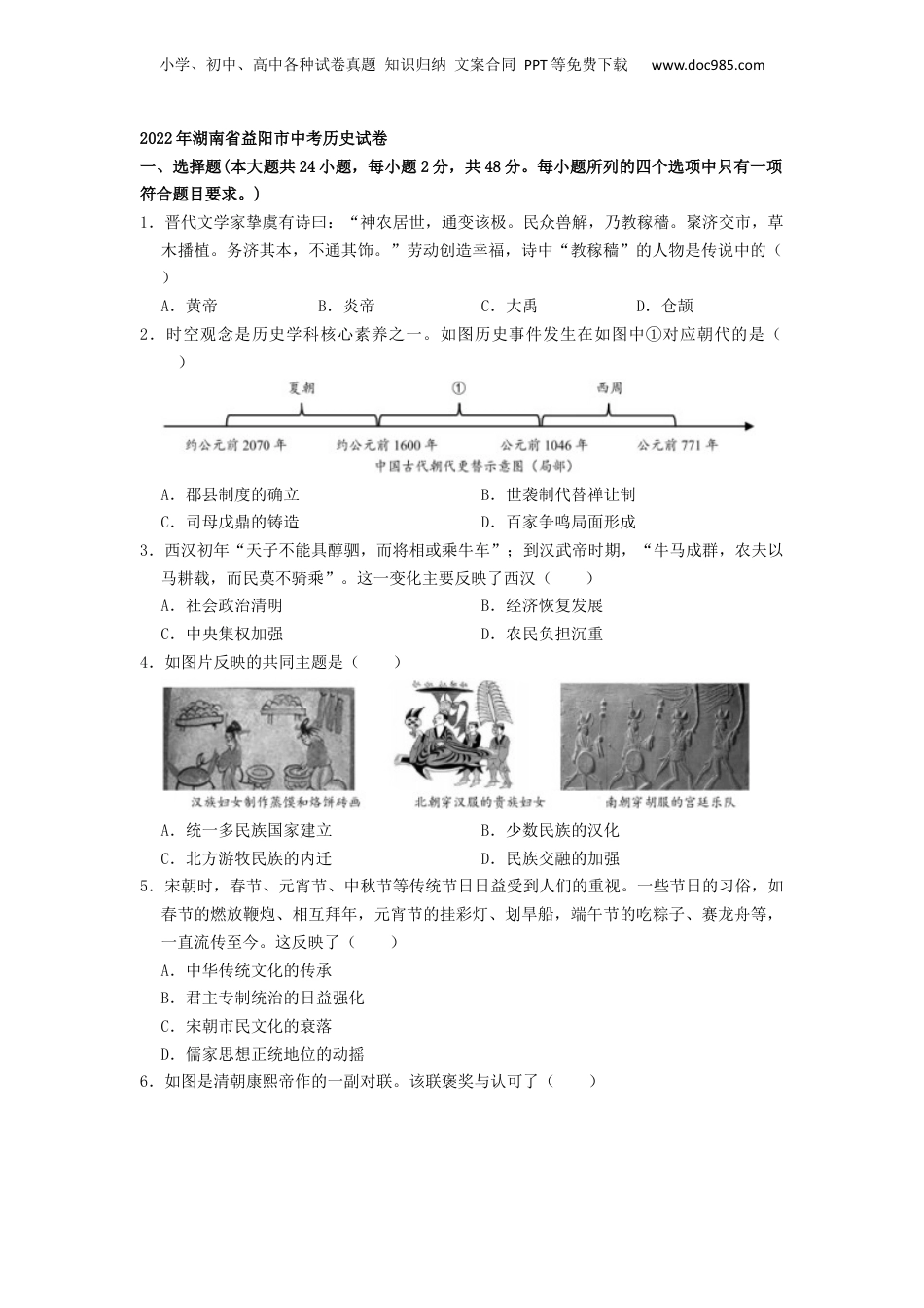 小学、初中、高中各种试卷真题知识归纳文案合同PPT等免费下载www.doc985.com2022年湖南省益阳市中考历史试卷一、选择题(本大题共24小题,每小题2分,共48分。每小题所列的四个选项中只有一项符合题目要求。)1.晋代文学家挚虞有诗曰:“神农居世,通变该极。民众兽解,乃教稼穡。聚济交市,草木播植。务济其本,不通其饰。”劳动创造幸福,诗中“教稼穑”的人物是传说中的()A.黄帝B.炎帝C.大禹D.仓颉2.时空观念是历史学科核心素养之一。如图历史事件发生在如图中①对应朝代的是()A.郡县制度的确立B.世袭制代替禅让制C.司母戊鼎的铸造D.百家争鸣局面形成3.西汉初年“天子不能具醇驷,而将相或乘牛车”;到汉武帝时期,“牛马成群,农夫以马耕载,而民莫不骑乘”。这一变化主要反映了西汉()A.社会政治清明B.经济恢复发展C.中央集权加强D.农民负担沉重4.如图片反映的共同主题是()A.统一多民族国家建立B.少数民族的汉化C.北方游牧民族的内迁D.民族交融的加强5.宋朝时,春节、元宵节、中秋节等传统节日日益受到人们的重视。一些节日的习俗,如春节的燃放鞭炮、相互拜年,元宵节的挂彩灯、划旱船,端午节的吃粽子、赛龙舟等,一直流传至今。这反映了()A.中华传统文化的传承B.君主专制统治的日益强化C.宋朝市民文化的衰落D.儒家思想正统地位的动摇6.如图是清朝康熙帝作的一副对联。该联褒奖与认可了()小学、初中、高中各种试卷真题知识归纳文案合同PPT等免费下载www.doc985.comA.岳飞抗金B.文天祥抗元C.戚继光抗倭D.郑成功收复台湾7.“苟利国家生死以,岂因祸福避趋之”是林则徐爱国情怀的真实写照。下列历史事件与林则徐直接相关的是()A.虎门销烟B.义和团运动C.黄海大战D.三元里人民抗英8.近代中国的一些革命运动中,先进青年知识分子起了先锋作用。某次运动发布的《北京学界全体宣言》写道:“务望全国工商各界,一律起来设法开国民大会,外争主权,内除国贼……,国亡了,同胞起来呀!”这次运动是()A.戊戌变法B.辛亥革命C.五四运动D.新文化运动9.如图是张自忠的一封书信。该书信写于()A.北伐战争时期B.红军长征时期C.抗日战争时期D.解放战争时期10.如表是某同学在研究“中国共产党的指导思想”时绘制的表格。表格中②应为()时间会议名称思想内容1945年②确立毛泽东思想为中国共产党的指导思想1997年中共十五大把邓小平理论确立为党的指导思想小学、初中、高中各种试卷真题知识归纳文案合同PPT等免费下载www.doc985.com2017年中共十九大习近平新时代中国特色社会主义思想被确立为中国共产党必须长期坚持的指导思想A.中共一大B.中共二大C.中共七大D.中共八大11.2022年6月3日,中央电视台《朝闻天下》栏目以“上下求索家国情”为主题报道了邓稼先,肯定了其对中华民族伟大复兴的引领作用。邓稼先的优秀事迹体现了()A.红船精神B.井冈山精神C.改革先锋精神D.“两弹一星”精神12.如果要去探访迄今为止世界上已知的最古老的水稻田,你应该选择去()A.城头山遗址B.高庙遗址C.彭头山遗址D.玉蟾岩遗址13.他强调学习西方,以夷制夷,其“经世致用”思想对鸦片战争前后的中国产生了深刻影响。他是湖南安化人()A.周敦颐B.陶澍C.王船山D.魏源14.“大将筹边尚未还,湖湘子弟满天山。新栽杨柳三千里,引得春风度玉关。”该诗赞扬了()A.曾国藩创建湘军办洋务B.谭嗣同革新图强C.左宗棠收复和治理新疆D.陈宝箴支持变法15.红军长征初期的一次军事行动,打乱了敌人的部署,初步扭转了红军长征以来的被动局面,在长征史上写下了光辉的一页。这次行动是()A.湘南暴动B.通道转兵C.湘西会战D.长衡会战16.湖南某大学成功研制出银河系列计算机,使我国成为继美国、日本之后第三个具备研制高性能计算机能力的国家。这所大学是()A.湖南师范大学B.中南大学C.湖南大学D.国防科技大学17.2022年北京成功举办了第24届冬季奥林匹克运动会,成为第一个既举办过夏奥会又举办了冬奥会的城市。欧洲文明的发祥地、奥林匹克的故乡是()A.古埃及B.古希腊C.古罗马D.古印度18.“中国经历上下千年的分分合合...