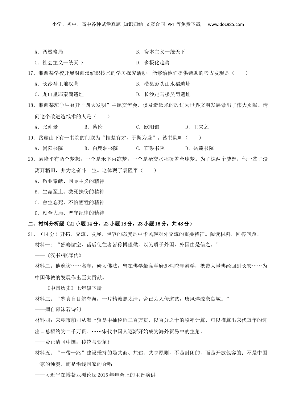 小学、初中、高中各种试卷真题知识归纳文案合同PPT等免费下载www.doc985.com2022年湖南省湘西州中考历史试卷一、单项选择题(每小题2分,共40分。每小题只有一个正确答案)1.某校学生以“民族融合”为主题进行探究活动,收集到某个王朝推行“说汉话、穿汉服、行汉制”等措施的资料。请问这个王朝的国君是()A.汉武帝B.唐太宗C.秦始皇D.北魏孝文帝2.1662年,从荷兰殖民者手中收复台湾的民族英雄是()A.戚继光B.郑成功C.关天培D.邓世昌3.1915年,以陈独秀为首的先进知识分子针对当时中国社会存在的积弊,进行了一场思想文化领域的革新运动。请问这场革新运动是()A.洋务运动B.戊戌变法C.新文化运动D.辛亥革命4.1936年12月,张学良和杨虎城发动了一次震惊中外的“事变”,该“事变”的和平解决标志着抗日民族统一战线初步形成。请问该“事变”是()A.卢沟桥事变B.九一八事变C.皖南事变D.西安事变5.电影《长津湖》有一个片段:中国人民志愿军高唱着“雄赳赳,气昂昂,跨过鸭绿江……”开赴战场。请问这场战争是()A.抗美援朝战争B.抗日战争C.解放战争D.越南战争6.1964年10月16日,在我国西部戈壁一声霹雳巨响,巨大的蘑菇云腾空而起,有力地打破了超级大国的核垄断和核讹诈。请问这霹雳巨响是()A.我国第一颗原子弹爆炸成功B.第一次导弹发射实验成功C.神州五号载人飞船成功着陆D.东方红一号卫星成功发射7.著名的楹联专家马萧萧写了一副对联:“结缔归根玉莲蕊共紫荆艳,清源正本镜海波随香港回”。请问这幅对联赞颂的事件是()A.台湾回归B.中日建交C.港澳回归D.中美建交8.《汉谟拉比法典》规定:奴隶打自由民的嘴巴或不承认自己的主人,要被处以割耳之刑。这反映了该法典()A.维护奴隶主阶级的利益B.提高了奴隶的政治地位C.促进古巴比伦经济发展D.奠定了民主政治的基础9.《西游记》是中国古代小说的经典作品,作品中描述了唐僧、孙悟空、如来佛祖等一系列角色,其中小学、初中、高中各种试卷真题知识归纳文案合同PPT等免费下载www.doc985.com与“如来佛祖”有关的宗教是()A.伊斯兰教B.佛教C.道教D.基督教10.阿拉伯人被誉为“东西方文化交流的使者”,在吸收、消化外来文化的基础上创造了有自己特色的阿拉伯文化。下列作品属于阿拉伯文学瑰宝的是()A.《荷马史诗》B.《神曲》C.《天方夜谭》D.《人间喜剧》11.达•芬奇的代表作品《蒙娜丽莎》以现实人物为主题,人物形象神态自若。该作品体现出()A.人文主义精神B.神权至上思想C.封建愚昧思想D.王权至上思想12.新航路开辟以后,世界日益连为一个整体。如图是新航路的开辟示意图,请问图中d航线的船队是()A.达•伽马船队B.哥伦布船队C.麦哲伦船队D.迪亚士船队13.石油被称为“工业的血液”。请问在第二次工业革命中,石油工业的快速发展与以下哪项发明有关()A.蒸汽机B.内燃机C.计算机D.电视机14.世界反法西斯联盟正式形成的标志是1942年26个国家签署的()A.《凡尔赛条约》B.《开罗宣言》C.《波茨坦公告》D.《联合国家宣言》15.农业问题关系着国家的稳定。1921年,俄国苏维埃政府采取了粮食税代替余粮征集制的措施,这一措施产生的作用是()A.由农业国发展为工业国B.恢复和发展了农业生产C.促进了中小企业的发展D.推动了农业集体化运动16.苏联解体后,美国成为唯一的超级大国,欧盟、日本、俄罗斯、中国等几个国家实力也相对突出,广大发展中国家整体实力增强。这一现状反映了世界政治格局的走向是()小学、初中、高中各种试卷真题知识归纳文案合同PPT等免费下载www.doc985.comA.两极格局B.资本主义一统天下C.社会主义一统天下D.多极化趋势17.湘西某学校开展对西汉纺织技术的学习探究活动,能够给他们提供帮助的考古发现是()A.长沙马王堆汉墓B.澧县彭头山水稻遗址C.龙山里耶秦简遗址D.长沙走马楼吴简遗址18.湘西某班学生召开“四大发明”主题交流会,谈及造纸术的改进为世界文明发展做出了伟大贡献。请问这个改进造纸术的人是()A.张仲景B.蔡伦C.欧阳询D.王夫之19.岳麓山下有一书院的门联为“惟楚有才,于斯为盛”。该书...