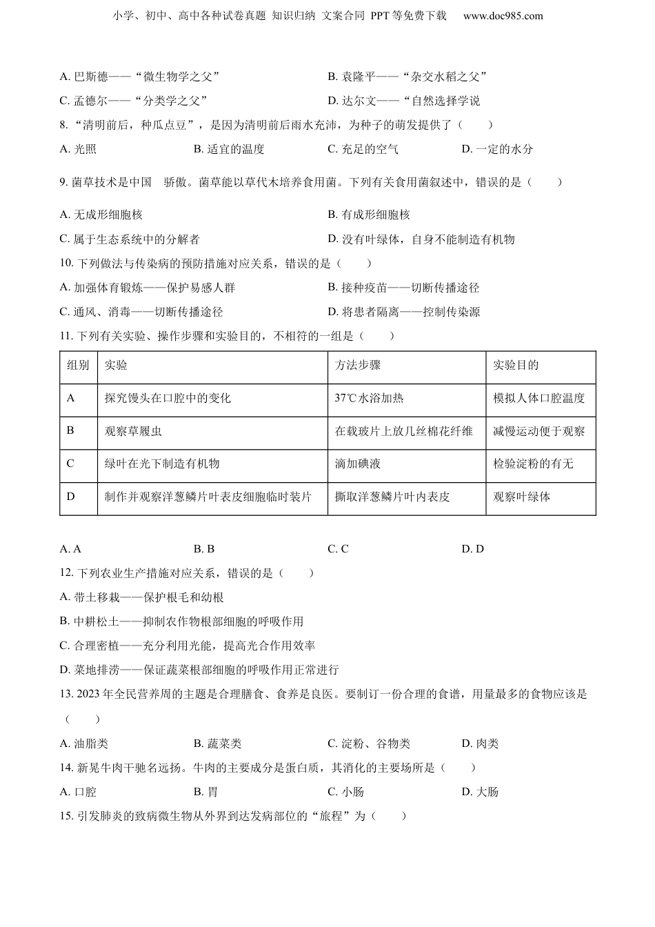 精品解析:2023年湖南省怀化市中考生物真题(原卷版).docx本文件免费下载 【共9页】