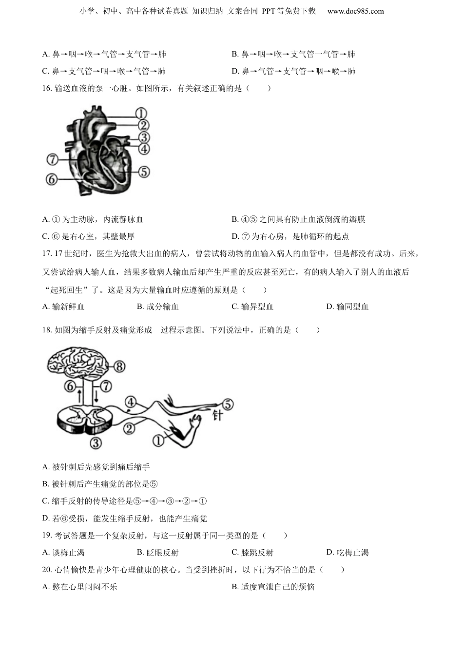 小学、初中、高中各种试卷真题知识归纳文案合同PPT等免费下载www.doc985.com怀化市2023年初中学业水平考试试卷生物温馨提示:(1)本学科试卷分试题卷与答题卡两部分,考试时量90分钟,满分100分。(2)请你将姓名、准考证号等相关信息按要求填涂在答题卡上。(3)请你在答题卡上作答,在试题卷上答题无效。一、选择题(本题共30小题,1-10小题每题1分,11-30小题每题2分,共50分)1.某学校开展春季研学,美好的春色让同学们兴奋不已。下列体现生命现象的是()A.阳光明媚B.春风和煦C.鸟语花香D.高山流水2.俗话说“大树底下好乘凉”。这说明()A.环境影响生物B.生物影响环境C.生物适应环境D.生物相互影响3.下列选项中可以称为怀化“绿色之肺”的是()A.商业步行街B.山背梯田C.五强溪水库D.雪峰山森林公园4.用显微镜观察数字“69”,看到的物像是()A.69B.96C.D.5.动物体的形态结构与功能是相适应的。下列表格中描述错误的是()选项动物种类形态结构功能A蚯蚓具有刚毛利于运动B家鸽具有与肺相通的气囊气囊能够进行气体交换C鱼身体呈流线型减少运动阻力D蜥蜴体表覆盖角质的鳞片减少体内水分蒸发A.AB.BC.CD.D6.米粉是我市的地道美食。米粉的主要成分来源于水稻种子的()A.胚芽B.胚根C.胚乳D.子叶7.下列科学家及其成就对应关系,错误的是()小学、初中、高中各种试卷真题知识归纳文案合同PPT等免费下载www.doc985.comA.巴斯德——“微生物学之父”B.袁隆平——“杂交水稻之父”C.孟德尔——“分类学之父”D.达尔文——“自然选择学说8.“清明前后,种瓜点豆”,是因为清明前后雨水充沛,为种子的萌发提供了()A.光照B.适宜的温度C.充足的空气D.一定的水分9.菌草技术是中国的骄傲。菌草能以草代木培养食用菌。下列有关食用菌叙述中,错误的是()A.无成形细胞核B.有成形细胞核C.属于生态系统中的分解者D.没有叶绿体,自身不能制造有机物10.下列做法与传染病的预防措施对应关系,错误的是()A.加强体育锻炼——保护易感人群B.接种疫苗——切断传播途径C.通风、消毒——切断传播途径D.将患者隔离——控制传染源11.下列有关实验、操作步骤和实验目的,不相符的一组是()组别实验方法步骤实验目的A探究馒头在口腔中的变化37℃水浴加热模拟人体口腔温度B观察草履虫在载玻片上放几丝棉花纤维减慢运动便于观察C绿叶在光下制造有机物滴加碘液检验淀粉的有无D制作并观察洋葱鳞片叶表皮细胞临时装片撕取洋葱鳞片叶内表皮观察叶绿体A.AB.BC.CD.D12.下列农业生产措施对应关系,错误的是()A.带土移栽——保护根毛和幼根B.中耕松土——抑制农作物根部细胞的呼吸作用C.合理密植——充分利用光能,提高光合作用效率D.菜地排涝——保证蔬菜根部细胞的呼吸作用正常进行13.2023年全民营养周的主题是合理膳食、食养是良医。要制订一份合理的食谱,用量最多的食物应该是()A.油脂类B.蔬菜类C.淀粉、谷物类D.肉类14.新晃牛肉干驰名远扬。牛肉的主要成分是蛋白质,其消化的主要场所是()A.口腔B.胃C.小肠D.大肠15.引发肺炎的致病微生物从外界到达发病部位的“旅程”为()小学、初中、高中各种试卷真题知识归纳文案合同PPT等免费下载www.doc985.comA.鼻→咽→喉→气管→支气管→肺B.鼻→咽→喉→支气管一气管→肺C.鼻→支气管→咽→喉→气管→肺D.鼻→气管→支气管→咽→喉→肺16.输送血液的泵一心脏。如图所示,有关叙述正确的是()A.①为主动脉,内流静脉血B.④⑤之间具有防止血液倒流的瓣膜C.⑥是右心室,其壁最厚D.⑦为右心房,是肺循环的起点17.17世纪时,医生为抢救大出血的病人,曾尝试将动物的血输入病人的血管中,但是都没有成功。后来,又尝试给病人输人血,结果多数病人输血后却产生严重的反应甚至死亡,有的病人输入了别人的血液后“起死回生”了。这是因为大量输血时应遵循的原则是()A.输新鲜血B.成分输血C.输异型血D.输同型血18.如图为缩手反射及痛觉形成的过程示意图。下列说法中,正确的是()A.被针刺后先感觉到痛后缩手B.被针刺后产生痛觉的部位是⑤C.缩手反射的传导途径是⑤→④→③→②→①D.若⑥受损,能发生缩手反射,也能产生痛觉19.考试答题是一个复杂反射,与这一反射...