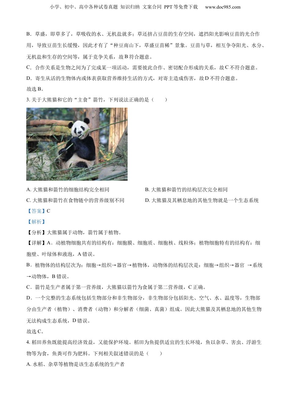 小学、初中、高中各种试卷真题知识归纳文案合同PPT等免费下载www.doc985.com株洲市2022年初中学业水平考试生物试题卷时量:90分钟满分:100分注意事项:1.答题前,请按要求在答题卡上填写好自己的姓名和准考证号。2.答题时,切记答案要填在答题卡上,答在试题卷上的答案无效。3.考试结束后,请将试题卷和答题卡都交给监考老师。一、选择题(以下各题均只有一个最符合题意的答案,每小题2分,共40分)1.下列与生命现象无关的诗句是()A.忽如一夜春风来,千树万树梨花开B.苔痕上阶绿,草色入帘青C.小荷才露尖尖角,早有蜻蜓立上头D.夕阳无限好,只是近黄昏【答案】D【解析】【分析】生物的共同特征有:①生物的生活需要营养;②生物能进行呼吸;③生物能排出身体内产生的废物;④生物能对外界刺激作出反应;⑤生物能生长和繁殖;⑥生物都有遗传和变异的特性;⑦除病毒以外,生物都是由细胞构成的。【详解】A.绿色开花植物的六大器官包括:营养器官(根、茎、叶)和生殖器官(花、果实、种子)。“千树万树梨花开”体现了生物能够繁殖,A错误。B.苔藓植物和草都是绿色植物,具有生命的基本特征,而“苔痕上阶绿,草色入帘青”反映了生物能够生长,B错误。C.荷花是植物,蜻蜓是动物,“小荷才露尖尖角,早有蜻蜓立上头”体现了生物能够生长,C错误。D.“夕阳无限好,只是近黄昏”中没有提到生物,与生命现象无关,D正确。故选D。2.“种豆南山下,草盛豆苗稀。”这句诗中所描述的生物与生物之间的关系()A.捕食B.竞争C.合作D.寄生【答案】B【解析】【分析】生物因素是指影响某种生物生活的其他生物,生物与生物之间的关系常见有:捕食关系、竞争关系、合作关系、寄生关系等。【详解】A.捕食关系是指一种生物以另一种生物为食的关系,故A不符合题意。小学、初中、高中各种试卷真题知识归纳文案合同PPT等免费下载www.doc985.comB.草盛,即草多了,草吸收的水、无机盐就多;草还挤占豆苗的生存空间,遮挡阳光影响豆苗的光合作用,导致豆苗生长缓慢,因此才有了“种豆南山下,草盛豆苗稀”景象。豆苗与草,相互争夺阳光、水分、无机盐和生存的空间等,属于竞争关系,故B符合题意。C.合作关系是生物之间为了完成某一项活动,需要彼此合作、密切配合形成的关系,故C不符合题意。D.寄生从活的生物体内或体表获取营养维持生活的方式,对寄主造成伤害,故D不符合题意。故选B。3.关于大熊猫和它的“主食”箭竹,下列说法正确的是()A.大熊猫和箭竹的细胞结构完全相同B.大熊猫和箭竹的结构层次完全相同C.大熊猫和箭竹在食物链中的营养级别不同D.大熊猫及其栖息地的其他生物就是一个生态系统【答案】C【解析】【分析】大熊猫属于动物,箭竹属于植物。【详解】A.动植物细胞共有的结构有:细胞膜、细胞质、细胞核、线粒体;植物细胞特有的结构有:细胞壁、叶绿体和液泡,A错误。B.植物体的结构层次为:细胞→组织→器官→植物体,动物体的结构层次是:细胞→组织→器官→系统→动物体,B错误。C.箭竹是生产者属于第一营养级,大熊猫以箭竹为食属于第二营养级,C正确。D.一个完整的生态系统包括生物部分和非生物部分,非生物部分包括阳光、空气、水、温度等,生物部分由生产者(植物)、消费者(动物)和分解者(细菌、真菌)组成。因此大熊猫及其栖息地的其他生物无法构成生态系统,D错误。故选C。4.稻田养鱼既能提高经济效益,又能保护环境。稻田为鱼提供适宜的生长环境,鱼以杂草、害虫、浮游生物等为食,鱼粪可作为肥料。下列相关叙述错误的是()A.水稻、杂草等植物是该生态系统的生产者小学、初中、高中各种试卷真题知识归纳文案合同PPT等免费下载www.doc985.comB.能量可沿着水稻→害虫→鱼这条食物链流动C.鱼等动物的存在促进了该生态系统的物质循环D.该稻田比一般稻田生物种类更多,自动调节能力更小【答案】D【解析】【分析】(1)一个完整的生态系统包括生物部分和非生物部分,非生物部分包括阳光、空气、水、温度等,生物部分由生产者(植物)、消费者(动物)和分解者(细菌、真菌)组成。(2)食物链反映的是生产者与消费者之间吃与被吃的关系,所以食物链中不应该出现分...