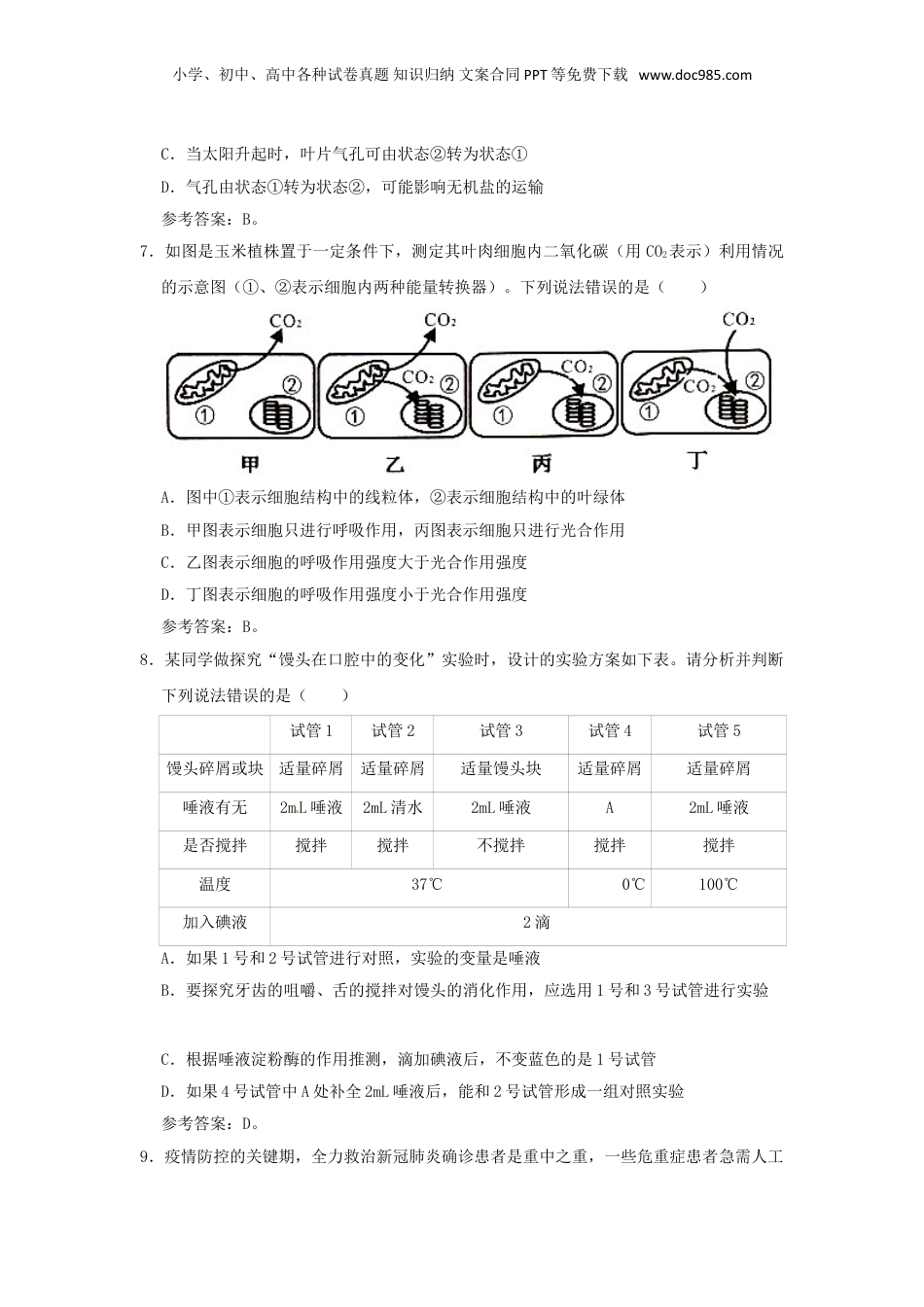 小学、初中、高中各种试卷真题知识归纳文案合同PPT等免费下载www.doc985.com2020年湖南张家界中考生物试题及答案一、单项选择题(共20小题,每小题1分,共计20分)1.“烟雨湿阑干,杏花惊蛰寒”,惊蛰节气前后气温转暖,雨水增多,杏花开放,惊雷惊醒了蛰伏于泥土中冬眠的昆虫。这说明()A.环境影响生物B.环境适应生物C.生物影响环境D.生物适应环境参考答案:A。2.在使用显微镜的过程中,假若你所用的只有以下四个镜头,若想在视野中观察到的细胞数目最多,你认为应选用的镜头组合是()A.①④B.①③C.②④D.②③参考答案:D。3.如图为小明同学在显微镜下观察到的洋葱鳞片叶内表皮细胞和人的口腔上皮细胞,对其结构和功能叙述错误的是()A.甲、乙细胞与细菌细胞相比,有成形的细胞核B.甲、乙细胞中都有与呼吸作用有关的线粒体C.甲细胞中不含叶绿体,不能将光能转变成化学能D.人的成熟的红细胞与乙细胞一样能作为亲子鉴定的原材料参考答案:D。4.四位同学在校园周边调查几种植物之后,依次发表了各自不同的见解,如图示。你认为不正确的是()小学、初中、高中各种试卷真题知识归纳文案合同PPT等免费下载www.doc985.comA.B.C.D.参考答案:C。5.某岛的驻军官兵采用无土栽培的技术生产蔬菜、水果,基本做到自给自足。如图为菜豆种子和运用此技术培育的菜豆幼苗的结构示意图,下列说法错误的是()A.⑤为胚,是新生植物体的幼体,由受精卵发育而来B.②为胚芽,发育成⑦,它在发育过程中所需的营养主要来自④C.①为胚轴,发育成⑧,它在发育过程中所需的营养主要来自⑤D.无土栽培的营养液中含量最多的无机盐是含氮、含磷和含钾的无机盐参考答案:C。6.如图是蚕豆叶下表皮气孔张开和闭合的电镜扫描照片,下列有关叙述错误的是()A.气孔是气体交换的“门户”,水分以气体形式也可以通过气孔散失B.夜幕降临时,叶片大多数气孔呈①状态,蒸腾作用随之减弱小学、初中、高中各种试卷真题知识归纳文案合同PPT等免费下载www.doc985.comC.当太阳升起时,叶片气孔可由状态②转为状态①D.气孔由状态①转为状态②,可能影响无机盐的运输参考答案:B。7.如图是玉米植株置于一定条件下,测定其叶肉细胞内二氧化碳(用CO2表示)利用情况的示意图(①、②表示细胞内两种能量转换器)。下列说法错误的是()A.图中①表示细胞结构中的线粒体,②表示细胞结构中的叶绿体B.甲图表示细胞只进行呼吸作用,丙图表示细胞只进行光合作用C.乙图表示细胞的呼吸作用强度大于光合作用强度D.丁图表示细胞的呼吸作用强度小于光合作用强度参考答案:B。8.某同学做探究“馒头在口腔中的变化”实验时,设计的实验方案如下表。请分析并判断下列说法错误的是()试管1试管2试管3试管4试管5馒头碎屑或块适量碎屑适量碎屑适量馒头块适量碎屑适量碎屑唾液有无2mL唾液2mL清水2mL唾液A2mL唾液是否搅拌搅拌搅拌不搅拌搅拌搅拌温度37℃0℃100℃加入碘液2滴A.如果1号和2号试管进行对照,实验的变量是唾液B.要探究牙齿的咀嚼、舌的搅拌对馒头的消化作用,应选用1号和3号试管进行实验C.根据唾液淀粉酶的作用推测,滴加碘液后,不变蓝色的是1号试管D.如果4号试管中A处补全2mL唾液后,能和2号试管形成一组对照实验参考答案:D。9.疫情防控的关键期,全力救治新冠肺炎确诊患者是重中之重,一些危重症患者急需人工小学、初中、高中各种试卷真题知识归纳文案合同PPT等免费下载www.doc985.com膜肺(ECMO)进行救治。其原理如图所示,下列分析错误的是()A.电动泵的功能相当于心脏B.氧合器中的膜相当于肺泡壁和毛细血管壁C.氧合器内发生的过程相当于外界环境与肺泡间的气体交换D.体外人工膜肺氧合设备使用过程中需要输入营养补充液参考答案:C。10.若把一个成年人的小肠绒毛都展开,它的面积接近半个篮球场大小。如图是一段小肠皱襞及小肠绒毛结构示意图,以下说法错误的是()A.小肠的蠕动能促进食物的消化,帮助营养物质的吸收B.小肠内的消化液中,都含有消化酶C.小肠绒毛壁和绒毛内的毛细血管壁都很薄,由一层细胞构成D.小肠内表面有皱襞,它的表面又有很多小肠绒毛,大大增加了消化...