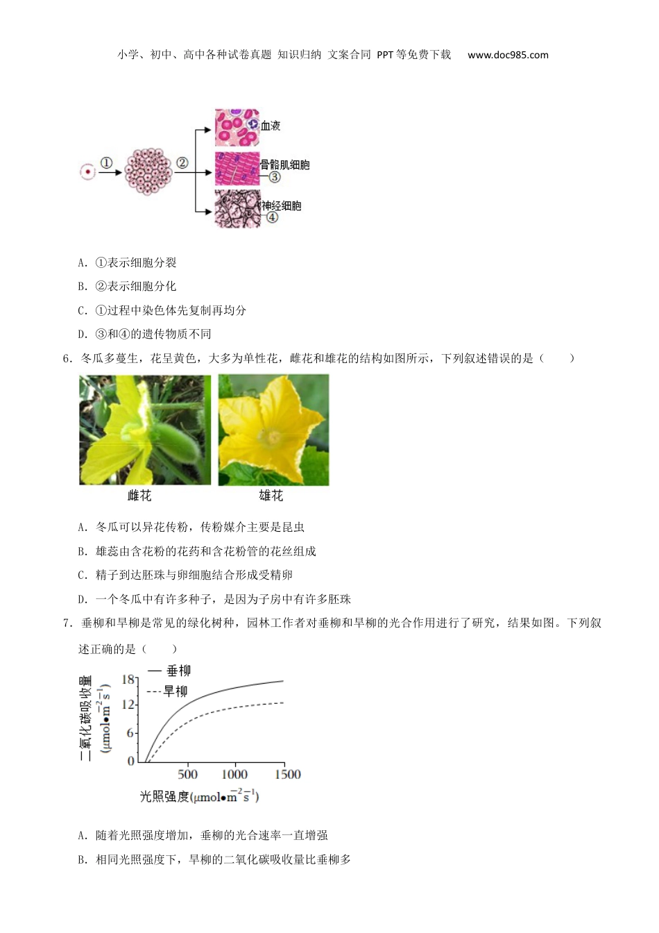 小学、初中、高中各种试卷真题知识归纳文案合同PPT等免费下载www.doc985.com2022年湖南省湘潭市中考生物试卷一、选择题:(每小题2分,共50分)以下各题均只有一个最佳答案。1.“篱落疏疏一径深,树头花落未成阴。儿童急走追黄蝶,飞入菜花无处寻。”诗中的树、儿童、黄蝶、菜都是生物,下列不属于这些生物都具有的特征是()A.能进行呼吸作用B.能进行光合作用C.能排出体内产生的废物D.能对外界刺激作出反应2.乐乐同学利用黑藻叶片制作临时装片并用显微镜观察,下列叙述错误的是()A.用镊子取一片黑藻的幼嫩小叶,放在载玻片上的清水中B.使用显微镜时应先对光,以通过目镜看到明亮的圆形视野为宜C.若将视野中左下方的细胞移至中央,应向左下方移动装片D.将显微镜的放大倍数从50倍调至160倍,视野将变亮3.如图表示可可西里的部分生物构成的食物网,下列叙述正确的是()A.物质和能量沿着食物链和食物网流动B.体内有毒物质积累最多的是狼C.藏羚羊、金雕、高原植物都属于消费者D.若鼠兔数量减少,狼的数量也立即减少4.俗话说“龙生龙、凤生凤”,决定生龙还是生凤的遗传物质主要位于()A.细胞壁B.细胞膜C.细胞质D.细胞核5.人体受精卵经细胞分裂和分化形成多种组织细胞,下列叙述不正确的是()小学、初中、高中各种试卷真题知识归纳文案合同PPT等免费下载www.doc985.comA.①表示细胞分裂B.②表示细胞分化C.①过程中染色体先复制再均分D.③和④的遗传物质不同6.冬瓜多蔓生,花呈黄色,大多为单性花,雌花和雄花的结构如图所示,下列叙述错误的是()A.冬瓜可以异花传粉,传粉媒介主要是昆虫B.雄蕊由含花粉的花药和含花粉管的花丝组成C.精子到达胚珠与卵细胞结合形成受精卵D.一个冬瓜中有许多种子,是因为子房中有许多胚珠7.垂柳和旱柳是常见的绿化树种,园林工作者对垂柳和旱柳的光合作用进行了研究,结果如图。下列叙述正确的是()A.随着光照强度增加,垂柳的光合速率一直增强B.相同光照强度下,旱柳的二氧化碳吸收量比垂柳多小学、初中、高中各种试卷真题知识归纳文案合同PPT等免费下载www.doc985.comC.随着光照强度增加,旱柳释放的氧气比垂柳少D.二氧化碳吸收量为0时,垂柳不进行光合作用8.某成年女性不孕,经查仅由双侧输卵管堵塞引起,则下列描述该患者不会出现的是()A.能产生卵细胞B.能分泌雌性激素C.精子与卵细胞在体内无法结合D.月经将不再出现9.“馒头在口腔中的变化”实验记录如下表,下列叙述不正确的是()编号甲乙丙加入物质馒头碎屑+2毫升唾液馒头碎屑+2毫升清水馒头块+2毫升唾液处理方式充分搅拌充分搅拌不搅拌37℃水浴10分钟后,滴加2滴碘液实验现象不变蓝变蓝部分变蓝A.为缩短实验时间,可将水浴温度调至100℃B.水浴10分钟是因为唾液对淀粉的分解需要一定的时间C.甲、丙两组实验的变量是牙齿的咀嚼和舌的搅拌D.甲、乙两组实验说明唾液能分解淀粉10.人体内肺泡可以与血液发生气体交换,相关叙述错误的是()A.肺泡数目多,扩大了与血液之间进行气体交换的表面积B.肺泡壁和毛细血管壁都是一层扁平的上皮细胞C.通过呼吸作用实现了肺泡与血液之间的气体交换D.血液流经肺部毛细血管时,血液中氧气含量增加11.人体通过排尿不仅能排出废物,也能维持体内水和无机盐的平衡。下列叙述错误的是()小学、初中、高中各种试卷真题知识归纳文案合同PPT等免费下载www.doc985.comA.如果①发生病变,可能出现血尿B.①和②中葡萄糖和无机盐的百分含量基本相同C.②中的液体叫做原尿D.如果出现糖尿,一定是③发生病变12.下列关于血管的叙述错误的是()A.动脉把血液从心脏运送到全身各处B.毛细血管分布最广,内径很小,红细胞单行通过C.血液的流向为静脉→毛细血管→动脉D.手臂上的“青筋”是静脉血管13.网球作为世界上最流行的体育项目之一,一直深受人们青睐。当网球从对方场地传到自己场地时,运动员始终能够看清球的位置,原因是()A.晶状体曲度由小变大B.晶状体曲度由大变小C.瞳孔由大变小,晶状体曲度不变D.瞳孔由小变大,晶状体曲度不变14.冰壶运动被大家喻为冰上的“国际象棋”,它展现动静之美,取舍...