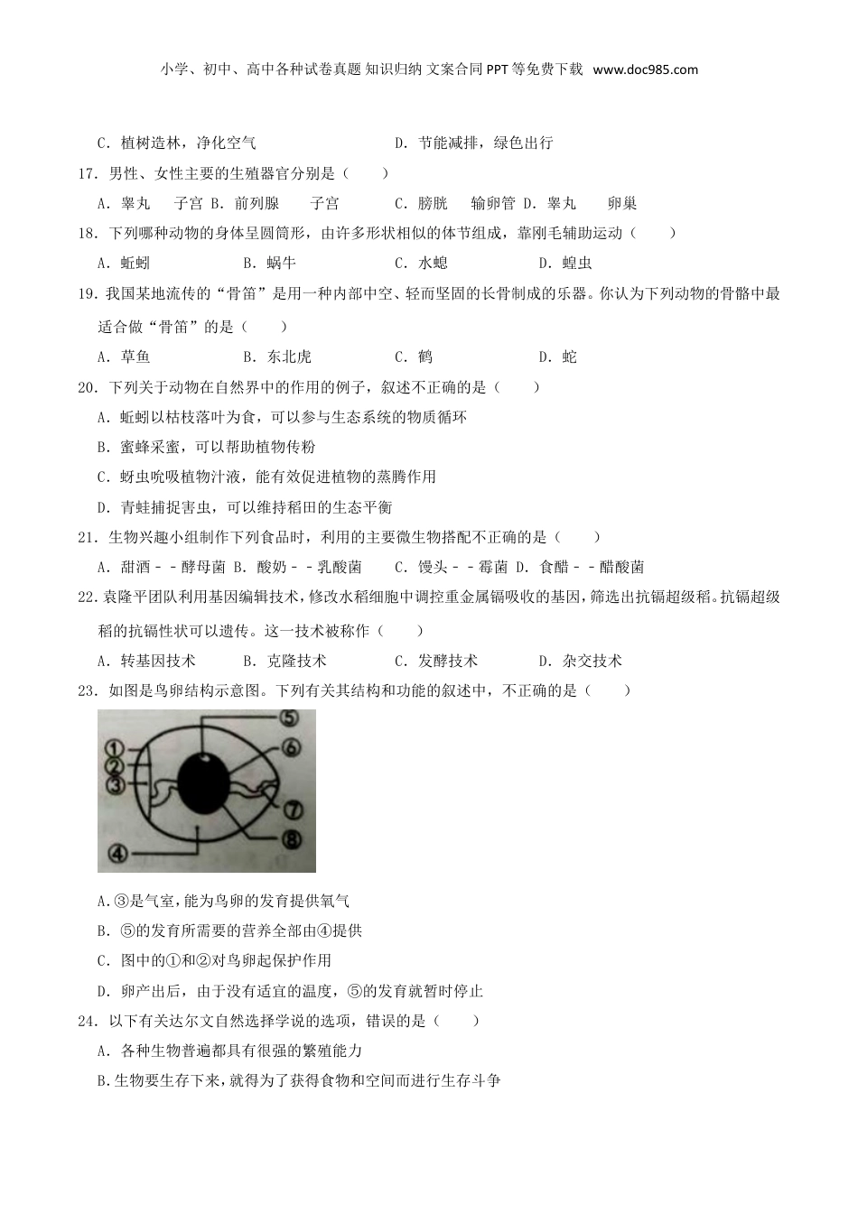 小学、初中、高中各种试卷真题知识归纳文案合同PPT等免费下载www.doc985.com2019年湖南省湘潭市中考生物真题及答案一、选择题:(每小题2分,共50分)以下各题均只有一个最佳答案,请将所选答案的代号用2B铅笔填涂在答题卡上。1.下列选项中,没有体现生物的特征的是()A.二月春风似剪刀B.无心插柳柳成荫C.一母生九子,连母十个样D.葵花朵朵向太阳2.下列食物链正确的是()A.草→鼠→猫B.草→鼠→猫→细菌C.鼠→猫→细菌D.猫→鼠→草3.“江南可采莲,荷叶团田田”,描绘了湘潭县花石的莲田美景。诗句中的“荷叶”是属于哪个层次的结构()A.系统B.器官C.组织D.细胞4.下列关于细胞的活动描述,说法正确的是()A.细胞的分裂首先是从细胞质的一分为二开始的B.细胞分化的结果是形成不同的组织C.细胞分化可以促进细胞分裂和细胞生长D.细胞分裂后细胞核里含有的遗传物质减少了一半5.下列不利于延长稻谷储存期的是()A.干燥环境B.低氧环境C.温暖环境D.无菌环境6.“苔花如米小,也学牡丹开”。诗句中的“苔”是指的植物()A.藻类植物B.苔藓植物C.蕨类植物D.种子植物7.如图为菜豆的一生示意图,下列叙述正确的是()A.①→②过程所需要的有机物由胚乳提供B.③的地上部分由菜豆种子中胚轴发育来C.③→⑤时期会进行开花、传粉、受精等过程D.⑤中有多颗菜豆是因为一朵花中有多个子房8.我国的“嫦娥四号”探测器踏出了人类在月球背面登陆探测的第一步,航天员在太空中吃的午餐包里准小学、初中、高中各种试卷真题知识归纳文案合同PPT等免费下载www.doc985.com备了八宝米饭、酱香鸡肉肠,五香鲽鱼、柠檬茶。根据平衡膳食原则,你认为增加下列哪种食物更加合理()A.黑米炒面B.嫩茎花椰菜C.酱牛肉D.可口可乐9.小李做完血常规检查后,医生说他有炎症,你认为医生是根据血液的哪种成分异常来判断的?()A.血浆B.红细胞C.白细胞D.血小板10.握紧拳头,你可以在手背上找到俗称“青筋”的血管。这些血管不具备的特点是()A.管壁的内面有瓣膜B.管壁较薄、弹性小C.管内血液由远心端流向近心端D.管内流动的血液含氧气较多、颜色鲜红11.行人看到“前方修路,请绕道前行”会改变行走路线,而流浪狗却照样前行。这与人类大脑皮层功能区中特有的哪一中枢有关?()A.语言中枢B.听觉中枢C.感觉中枢D.视觉中枢12.医学人员为了探究眼轴(眼的前后径)长度和视力的关系,依次检查了不同近视程度的志愿者180人的眼轴长度和视力,记录如下表。以下叙述中正确的是()眼轴长度/mm≤26.9927.00~28.4928.50~29.99≥30.00平均视力1.020.960.820.46提示:人眼的正常视力大于1.0A.随着眼轴长度的增加,视力越来越好B.随着眼轴长度的增加,视力越来越差C.眼轴长度与视力好坏没有明显的相关性D.眼轴长度≥30.00mm的志愿者需要佩戴凸透镜进行矫正13.长时间戴耳机会损伤听觉感受器,造成听力下降。听觉感受器位于哪一结构内?()A.鼓膜B.外耳道C.耳蜗D.咽鼓管14.某位老人走路时经常会出现膝盖疼痛的现象,经检查确诊后,医生在他的膝关节腔内注射了玻璃酸钠溶液,症状很快得到缓解。你认为注射的玻璃酸钠溶液的作用相当于关节内的()A.滑液B.关节软骨C.韧带D.关节囊15.珍妮•古道尔在非洲原始丛林中观察到成年黑猩猩可以折断树枝并从蚁穴钓取白蚁吃。从动物行为的获得途径上分析,下列实例与上述行为类型相同的是()A.春蚕吐丝结茧B.猕猴向游客讨要食物C.大熊猫幼崽吸吮乳汁D.机器人学下棋16.“绿水青山就是金山银山”。下列选项中不符合此理念的是()A.垃圾分类,变废为宝B.围湖造田,扩展耕地小学、初中、高中各种试卷真题知识归纳文案合同PPT等免费下载www.doc985.comC.植树造林,净化空气D.节能减排,绿色出行17.男性、女性主要的生殖器官分别是()A.睾丸子宫B.前列腺子宫C.膀胱输卵管D.睾丸卵巢18.下列哪种动物的身体呈圆筒形,由许多形状相似的体节组成,靠刚毛辅助运动()A.蚯蚓B.蜗牛C.水螅D.蝗虫19.我国某地流传的“骨笛”是用一种内部中空、轻而坚固的长骨制成的乐器。你认为下列动物的骨骼中最适合做“骨...