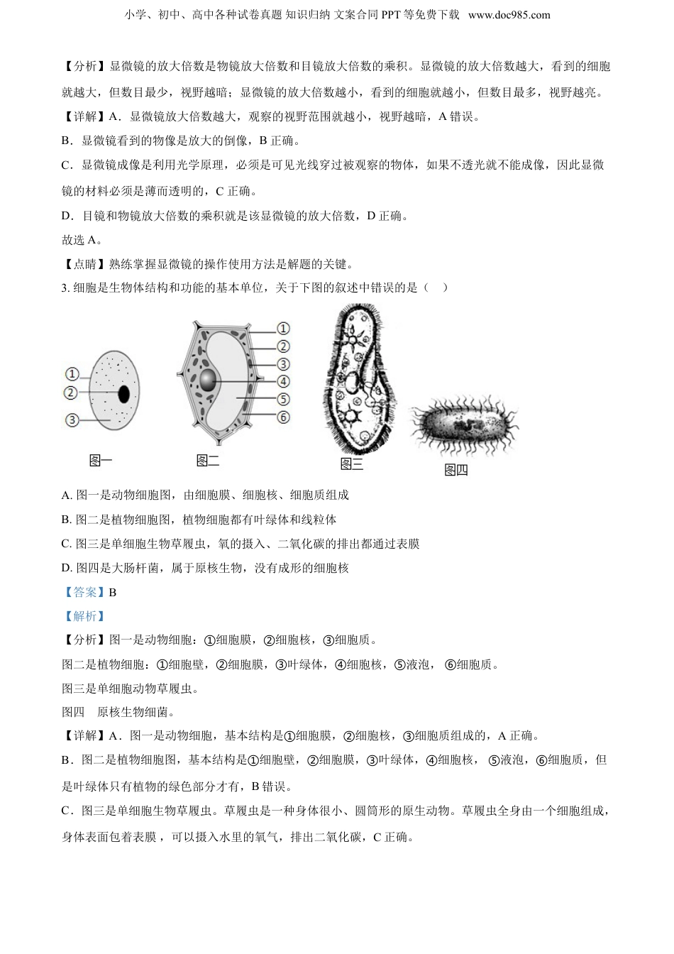 小学、初中、高中各种试卷真题知识归纳文案合同PPT等免费下载www.doc985.com娄底市2021年初中毕业生物学业考试试题一、选择题1.初夏的水府庙公园,景色宜人。你看:风吹芦苇,水草依依,随风摇曳;鱼儿在水草间嬉戏;野鸭子追逐着小鱼,专注着寻觅着美食。赏此美景,勿忘所学,你该知道()A.水府庙湿地公园属于森林生态系统B.该生态系统具有自动调节能力,能够永远保持生态平衡C.水府庙湿地公园中的鱼儿、野鸭属于生态系统中的消费者D.在水草→小鱼→野鸭这条食物链中,野鸭的能量最多【答案】C【解析】【分析】(1)一个完整的生态系统包括生物部分和非生物部分,非生物部分包括阳光、空气、水、温度等,生物部分由生产者(植物)、消费者(动物)和分解者(细菌、真菌)组成。(2)食物链反映的是生产者与消费者,消费者与消费者之间吃与被吃的关系,所以食物链中不应该出现分解者和非生物部分。食物链的正确写法是:生产者→初级消费者→次级消费者…注意起始点是生产者。【详解】A.水府庙湿地公园属于湿地生态系统,具有净化水源、蓄洪抗旱的作用,因此被称为“地球之肾”。森林生态系统在涵养水源、保持水土、防风固沙、调节气候、净化空气、消除污染等方面起着重要作用,有“地球之肾”之称,故A不符合题意。B.在一般情况下,生态系统中各种生物的数量和所占的比例总是维持在相对稳定的,这说明生态系统具有一定的自动调节能力,但这种调节能力有一定限度的,当人为的或自然因素的干扰超过了这种限度时,生态系统就会遭到破坏,故B不符合题意。C.水府庙湿地公园中的鱼儿、野鸭属于动物,是生态系统中的消费者,直接或间接以绿色植物为食,不能进行光合作用制造有机物,故C符合题意。D.在食物链中,起点是生产者,数量最多,能为植物本身和其它生物提供物质和能量,所以在水草→小鱼→野鸭这条食物链中,水草的能量最多,故D不符合题意。故选C。【点睛】解题的关键是理解生态系统的组成,食物链的结构,生态系统的调节能力。2.“工欲善其事,必先利其器”。为了更好地观察细胞,七(一)班的学生在课堂上了解和使用了显微镜。课后有几位同学饶有兴趣地在讨论,你反对的是()A.放大倍数越大视野越明亮B.显微镜看到的物像是倒像C.显微镜观察的材料一定要薄而透明D.显微镜放大的倍数是目镜和物镜放大倍数的乘积【答案】A【解析】小学、初中、高中各种试卷真题知识归纳文案合同PPT等免费下载www.doc985.com【分析】显微镜的放大倍数是物镜放大倍数和目镜放大倍数的乘积。显微镜的放大倍数越大,看到的细胞就越大,但数目最少,视野越暗;显微镜的放大倍数越小,看到的细胞就越小,但数目最多,视野越亮。【详解】A.显微镜放大倍数越大,观察的视野范围就越小,视野越暗,A错误。B.显微镜看到的物像是放大的倒像,B正确。C.显微镜成像是利用光学原理,必须是可见光线穿过被观察的物体,如果不透光就不能成像,因此显微镜的材料必须是薄而透明的,C正确。D.目镜和物镜放大倍数的乘积就是该显微镜的放大倍数,D正确。故选A。【点睛】熟练掌握显微镜的操作使用方法是解题的关键。3.细胞是生物体结构和功能的基本单位,关于下图的叙述中错误的是()A.图一是动物细胞图,由细胞膜、细胞核、细胞质组成B.图二是植物细胞图,植物细胞都有叶绿体和线粒体C.图三是单细胞生物草履虫,氧的摄入、二氧化碳的排出都通过表膜D.图四是大肠杆菌,属于原核生物,没有成形的细胞核【答案】B【解析】【分析】图一是动物细胞:①细胞膜,②细胞核,③细胞质。图二是植物细胞:①细胞壁,②细胞膜,③叶绿体,④细胞核,⑤液泡,⑥细胞质。图三是单细胞动物草履虫。图四是原核生物细菌。【详解】A.图一是动物细胞,基本结构是①细胞膜,②细胞核,③细胞质组成的,A正确。B.图二是植物细胞图,基本结构是①细胞壁,②细胞膜,③叶绿体,④细胞核,⑤液泡,⑥细胞质,但是叶绿体只有植物的绿色部分才有,B错误。C.图三是单细胞生物草履虫。草履虫是一种身体很小、圆筒形的原生动物。草履虫全身由一个细胞组成,身体表面包着表膜,可以摄入水里的氧气,排出二氧化碳,C正确。小学、初中、高...