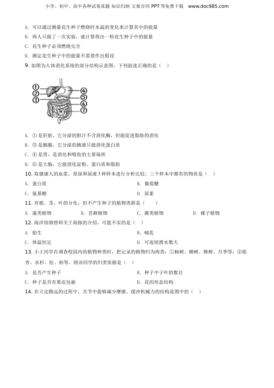 小学、初中、高中各种试卷真题知识归纳文案合同PPT等免费下载www.doc985.com娄底市2020年初中毕业学业考试试题卷生地综合(生物)一、选择题1.“红豆生南国,春来发几枝”体现的生物特征是()A.遗传B.繁殖C.生长D.变异2.关于食物链的书写,正确的是()A.阳光→草→羊B.昆虫→青蛙→蛇→鹰C.草→鼠→蛇→鹰D.草→羊→狼→细菌3.小熊和萌萌对眼虫是植物还是动物的问题激烈辩论:小熊认为眼虫有眼点能感光、有鞭毛能运动,应属于动物;萌萌认为眼虫有叶绿体能进行光合作用,应属于植物。你认为()A.小熊有理B.萌萌有理C.两人都对D.最好与变形虫、衣藻等生物单列一类4.小羊“多莉”的克隆成功说明()A.细胞核控制生物的发育和遗传B.细胞核控制细胞物质的进出C.细胞核是能量转换器D.细胞核是细胞进行生命活动的主要场所5.“构建人类命运共同体”彰显中国智慧,对此理解不合理的是()A.地球是包括人类在内的所有生物的共同家园B.保护生物圈是全人类的共同责任C.各国应将本国资源无条件地分享给世界D.一个国家过量的碳排放会加剧全球的温室效应6.图所示曲线表示人体血液流经某器官时氧气含量的变化情况,则该器官是()A.骨骼肌B.肺C.小肠D.肾7.关于胎儿获得营养物质的途径,下列顺序正确的是()A.脐带→胎盘→母体→胎儿B.母体→胎盘→脐带→胎儿C.胎盘→脐带→母体→胎儿D.母体→脐带→胎盘→胎儿8.小明和小红一起测定花生种子中的能量,不科学的是()小学、初中、高中各种试卷真题知识归纳文案合同PPT等免费下载www.doc985.comA.可以通过测量花生种子燃烧时水温的变化来计算其中的能量B.两人只做了一次实验,就计算得出一粒花生种子中的能量C.花生种子必须燃烧完全D.测定花生种子中的能量不需要作出假设9.如图为人体消化系统的部分结构示意图。下列叙述正确的是()A.①是肝脏,它分泌的胆汁不含消化酶,但能促进脂肪的消化B.⑤是胰腺,它分泌的胰液只能消化蛋白质C.④是胃,是消化和吸收的主要场所D.⑥是大肠,它能消化淀粉、蛋白质和脂肪10.取健康人的血浆、原尿和尿液3种样本进行分析比较,三个样本中都有的物质是()A.蛋白质B.葡萄糖C.氨基酸D.尿素11.有根、茎、叶的分化,但不产生种子的植物类群是()A.藻类植物B.苔藓植物C.蕨类植物D.裸子植物12.海洋馆驯兽师关于海豚的介绍,可能不实的是()A.胎生B.哺乳C.体温恒定D.可连续潜水数天13.小王同学在调查校园内的植物种类时,把记录的植物归为两类:①杨树、柳树、樟树、月季等;②银杏、水杉、松、柏等。则该同学的归类依据是()A.是否产生种子B.种子中子叶的数目C.种子是否有果皮包被D.花的形态结构14.在立定跳远的过程中,关节中能够减少摩擦、缓冲机械力的结构是图中的()小学、初中、高中各种试卷真题知识归纳文案合同PPT等免费下载www.doc985.comA.①B.②C.④D.⑤15.“风轻粉蝶喜,花暖蜜蜂喧”直接体现了动物在生物圈中()A.对于维持生态平衡起重要作用B.可以促进物质循环C.可以帮助植物传粉D.可以帮助植物传播种子16.下列方式中,属于有性生殖的是()A.水螅的出芽生殖B.土豆用块茎繁殖C.真菌散发孢子D.水稻产生种子17.黄粉虫又叫“面包虫”,被誉为“蛋白质饲料库”,可以直接食用,干燥的黄粉虫的蛋白质含量:幼虫40%、蛹57%、成虫60%,故作为宇航员在太空的肉源食品之一。它的发育过程经历了()A.受精卵→蛹→幼虫→成虫四个时期B.卵→蛹→成虫三个时期C.受精卵→幼虫→蛹→成虫四个时期D.卵→幼虫→成虫三个时期18.新冠肺炎肆虐全球,我国的抗疫战斗取得决定性胜利,为世界提供了宝贵经验。新冠病毒从传染病学和免疫学的角度来看,分别属于()A.传染源和抗体B.病原体和抗原C.抗原和疫苗D.抗原和病原体19.“良药苦口利于病”,正确用药对于治疗疾病非常重要,下列做法不正确的是()A.病情稍有好转就自行停止用药,以避免药物的副作用加剧B.非处方药可自己到医药超市购买C.用药前要仔细阅读药品说明书D.处方药须按医嘱服用20.在脊椎动物中,体外受精、体外发育的是()A.鱼类和两栖类B.两栖类和爬行类C.爬行类和鸟类D.鸟类和哺乳类21.用显微镜观察植物细胞时,从甲图到乙图正确的步骤是()小学、初中、...