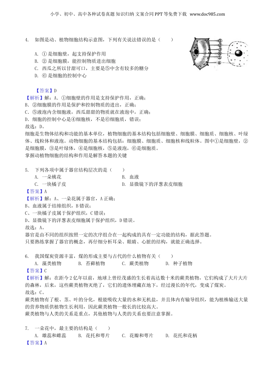 小学、初中、高中各种试卷真题知识归纳文案合同PPT等免费下载www.doc985.com2018年湖南省衡阳市中考生物真题及答案一、选择题(本大题共25小题,共50.0分)1.下列属于生物的是()A.钟乳石B.机器人C.七星瓢虫D.无机盐【答案】C【解析】解:ABD、钟乳石、机器人、无机盐不具有生物的特征,不属于生物;C、七星瓢虫具有生物的特征,属于生物。因此,选项C符合题意。故选:C。生物的共同特征有:①生物的生活需要营养;②生物能进行呼吸;③生物能排出身体内产生的废物;④生物能对外界刺激作出反应;⑤生物能生长和繁殖;⑥生物都有遗传和变异的特性;⑦除病毒以外,生物都是由细胞构成的。解此题的关键是理解生物的特征。2.下列叙述中,属于生物因素对生物的影响是()A.千里之堤,溃于蚁穴B.雨露滋润禾苗壮C.草盛豆苗稀D.人间四月芳菲尽,山寺桃花始盛开【答案】C【解析】解:A、千里之堤,溃于蚁穴,表明生物能影响环境,故该选项错误。B、“雨露滋润禾苗壮”,体现了非生物因素水对生物的影响,故该选项错误。C、“草盛豆苗稀”,体现了生物因素草对生物豆苗的影响,草与豆苗,相互争夺阳光、水分、无机盐和生存的空间,属于竞争关系,故该选项正确。D、“人间四月芳菲尽,山寺桃花始盛开”体现了非生物因素温度对生物的影响,故该选项错误。故选:C。环境中影响生物生活的各种因素叫环境因素,分为非生物因素和生物因素。非生物因素包括:光、温度、水、空气、土壤等。生物因素是指环境中影响某种生物个体生活的其他所有生物,包括同种和不同种的生物个体。解答此类题目的关键是熟记生物因素的概念。3.用显微镜观察时,发现有污点,如果转动目镜或移动玻片标本,都不能把视野中的污点移走,则污点在()A.目镜上B.物镜上C.玻片标本上D.反光镜上【答案】B【解析】解:用显微镜观察时,如果调换目镜和移动玻片标本,都不能将视野中的污点移走,表明污点不在目镜和玻片标本上,则可以判定污点在镜上。故选:B。(1)显微镜视野中污点的位置只有三种可能,目镜、物镜或玻片标本。(2)判断的方法是转动目镜或移动玻片。转动目镜污点动就在目镜,不动就不在目镜;移动载玻片,污点移动就在载玻片,不动就不在载玻片;如果不在目镜和载玻片,那就一定在物镜上。解答此类题的关键是理解掌握判断视野中污点位置的方法。小学、初中、高中各种试卷真题知识归纳文案合同PPT等免费下载www.doc985.com4.如图是动、植物细胞结构示意图,下列有关说法错误的是()A.①是细胞壁,起支持保护作用B.②是细胞膜,能控制物质进出细胞C.西瓜之所以甘甜可口,主要是⑤中含有较多的糖分D.⑥是细胞的控制中心【答案】D【解析】解:A.①细胞壁的作用是支持保护作用,正确;B.②细胞膜的作用是保护和控制物质的进出,正确;C.⑤液泡内含细胞液,西瓜甜甜的物质就在液泡中,正确;D.细胞的控制中心是④细胞核,不是⑥细胞质,错误;故选:D。细胞是生物体结构和功能的基本单位,植物细胞的基本结构包括细胞壁、细胞膜、细胞质、细胞核、叶绿体、线粒体和液泡。动物细胞的基本结构包括:细胞膜、细胞质、细胞核和线粒体。图中①是细胞壁,②是细胞膜,③是叶绿体,④是细胞核,⑤是液泡,⑥是细胞质。掌握动植物细胞的结构和作用是解答本题的关键5.下列各项中属于器官结构层次的是()A.一朵桃花B.血液C.一块橘子皮D.显微镜下的洋葱表皮细胞【答案】A【解析】解:A、一朵花属于器官,A正确;B、血液属于结缔组织,B错误;C、一块橘子皮属于保护组织,C错误;D、显微镜下的洋葱表皮细胞属于保护组织,D错误。故选:A。器官是由不同的组织按照一定的次序组合在一起构成的具有一定功能的结构,据此答题。只要熟练掌握了器官的概念,再仔细分析耳朵、眼睛、心脏的结构,就能正确选择。6.我国煤炭资源丰富,煤的形成主要与古代的什么植物有关()A.藻类植物B.苔藓植物C.蕨类植物D.种子植物【答案】C【解析】解:在距今2亿年以前,地球上曾经茂盛的生长着高达数十米的蕨类植物,它们构成了大片大片的森林,后来,这些蕨类植物灭绝了,它们的遗体埋藏在地下,经过漫长的年代,变成了煤炭。故选:C。蕨类植物有了...