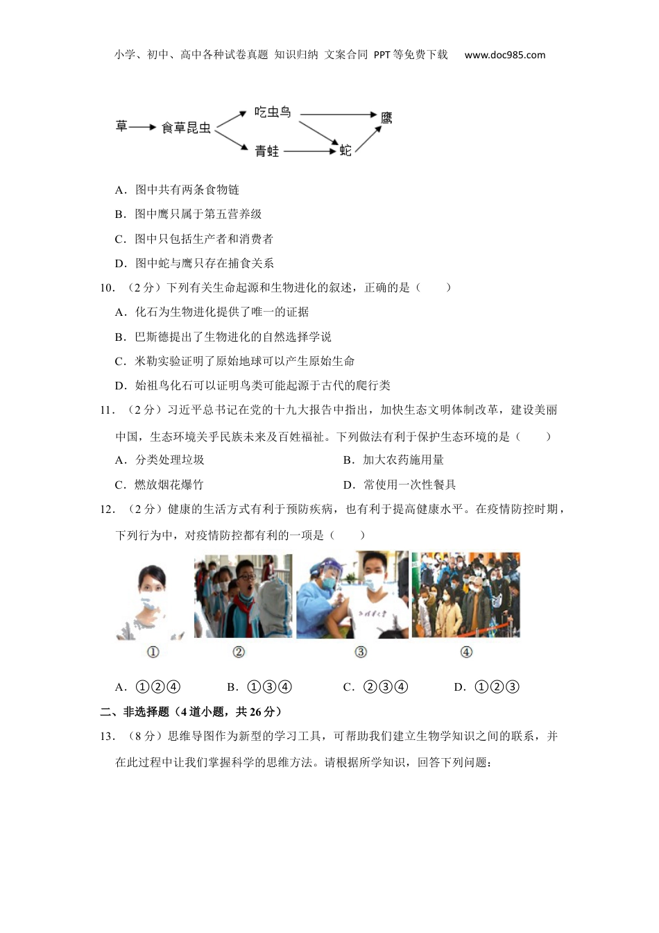 小学、初中、高中各种试卷真题知识归纳文案合同PPT等免费下载www.doc985.com2022年湖南省永州市中考生物试卷一、选择题(12道小题,每小题只有一个选项符合题意。每小题2分,共24分)1.(2分)蚯蚓的钻穴和取食等活动可使土壤变得更加疏松,故有“活犁耙”的美称,这一实例说明生物与环境的关系是()A.生物能够影响环境B.生物能够适应环境C.环境能够影响生物D.环境能够适应生物2.(2分)显微镜是一种具有放大功能的仪器,是生物学实验中常用的探究器具。下面为显微镜使用的几个主要操作步骤,操作顺序正确的一项是()①取用显微镜②放置“标本”③粗调节④对光A.①②③④B.②①③④C.①③④②D.①④②③3.(2分)某生物兴趣小组四位同学进行识图说结构名称的游戏。识别正确的同学是()A.小兰说:图丁中的③是花药B.小伍说:图乙中的②是形成层C.小辉说:图丙中的①是子叶D.小红说:图甲中的④是成熟区4.(2分)以下是绿色植物光合作用和呼吸作用相关联的公式:下列有关叙述正确的是()①+水有机物+②①+水+能量A.公式中的有机物通过导管运输小学、初中、高中各种试卷真题知识归纳文案合同PPT等免费下载www.doc985.comB.公式中②表示的物质是二氧化碳C.减少物质①,公式中的有机物一定会增加D.公式中的能量是通过分解有机物释放出来的5.(2分)生物世界绚丽多彩、奥妙无穷。下列有关生物体结构层次的叙述,正确的是()A.组织是海龟结构和功能的基本单位B.与人体相比,玉米植株不具有系统这一结构层次C.细菌具有细胞壁、细胞膜、细胞质和细胞核等结构D.单细胞生物不能独立完成营养、呼吸、生殖等各种生命活动6.(2分)如下表列举了部分动物的相关知识,正确的一项是()选项动物主要运动结构主要运动形式生活环境A蜜蜂翅飞行空中、陆地B家燕翼爬行空中、陆地C鲫鱼四肢游泳水中D蜥蜴足爬行水中A.AB.BC.CD.D7.(2分)下列有关人的生殖和发育的叙述,正确的是()A.精卵在子宫中相遇并结合B.受精卵是人个体发育的起点C.进入青春期开始出现性别差异D.进入青春期代谢速度逐步减慢8.(2分)下列有关人体生命活动调节的叙述,正确的是()A.视觉形成于视网膜B.膝跳反射属于条件反射C.耳蜗里有听觉感受器,能感受声波信息D.脑干的主要功能是维持身体的平衡,调节和协调肌肉的运动9.(2分)如图为某草原生态系统中部分食物网的示意图。下列有关叙述正确的是(小学、初中、高中各种试卷真题知识归纳文案合同PPT等免费下载www.doc985.comA.图中共有两条食物链B.图中鹰只属于第五营养级C.图中只包括生产者和消费者D.图中蛇与鹰只存在捕食关系10.(2分)下列有关生命起源和生物进化的叙述,正确的是()A.化石为生物进化提供了唯一的证据B.巴斯德提出了生物进化的自然选择学说C.米勒实验证明了原始地球可以产生原始生命D.始祖鸟化石可以证明鸟类可能起源于古代的爬行类11.(2分)习近平总书记在党的十九大报告中指出,加快生态文明体制改革,建设美丽中国,生态环境关乎民族未来及百姓福祉。下列做法有利于保护生态环境的是()A.分类处理垃圾B.加大农药施用量C.燃放烟花爆竹D.常使用一次性餐具12.(2分)健康的生活方式有利于预防疾病,也有利于提高健康水平。在疫情防控时期,下列行为中,对疫情防控都有利的一项是()A.①②④B.①③④C.②③④D.①②③二、非选择题(4道小题,共26分)13.(8分)思维导图作为新型的学习工具,可帮助我们建立生物学知识之间的联系,并在此过程中让我们掌握科学的思维方法。请根据所学知识,回答下列问题:小学、初中、高中各种试卷真题知识归纳文案合同PPT等免费下载www.doc985.com(1)图中①的名称是。(2)图中生物a与生物b相比,生物a的种子外面无包被。(3)大鲵是我国特有的动物,属于图中②,其幼体和成体在形态结构、生活习性等方面存在显著差异。这种发育类型称为发育。(4)我国劳动人民在劳动过程中积累了大量的技艺,并代代流传下来。例如《齐民要术》中提到利用荫坑贮存来酿制葡萄酒的方法,其酿制酒酿的过程中主要用到的微生物是图中的(填“乳酸菌”或“酵母菌”)。14.(6...