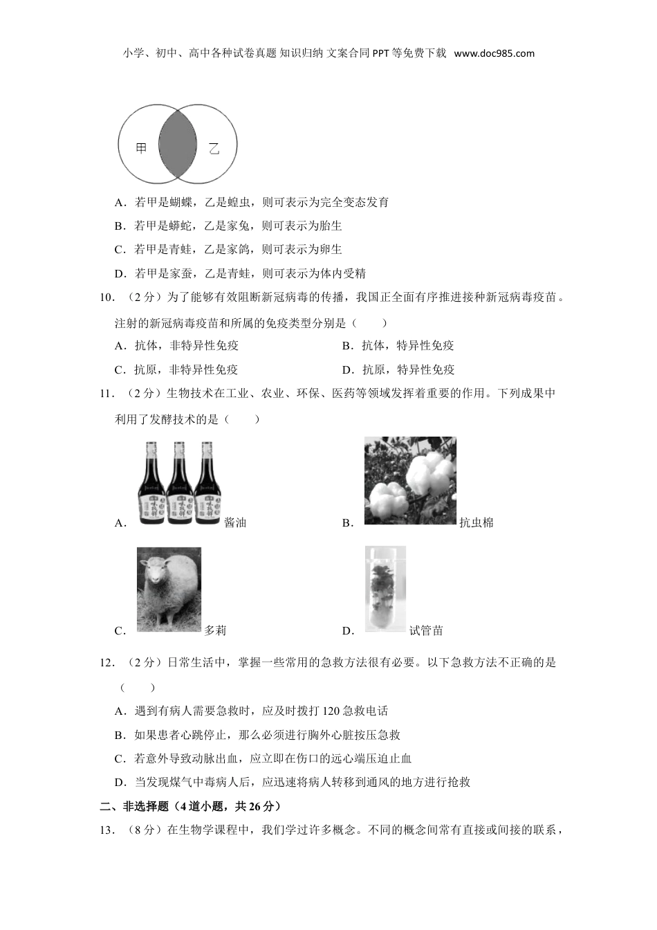 小学、初中、高中各种试卷真题知识归纳文案合同PPT等免费下载www.doc985.com2021年湖南省永州市中考生物试卷一、选择题(12道小题,每小题只有一个选项符合题意。每小题2分,共24分)1.(2分)竹节虫不活动时看上去像小树枝不易被发现,这体现了生物与环境的关系是()A.环境能够影响生物B.生物能够影响环境C.环境能够适应生物D.生物能够适应环境2.(2分)如图是显微镜结构图,下列叙述错误的是()A.光线亮时可使用⑦的平面镜对光B.使用①转换不同倍数的物镜C.能放大物像的结构是③④D.转动⑥可使物像变清晰3.(2分)“杂交水稻之父”袁隆平院士有两个梦想:“禾下乘凉梦”、“杂交水稻覆盖全球梦”。下列有关水稻的叙述正确的是()A.当土壤溶液浓度大于根细胞液浓度时,水稻的根处于吸水状态B.当具有一定的水、充足的空气和适宜的温度时,水稻种子都能萌发C.水稻叶片在光下通过光合作用产生的有机物只有淀粉D.水稻根吸收的水主要以水蒸气的形式由叶的气孔散失到大气中4.(2分)人体听觉形成顺序正确的是()①耳蜗②外耳道③听小骨④鼓膜⑤大脑皮层小学、初中、高中各种试卷真题知识归纳文案合同PPT等免费下载www.doc985.com⑥听觉神经A.②④③①⑤⑥B.②④③①⑥⑤C.②①④③⑤⑥D.②④①③⑥⑤5.(2分)如表为某同学对四种生物主要特征的描述,其中正确的是()选项生物名称主要特征A酵母菌没有成形的细胞核B腺病毒由蛋白质外壳和内部的营养物质组成C蕨有根、茎、叶和种子D人蛔虫身体不分节,消化道有口有肛门A.AB.BC.CD.D6.(2分)“灵山秀水,和美阳明”。永州市阳明山是国家森林公园,其内拥有野生动物177种,种子植物1709种,药用植物700多种,这体现了()A.物种多样性B.遗传多样性C.生态系统多样性D.生活环境多样性7.(2分)下列关于生命起源和生物进化的叙述,错误的是()A.生命起源的化学演化学说逐渐为大多数人所认同B.越复杂、越高等的生物化石总是出现在越古老的地层里C.人类进化过程中脑容量的逐渐增加是最显著的变化之一D.对同种生物而言,具有有利变异的个体容易在生存斗争中获胜,并繁殖后代8.(2分)下列有关食物链“草→鼠→蛇→鹰”的叙述,错误的是()A.该食物链中,鹰获得的能量和有毒物质最少B.鹰体内的能量最终来源于太阳能C.该食物链包括生产者和消费者,不包括分解者D.该食物链中,蛇和鼠之间是捕食关系9.(2分)如图阴影部分表示甲、乙两种动物生殖和发育的共同特征。下列有关阴影部分的叙述正确的是()小学、初中、高中各种试卷真题知识归纳文案合同PPT等免费下载www.doc985.comA.若甲是蝴蝶,乙是蝗虫,则可表示为完全变态发育B.若甲是蟒蛇,乙是家兔,则可表示为胎生C.若甲是青蛙,乙是家鸽,则可表示为卵生D.若甲是家蚕,乙是青蛙,则可表示为体内受精10.(2分)为了能够有效阻断新冠病毒的传播,我国正全面有序推进接种新冠病毒疫苗。注射的新冠病毒疫苗和所属的免疫类型分别是()A.抗体,非特异性免疫B.抗体,特异性免疫C.抗原,非特异性免疫D.抗原,特异性免疫11.(2分)生物技术在工业、农业、环保、医药等领域发挥着重要的作用。下列成果中利用了发酵技术的是()A.酱油B.抗虫棉C.多莉D.试管苗12.(2分)日常生活中,掌握一些常用的急救方法很有必要。以下急救方法不正确的是()A.遇到有病人需要急救时,应及时拨打120急救电话B.如果患者心跳停止,那么必须进行胸外心脏按压急救C.若意外导致动脉出血,应立即在伤口的远心端压迫止血D.当发现煤气中毒病人后,应迅速将病人转移到通风的地方进行抢救二、非选择题(4道小题,共26分)13.(8分)在生物学课程中,我们学过许多概念。不同的概念间常有直接或间接的联系,小学、初中、高中各种试卷真题知识归纳文案合同PPT等免费下载www.doc985.com用一些关联词把一些相关的概念联系起来,可绘制成概念图。请你根据所学知识,完成下列概念图。(1)细胞质中的是完成生理活动①的主要场所。(2)某同学的手不小心碰触到了高温物体,他立即做出屈肘动作把手缩回来,此时肱三头肌处于(填“收缩”或“舒张”)状态。这种生来就有...