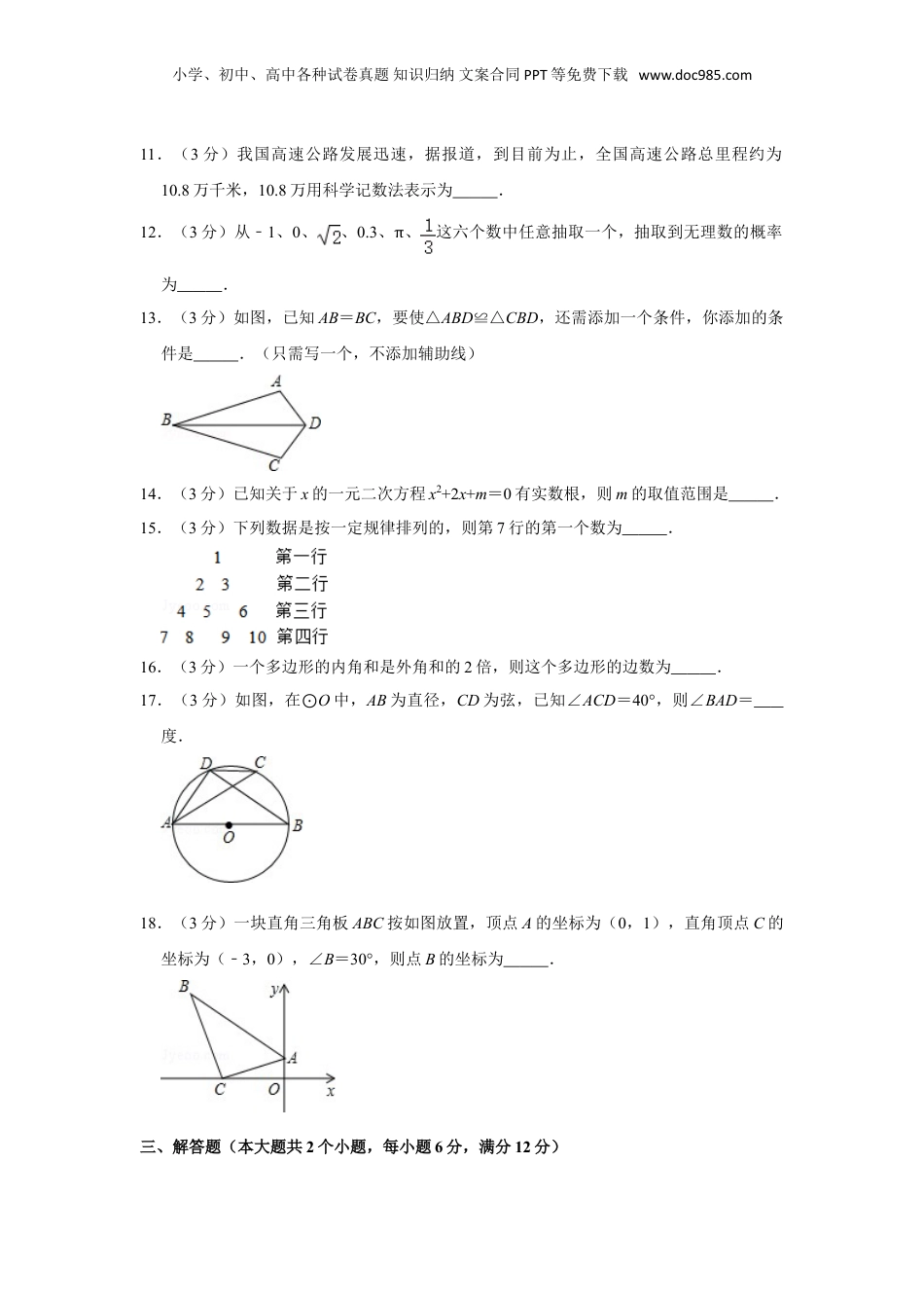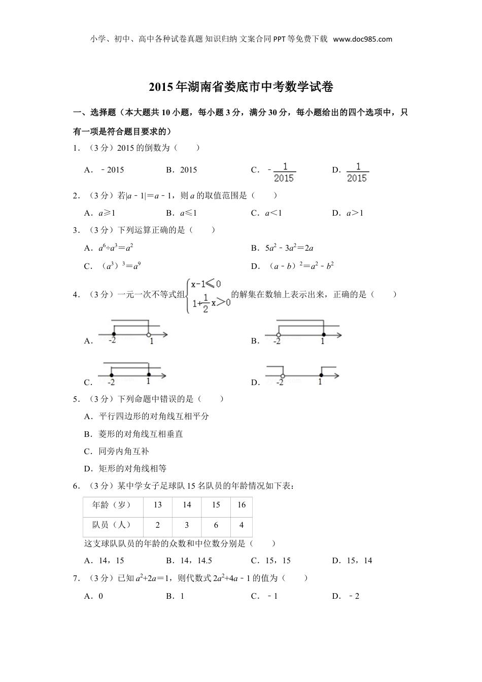 小学、初中、高中各种试卷真题知识归纳文案合同PPT等免费下载www.doc985.com2015年湖南省娄底市中考数学试卷一、选择题(本大题共10小题,每小题3分,满分30分,每小题给出的四个选项中,只有一项是符合题目要求的)1.(3分)2015的倒数为()A.﹣2015B.2015C.﹣D.2.(3分)若|a﹣1|=a﹣1,则a的取值范围是()A.a≥1B.a≤1C.a<1D.a>13.(3分)下列运算正确的是()A.a6÷a3=a2B.5a2﹣3a2=2aC.(a3)3=a9D.(a﹣b)2=a2﹣b24.(3分)一元一次不等式组的解集在数轴上表示出来,正确的是()A.B.C.D.5.(3分)下列命题中错误的是()A.平行四边形的对角线互相平分B.菱形的对角线互相垂直C.同旁内角互补D.矩形的对角线相等6.(3分)某中学女子足球队15名队员的年龄情况如下表:年龄(岁)13141516队员(人)2364这支球队队员的年龄的众数和中位数分别是()A.14,15B.14,14.5C.15,15D.15,147.(3分)已知a2+2a=1,则代数式2a2+4a﹣1的值为()A.0B.1C.﹣1D.﹣2小学、初中、高中各种试卷真题知识归纳文案合同PPT等免费下载www.doc985.com8.(3分)如图,正三棱柱的主视图为()A.B.C.D.9.(3分)反比例函数y=﹣的图象上有两点P1(x1,y1),P2(x2,y2),若x1<0<x2,则下列结论正确的是()A.y1<y2<0B.y1<0<y2C.y1>y2>0D.y1>0>y210.(3分)如图,挂在弹簧秤上的长方体铁块浸没在水中,提着弹簧秤匀速上移,直至铁块浮出水面停留在空中(不计空气阻力),弹簧秤的读数F(kg)与时间t(s)的函数图象大致是()A.B.C.D.二、填空题(本大题共8小题,每小题3分,满分24分)小学、初中、高中各种试卷真题知识归纳文案合同PPT等免费下载www.doc985.com11.(3分)我国高速公路发展迅速,据报道,到目前为止,全国高速公路总里程约为10.8万千米,10.8万用科学记数法表示为.12.(3分)从﹣1、0、、0.3、π、这六个数中任意抽取一个,抽取到无理数的概率为.13.(3分)如图,已知AB=BC,要使△ABD≌△CBD,还需添加一个条件,你添加的条件是.(只需写一个,不添加辅助线)14.(3分)已知关于x的一元二次方程x2+2x+m=0有实数根,则m的取值范围是.15.(3分)下列数据是按一定规律排列的,则第7行的第一个数为.16.(3分)一个多边形的内角和是外角和的2倍,则这个多边形的边数为.17.(3分)如图,在⊙O中,AB为直径,CD为弦,已知∠ACD=40°,则∠BAD=度.18.(3分)一块直角三角板ABC按如图放置,顶点A的坐标为(0,1),直角顶点C的坐标为(﹣3,0),∠B=30°,则点B的坐标为.三、解答题(本大题共2个小题,每小题6分,满分12分)小学、初中、高中各种试卷真题知识归纳文案合同PPT等免费下载www.doc985.com19.(6分)计算:(﹣1.414)0+()﹣1﹣+2cos30°.20.(6分)先化简,再求值:•+,其中x是从﹣1、0、1、2中选取的一个合适的数.四、解答题(本大题共2小题,每小题8分,满分16分)21.(8分)今年5月,某校为了了解九年级学生的体育备考情况,随机抽取了部分学生进行模拟测试,现将学生按模拟测试成绩m分成A、B、C、D四等(A等:90≤m≤100,B等:80≤m<90,C等:60≤m<80,D等:m<60),并绘制出了如图的两幅不完整的统计图:(1)本次模拟测试共抽取了多少个学生?(2)将图乙中条形统计图补充完整;(3)如果该校今年有九年级学生1000人,试估计其中D等学生的人数.22.(8分)“为了安全,请勿超速”.如图,一条公路建成通车,在某直线路段MN限速60千米/小时,为了检测车辆是否超速,在公路MN旁设立了观测点C,从观测点C测得一小车从点A到达点B行驶了5秒钟,已知∠CAN=45°,∠CBN=60°,BC=200米,此车超速了吗?请说明理由.(参考数据:≈1.41,≈1.73)五、解答题(本大题共2小题,每小题9分,满分18分)23.(9分)假如娄底市的出租车是这样收费的:起步价所包含的路程为0~1.5千米,超过1.5千米的部分按每千米另收费.小学、初中、高中各种试卷真题知识归纳文案合同PPT等免费下载www.doc985.com小刘说:“我乘出租车从市政府到娄底汽车站走了4.5千米,付车费10.5元....