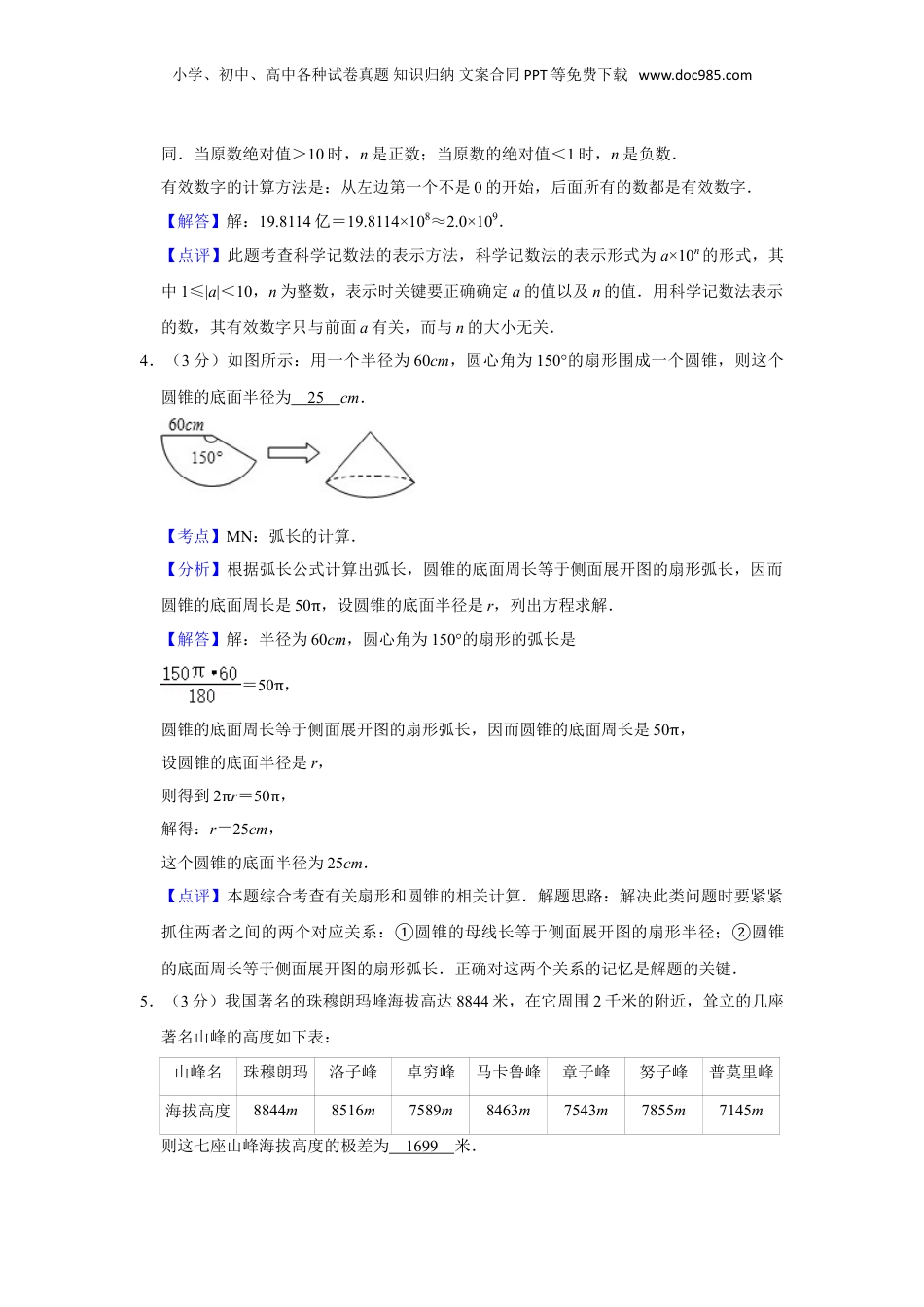 小学、初中、高中各种试卷真题知识归纳文案合同PPT等免费下载www.doc985.com2007年湖南省娄底市中考数学试卷(教师版)一、填空题(共8小题,每小题3分,满分24分)1.(3分)16的平方根是±4.【考点】21:平方根.菁优网版权所有【分析】根据平方根的定义,求数a的平方根,也就是求一个数x,使得x2=a,则x就是a的平方根,由此即可解决问题.【解答】解: (±4)2=16,∴16的平方根是±4.故答案为:±4.【点评】本题考查了平方根的定义.注意一个正数有两个平方根,它们互为相反数;0的平方根是0;负数没有平方根.2.(3分)如图,在△ABC中,∠ABC=90°,∠C=40°,AC∥BD,则∠ABD=50度.【考点】JA:平行线的性质;K7:三角形内角和定理.菁优网版权所有【分析】由三角形内角和定理可知∠A,再根据平行线的性质可解.【解答】解: △ABC中,∠ABC=90°,∠C=40°,∴∠A=50°. AC∥BD,∴∠ABD=∠A=50°.【点评】主要考查了三角形内角和,两直线平行内错角相等这一性质.3.(3分)根据国务院全面实行农村义务教育经费保障机制改革的精神,据《潇湘晨报》2月28日报道:2007年春季开学,我省投入19.8114亿元,对农村义务教育阶段的学生实行“两免一补”.19.8114亿元用科学记数法(保留两个有效数字)表示为2.0×109元.【考点】1L:科学记数法与有效数字.菁优网版权所有【分析】科学记数法的表示形式为a×10n的形式.其中1≤|a|<10,n为整数,确定n的值时,要看把原数变成a时,小数点移动了多少位,n的绝对值与小数点移动的位数相小学、初中、高中各种试卷真题知识归纳文案合同PPT等免费下载www.doc985.com同.当原数绝对值>10时,n是正数;当原数的绝对值<1时,n是负数.有效数字的计算方法是:从左边第一个不是0的开始,后面所有的数都是有效数字.【解答】解:19.8114亿=19.8114×108≈2.0×109.【点评】此题考查科学记数法的表示方法,科学记数法的表示形式为a×10n的形式,其中1≤|a|<10,n为整数,表示时关键要正确确定a的值以及n的值.用科学记数法表示的数,其有效数字只与前面a有关,而与n的大小无关.4.(3分)如图所示:用一个半径为60cm,圆心角为150°的扇形围成一个圆锥,则这个圆锥的底面半径为25cm.【考点】MN:弧长的计算.菁优网版权所有【分析】根据弧长公式计算出弧长,圆锥的底面周长等于侧面展开图的扇形弧长,因而圆锥的底面周长是50π,设圆锥的底面半径是r,列出方程求解.【解答】解:半径为60cm,圆心角为150°的扇形的弧长是=50π,圆锥的底面周长等于侧面展开图的扇形弧长,因而圆锥的底面周长是50π,设圆锥的底面半径是r,则得到2πr=50π,解得:r=25cm,这个圆锥的底面半径为25cm.【点评】本题综合考查有关扇形和圆锥的相关计算.解题思路:解决此类问题时要紧紧抓住两者之间的两个对应关系:①圆锥的母线长等于侧面展开图的扇形半径;②圆锥的底面周长等于侧面展开图的扇形弧长.正确对这两个关系的记忆是解题的关键.5.(3分)我国著名的珠穆朗玛峰海拔高达8844米,在它周围2千米的附近,耸立的几座著名山峰的高度如下表:山峰名珠穆朗玛洛子峰卓穷峰马卡鲁峰章子峰努子峰普莫里峰海拔高度8844m8516m7589m8463m7543m7855m7145m则这七座山峰海拔高度的极差为1699米.小学、初中、高中各种试卷真题知识归纳文案合同PPT等免费下载www.doc985.com【考点】W6:极差.菁优网版权所有【分析】根据极差的公式:极差=最大值﹣最小值.找出所求数据中最大的值8844,最小值7145,再代入公式求值即8844﹣7145=1699.【解答】解:数据中最大的值8844,最小值7145,这七座山峰海拔高度的极差为8844﹣7145=1699(米).故填1699.【点评】极差反映了一组数据变化范围的大小,求极差的方法是用一组数据中的最大值减去最小值.6.(3分)如图所示,圆盘被分成8个全等的小扇形,分别写上数字1,2,3,4,5,6,7,8,自由转动圆盘,指针指向的数字<3的概率是.【考点】X5:几何概率.菁优网版权所有【分析】根据题意分析可得:指针指向的数字共8种情况,其中有2种情况可使指针指向的数字<3,故其概率是=.【解答】解...