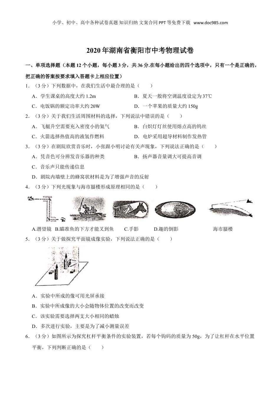 小学、初中、高中各种试卷真题知识归纳文案合同PPT等免费下载www.doc985.com2020年湖南省衡阳市中考物理试卷一、单项选择题(本题12个小题,每小题3分,共36分.在每小题给出的四个选项中,只有一个是正确的,把正确的答案按要求填入答题卡上相应位置)1.(3分)下列数据中,在我们生活中最合理的是()A.学生课桌的高度大约1.2mB.夏天一般将空调温度设定为37℃C.电饭锅的额定功率大约20WD.一个苹果的质量大约150g2.(3分)关于我们生活周围材料的选择,下列说法中错误的是()A.飞艇升空需要充入密度小的氦气B.白炽灯灯丝使用熔点高的钨丝C.火箭选择热值高的液氢作燃料D.电炉采用超导材料制作发热管3.(3分)在剧院欣赏音乐时,小张跟小明讨论有关声现象,下列说法正确的是()A.凭音色可分辨发音乐器的种类B.扬声器音量调大可提高音调C.音乐声只能传递信息D.剧院内墙壁上的蜂窝状材料是为了增强声音的反射4.(3分)下列光现象与海市蜃楼形成原理相同的是()A.潜望镜B.瞄准鱼的下方才能叉到鱼C.手影D.趣的倒影海市蜃楼5.(3分)关于做探究平面镜成像实验,下列说法正确的是()A.实验中所成的像可用光屏承接B.实验中所成像的大小会随物体位置的改变而改变C.该实验需要选择两支大小相同的蜡烛D.多次进行实验,主要是为了减小测量误差6.(3分)如图所示为探究杠杆平衡条件的实验装置,若每个钩码的质量为50g,为了让杠杆在水平位置平衡,下列判断正确的是()小学、初中、高中各种试卷真题知识归纳文案合同PPT等免费下载www.doc985.comA.在A点挂4个钩码能使杠杆平衡B.在B点用弹簧测力计竖直向下拉,当示数为0.5N时,能使杠杆平衡C.用弹簧测力计在B点拉,无论如何改变用力方向都要省力D.用弹簧测力计在A点拉,无论如何改变用力方向都要费力7.(3分)下列现象不是利用大气压的是()A.活塞式抽水机B.盆景自动供水装置C.茶壶D.吸饮料8.(3分)如图所示为内燃机四冲程工作示意图,下列说法正确的是()A.一个工作循环的正确顺序是:甲乙丙丁B.乙图冲程能获得动力C.丁图冲程有明显机械能转化为内能的过程D.丙图冲程存在化学能转化为内能的过程9.(3分)用丝绸摩擦过的玻璃棒去接触不带电的验电器A,A的金属箔片张角变大,如图所示。再用C棒去同时接触A、B验电器的金属球,发现A的金属箔片张角变小,B的金属箔片张角变大。则下列说法正确的是()小学、初中、高中各种试卷真题知识归纳文案合同PPT等免费下载www.doc985.comA.验电器原理是异种电荷相互吸引B.C棒与其手柄D均为导体C.当C棒接触两验电器的金属球时,产生的电流方向为A到BD.丝绸摩擦玻璃棒的过程中,电子是由丝绸转移到玻璃棒10.(3分)2020年6月23日,最后一颗北斗卫星在西昌顺利发射升空,标志我国自主研发、组建的北斗卫星定位系统成功组网。下列说法中错误的是()A.其中的地球“同步”卫星相对于地球是静止的B.其中沿椭圆轨道绕地球运行的卫星在远地点时,重力势能最大,动能为0C.卫星与地面设备之间是利用电磁波传递信息D.卫星的太阳能电池板工作时将太阳能转化成电能11.(3分)近期我国长江中下游许多省份因连续大雨发生洪涝灾害。抗洪抢险小分队成员李军在一次行动中需要帮老百姓把一个质量为240kg的重物搬到2m高的车上。为了省力采用5m的长木板搭了一个斜面(如图所示)。用1200N的力用了5min将重物匀速推到车上。关于此简易斜面装置,下列说法中正确的是()A.他对重物做了4800J的功B.他做功的功率为16WC.此次简易斜面装置的机械效率为50%D.斜面是一种省力杠杆12.(3分)学习家庭电路相关知识后,小明对如图所示设计的家庭电路的认识正确的是()小学、初中、高中各种试卷真题知识归纳文案合同PPT等免费下载www.doc985.comA.图中两只灯与其对应控制开关的连接都是正确的B.使用洗衣机时应选择插座CC.灯L1、L2是串联的D.如图中AB之间发生断路,则用试电笔检查插座C的各个插孔,试电笔的氖管都不发光二、双项选择题(本题4个小题,每小题3分,共12分.在每小题给出的四个选项中,只有2个是正确的.全部选对的得3分,选对但不全的得2分,不选或有错选的得0分.把正...