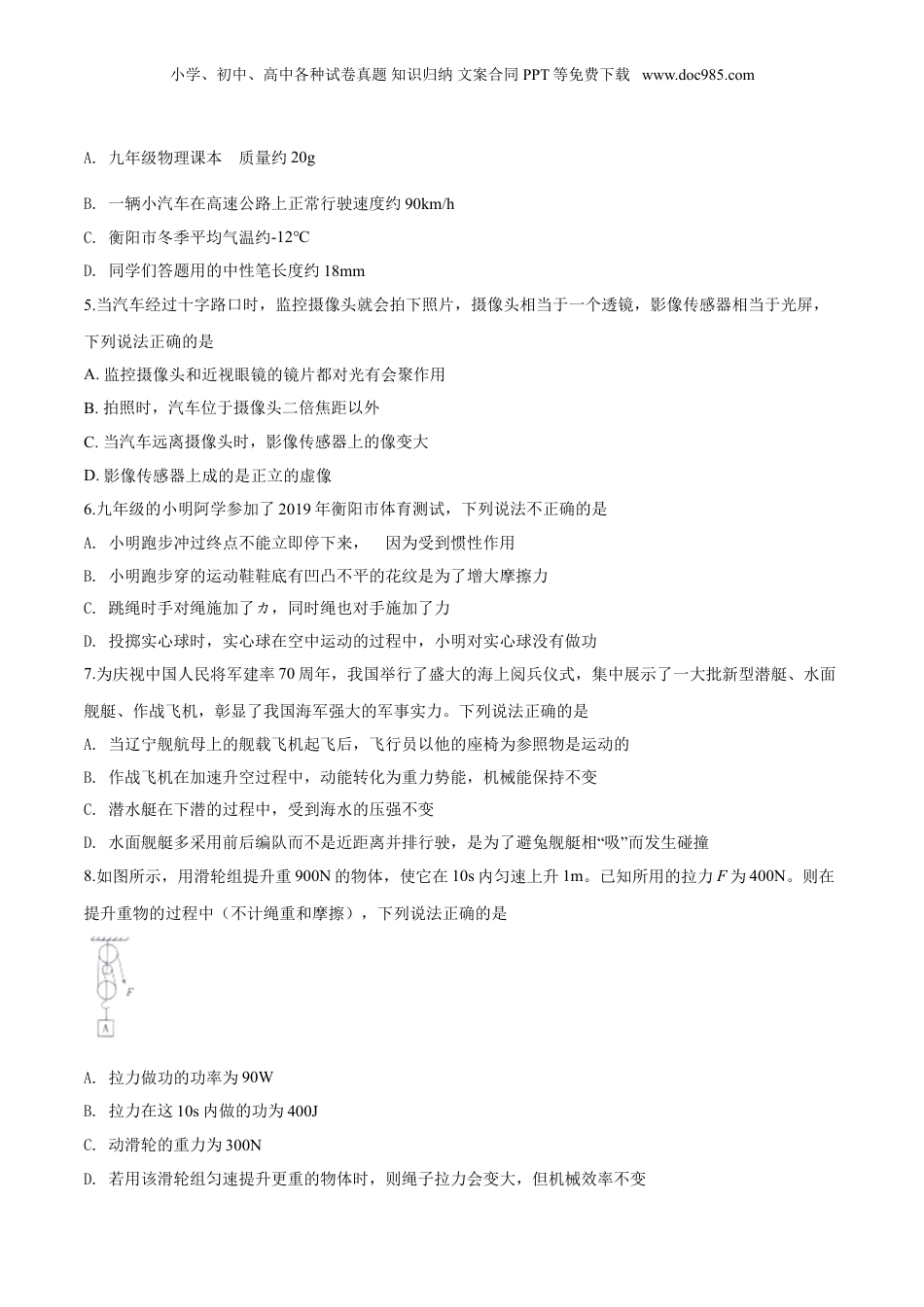 小学、初中、高中各种试卷真题知识归纳文案合同PPT等免费下载www.doc985.com2019年衡阳市初中学业水平考试试卷物理一、单项选择题1.下列有关声学知识说法正确的是A.用大小不同的力先后敲击同一音叉的同一位置,音叉发声的音调会不同B.喇叭发声时,放在它上面的纸屑在上下跳动,说明声音是由物体振动产生的C.利用B超检查身体是应用了声波能传递能量D.公路旁安装隔音墙是为了在声源处减弱噪声2.如图所示的光现象中,由于光的反射形成的是A.小孔成像B.天空彩虹C.池水变浅D.水中倒影3.“赏中华诗词、寻文化基因、品生活之美”的《中国诗词大会),这一电视节目深受观众的青睐,对下列古诗文中涉及的热现象进行解释,其中正确的是A.“月落乌啼霜满天,江枫渔火对愁眠。”霜的形成是凝华现象B.“雾淞沆砀,天与云与山与水,上下一白。"雾淞的形成是凝固现象C.“青青园中葵,朝露待日晞。”露在日出后逐渐消失是升华现象D.“腾蛇乘雾,终为土灰。”雾的形成是汽化现象4.下列数据中,最接近生活实际情况的是小学、初中、高中各种试卷真题知识归纳文案合同PPT等免费下载www.doc985.comA.九年级物理课本的质量约20gB.一辆小汽车在高速公路上正常行驶速度约90km/hC.衡阳市冬季平均气温约-12℃D.同学们答题用的中性笔长度约18mm5.当汽车经过十字路口时,监控摄像头就会拍下照片,摄像头相当于一个透镜,影像传感器相当于光屏,下列说法正确的是A.监控摄像头和近视眼镜的镜片都对光有会聚作用B.拍照时,汽车位于摄像头二倍焦距以外C.当汽车远离摄像头时,影像传感器上的像变大D.影像传感器上成的是正立的虚像6.九年级的小明阿学参加了2019年衡阳市体育测试,下列说法不正确的是A.小明跑步冲过终点不能立即停下来,是因为受到惯性作用B.小明跑步穿的运动鞋鞋底有凹凸不平的花纹是为了增大摩擦力C.跳绳时手对绳施加了カ,同时绳也对手施加了力D.投掷实心球时,实心球在空中运动的过程中,小明对实心球没有做功7.为庆视中国人民将军建率70周年,我国举行了盛大的海上阅兵仪式,集中展示了一大批新型潜艇、水面舰艇、作战飞机,彰显了我国海军强大的军事实力。下列说法正确的是A.当辽宁舰航母上的舰载飞机起飞后,飞行员以他的座椅为参照物是运动的B.作战飞机在加速升空过程中,动能转化为重力势能,机械能保持不变C.潜水艇在下潜的过程中,受到海水的压强不变D.水面舰艇多采用前后编队而不是近距离并排行驶,是为了避兔舰艇相“吸”而发生碰撞8.如图所示,用滑轮组提升重900N的物体,使它在10s内匀速上升1m。已知所用的拉力F为400N。则在提升重物的过程中(不计绳重和摩擦),下列说法正确的是A.拉力做功的功率为90WB.拉力在这10s内做的功为400JC.动滑轮的重力为300ND.若用该滑轮组匀速提升更重的物体时,则绳子拉力会变大,但机械效率不变小学、初中、高中各种试卷真题知识归纳文案合同PPT等免费下载www.doc985.com9.能源、信息、材料是现代社会发展的三大支柱,下列说法正确的是A.超导材料可用来制作电饭锅的发热体,且发热效率更高B.太阳能、核能等新能源都属于可再生能源C.手机的芯片使用的材料主要是半导体D.卫星导航是利用超声波来定位导航10.小明家上次査看电能表示数,本次查看时电能表读数如图所示,则下列说法正确的是A.他家在这段时间内消耗的电能为903kw·hB.电能表是测量电功率的仪表C.若只让一个标有“220V1000w”的电热水器正常工作10min,则电能表的圆盘转了600转D.这个电能表的额定功率为2200W11.如图所示的工具中,属于费力杠杆的是A.开瓶器B.核桃夹C.钳子D.食品夹小学、初中、高中各种试卷真题知识归纳文案合同PPT等免费下载www.doc985.com12.关于家庭电路及安全用电,下列说法正确的是A.为了防止因漏电而造成触电事故,微波炉的金属外壳应该与大地相连B.使用试电笔时,手指不能接触笔尾金属体,以免发生触电事故C.为了防止触电,必须把用电器的开关接在零线上D.家庭电路中,空气开关跳闸一定是因为电路发生了短路13.如图所示的充电鞋垫,利用脚跟起落驱动磁性转子旋转,线中就会产生电流,从而能给鞋垫上的电池充电。下图中与充电鞋垫的工作原理相同的是A.B.C.D.14.如图所示,...