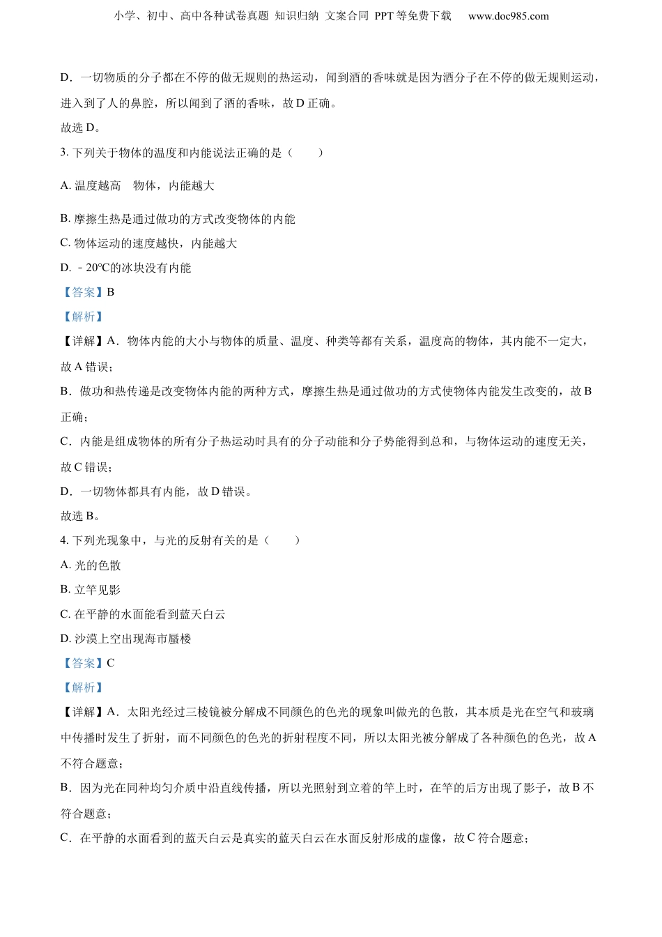 小学、初中、高中各种试卷真题知识归纳文案合同PPT等免费下载www.doc985.com2023年郴州市初中学业水平考试(试题卷)物理一、选择题(本题共13小题,每小题3分,共39分。每小题给出的选项中,只有一项符合题目要求。)1.下列说法正确的是()A.最早证明大气压强存在的实验是托里拆利实验B.绝缘体不易导电,是因为绝缘体内部没有电荷C.汽车发动机用水作冷却剂,是利用了水的比热容大的性质D.在流体中,流速越快的位置,压强越大【答案】C【解析】【详解】A.最早证明大气压强存在的实验是马德堡半球实验,托里拆利实验准确的测出了大气压的值,故A错误;B.绝缘体不易导电,不是因为绝缘体内部没有电荷,而是因为其内部没有可以自由移动的电荷,故B错误;C.水的比热容大,质量相同的水和其他物质相比,吸收或放出相同的热量,水的温度变化较小,所以汽车的发动机用水作冷却剂,故C正确;D.在流体流速越快的位置,压强越小,故D错误。故选C。2.“山水福地,遇见郴州”,这是郴州旅发大会的主题。在宣传视频中,大力推介了郴州各地的美食、美景……以下说法正确的是()A.“苏仙岭的钟声”——钟声是由空气的振动而产生的B.“莽山的云海”——云的形成属于汽化现象C.“北湖公园的灯光”——其中的黄光是色光的三原色之一D.“嘉禾的倒缸酒”——酒香说明分子在不停地做无规则运动【答案】D【解析】【详解】A.钟声是由钟振动产生的,故A错误;B.云是空气中的水蒸气遇冷液化而成的小水滴,故B错误;C.红、绿、蓝是色光的三原色,故C错误;小学、初中、高中各种试卷真题知识归纳文案合同PPT等免费下载www.doc985.comD.一切物质的分子都在不停的做无规则的热运动,闻到酒的香味就是因为酒分子在不停的做无规则运动,进入到了人的鼻腔,所以闻到了酒的香味,故D正确。故选D。3.下列关于物体的温度和内能说法正确的是()A.温度越高的物体,内能越大B.摩擦生热是通过做功的方式改变物体的内能C.物体运动的速度越快,内能越大D.﹣20℃的冰块没有内能【答案】B【解析】【详解】A.物体内能的大小与物体的质量、温度、种类等都有关系,温度高的物体,其内能不一定大,故A错误;B.做功和热传递是改变物体内能的两种方式,摩擦生热是通过做功的方式使物体内能发生改变的,故B正确;C.内能是组成物体的所有分子热运动时具有的分子动能和分子势能得到总和,与物体运动的速度无关,故C错误;D.一切物体都具有内能,故D错误。故选B。4.下列光现象中,与光的反射有关的是()A.光的色散B.立竿见影C.在平静的水面能看到蓝天白云D.沙漠上空出现海市蜃楼【答案】C【解析】【详解】A.太阳光经过三棱镜被分解成不同颜色的色光的现象叫做光的色散,其本质是光在空气和玻璃中传播时发生了折射,而不同颜色的色光的折射程度不同,所以太阳光被分解成了各种颜色的色光,故A不符合题意;B.因为光在同种均匀介质中沿直线传播,所以光照射到立着的竿上时,在竿的后方出现了影子,故B不符合题意;C.在平静的水面看到的蓝天白云是真实的蓝天白云在水面反射形成的虚像,故C符合题意;小学、初中、高中各种试卷真题知识归纳文案合同PPT等免费下载www.doc985.comD.沙漠上空出现海市蜃楼是光在不均匀的空气中传播时发生折射形成的虚像,故D不符合题意。故选C。5.中国的航天航空技术处于世界领先水平。2023年5月30日,神舟16号飞船成功发射,并与天宫1号目标飞行器成功交会对接。以下说法正确的是()A.火箭升空时,它所受的推力和重力是一对平衡力B.成功对接后,以天宫1号为参照物,飞船是静止的C.火箭的发动机是将机械能转化为内能的机器D.字航员与地面工作人员是利用超声波进行通信的【答案】B【解析】【详解】A.火箭升空时做加速运动,不是平衡状态,则火箭所受重力和推力不是平衡力,故A错误;B.成功对接后,以天宫1号为参照物,飞船的位置没有发生改变,飞船是静止的,故B正确;C.火箭的发动机是将内能转化为机械能的机器,故C错误;D.真空不能传声,电磁波可以在真空中传播,字航员与地面工作人员是利用电磁波进行通信的,故D错误。故选B。6.下列测量工具读数正确的是()A.物体的长度:2.70cmB.温...