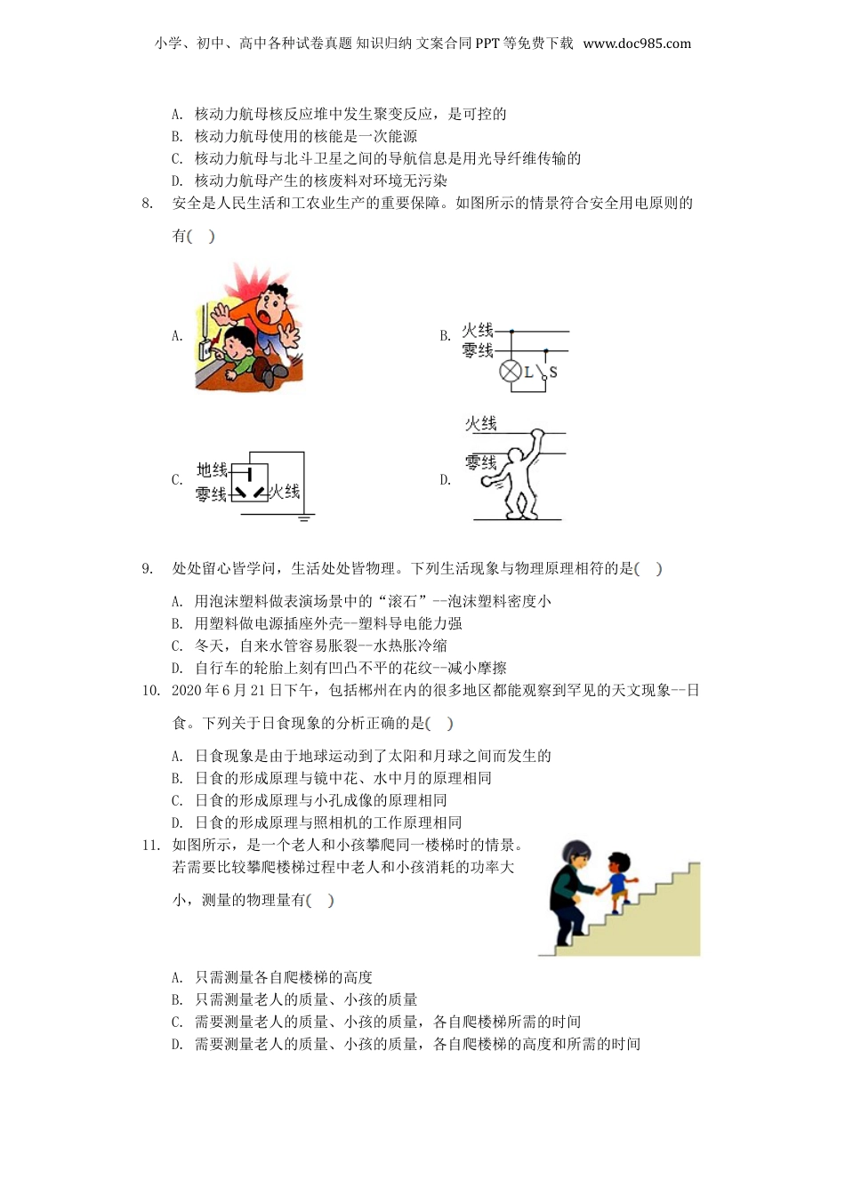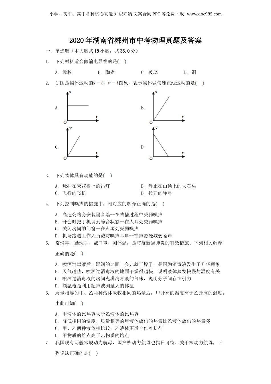 小学、初中、高中各种试卷真题知识归纳文案合同PPT等免费下载www.doc985.com2020年湖南省郴州市中考物理真题及答案一、单选题(本大题共18小题,共36.0分)1.下列材料适合做输电导线的是A.橡胶B.陶瓷C.玻璃D.铜2.如图是物体运动的,图象,表示物体做匀速直线运动的是A.B.C.D.3.下列物体具有动能的是A.悬挂在天花板上的吊灯B.静止在山顶上的大石头C.飞行的飞机D.拉开的弹弓4.下列控制噪声的措施中,相对应的解释正确的是A.高速公路旁安装隔音墙--在传播过程中减弱噪声B.开会时把手机调到静音状态--在人耳处减弱噪声C.关闭房间的门窗--在声源处减弱噪声D.机场跑道工作人员戴防噪声耳罩--在声源处减弱噪声5.常消毒、勤洗手、戴口罩、测体温,是防疫新冠肺炎的有效措施。下列相关解释正确的是A.喷洒消毒液后,湿润的地面一会儿就干燥了,是因为消毒液发生了升华现象B.天气越热,喷洒过消毒液的地面干燥得越快,说明液体蒸发快慢与温度有关C.喷洒过消毒液的房间充满消毒液的气味,说明分子间存在引力D.额温枪是利用超声波测量人的体温6.质量相等的甲、乙两种液体吸收相同的热量后,甲升高的温度高于乙升高的温度。由此可知A.甲液体的比热容大于乙液体的比热容B.降低相同的温度,质量相等的甲液体放出的热量比乙液体放出的热量多C.甲、乙两种液体相比较,乙液体更适合作冷却剂D.甲物质的熔点高于乙物质的熔点7.我国现有两艘常规动力航母,国产核动力航母也指日可待。关于核动力航母,下列说法正确的是小学、初中、高中各种试卷真题知识归纳文案合同PPT等免费下载www.doc985.comA.核动力航母核反应堆中发生聚变反应,是可控的B.核动力航母使用的核能是一次能源C.核动力航母与北斗卫星之间的导航信息是用光导纤维传输的D.核动力航母产生的核废料对环境无污染8.安全是人民生活和工农业生产的重要保障。如图所示的情景符合安全用电原则的有A.B.C.D.9.处处留心皆学问,生活处处皆物理。下列生活现象与物理原理相符的是A.用泡沫塑料做表演场景中的“滚石”--泡沫塑料密度小B.用塑料做电源插座外壳--塑料导电能力强C.冬天,自来水管容易胀裂--水热胀冷缩D.自行车的轮胎上刻有凹凸不平的花纹--减小摩擦10.2020年6月21日下午,包括郴州在内的很多地区都能观察到罕见的天文现象--日食。下列关于日食现象的分析正确的是A.日食现象是由于地球运动到了太阳和月球之间而发生的B.日食的形成原理与镜中花、水中月的原理相同C.日食的形成原理与小孔成像的原理相同D.日食的形成原理与照相机的工作原理相同11.如图所示,是一个老人和小孩攀爬同一楼梯时的情景。若需要比较攀爬楼梯过程中老人和小孩消耗的功率大小,测量的物理量有A.只需测量各自爬楼梯的高度B.只需测量老人的质量、小孩的质量C.需要测量老人的质量、小孩的质量,各自爬楼梯所需的时间D.需要测量老人的质量、小孩的质量,各自爬楼梯的高度和所需的时间小学、初中、高中各种试卷真题知识归纳文案合同PPT等免费下载www.doc985.com12.如图所示,将盛有适量水的试管由倾斜位置A缓慢移至竖直位置在此过程中,水对试管底部的压强A.变大B.变小C.先变小后变大D.先变大后变小13.下列器件工作时利用了电磁感应现象的是A.奥斯特实验B.电铃C.扬声器D.发电机14.物体放在凸透镜前适当位置能在屏上得到一个清晰的像,如果把屏拿开,则A.像还存在,但眼睛看不到B.像还存在,眼睛从各个方向看得到C.像还存在,但眼睛只能在一定范围内看到D.像不存在15.如图所示,盛水的烧杯静置于水平桌面上。下列分析正确的是A.烧杯的重力与桌面对烧杯的支持力是一对平衡力B.烧杯和水的重力与杯子对桌面的压力是一对平衡力小学、初中、高中各种试卷真题知识归纳文案合同PPT等免费下载www.doc985.comC.烧杯对桌面的压力与桌面对烧杯的支持力是一对相互作用力D.烧杯对桌面的压力与桌面对烧杯的支持力是一对平衡力16.小明将两个完全相同的物体A、B,分别放在甲、乙两种液体中,A、B处于如图所示的漂浮状态,且此时液面处于同一水平高度。由此可判断A.甲液体密度小于乙液体密度B.物体A、B下表面所受液体压强相等C.甲液体对容器底部的压强小于乙液体对容器底部的压强D.A物体受到的浮...