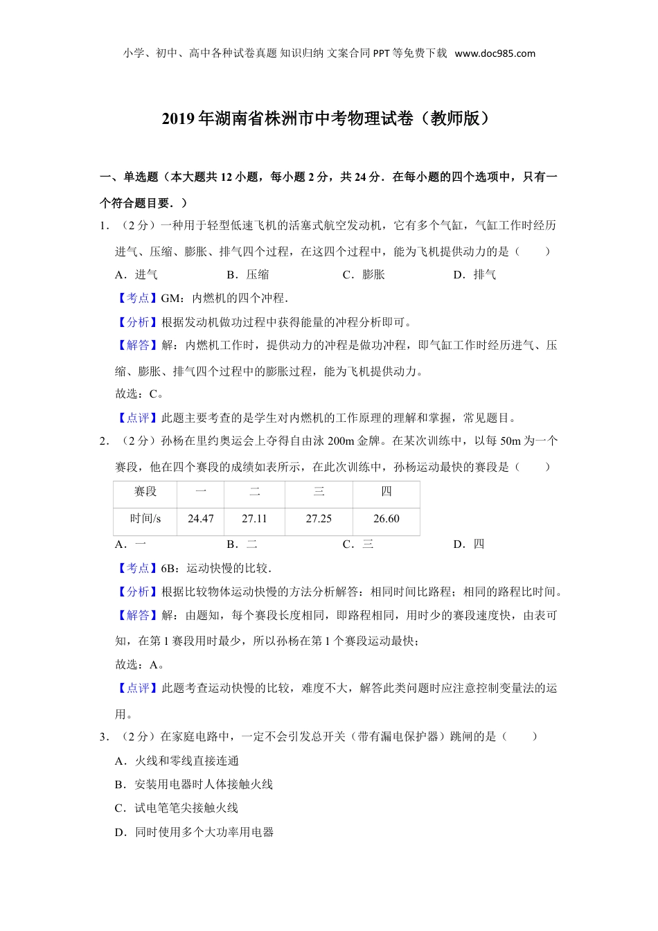 小学、初中、高中各种试卷真题知识归纳文案合同PPT等免费下载www.doc985.com2019年湖南省株洲市中考物理试卷(教师版)一、单选题(本大题共12小题,每小题2分,共24分.在每小题的四个选项中,只有一个符合题目要.)1.(2分)一种用于轻型低速飞机的活塞式航空发动机,它有多个气缸,气缸工作时经历进气、压缩、膨胀、排气四个过程,在这四个过程中,能为飞机提供动力的是()A.进气B.压缩C.膨胀D.排气【考点】GM:内燃机的四个冲程.菁优网版权所有【分析】根据发动机做功过程中获得能量的冲程分析即可。【解答】解:内燃机工作时,提供动力的冲程是做功冲程,即气缸工作时经历进气、压缩、膨胀、排气四个过程中的膨胀过程,能为飞机提供动力。故选:C。【点评】此题主要考查的是学生对内燃机的工作原理的理解和掌握,常见题目。2.(2分)孙杨在里约奥运会上夺得自由泳200m金牌。在某次训练中,以每50m为一个赛段,他在四个赛段的成绩如表所示,在此次训练中,孙杨运动最快的赛段是()赛段一二三四时间/s24.4727.1127.2526.60A.一B.二C.三D.四【考点】6B:运动快慢的比较.菁优网版权所有【分析】根据比较物体运动快慢的方法分析解答:相同时间比路程;相同的路程比时间。【解答】解:由题知,每个赛段长度相同,即路程相同,用时少的赛段速度快,由表可知,在第1赛段用时最少,所以孙杨在第1个赛段运动最快;故选:A。【点评】此题考查运动快慢的比较,难度不大,解答此类问题时应注意控制变量法的运用。3.(2分)在家庭电路中,一定不会引发总开关(带有漏电保护器)跳闸的是()A.火线和零线直接连通B.安装用电器时人体接触火线C.试电笔笔尖接触火线D.同时使用多个大功率用电器小学、初中、高中各种试卷真题知识归纳文案合同PPT等免费下载www.doc985.com【考点】IX:家庭电路电流过大的原因.菁优网版权所有【分析】当电路中发生短路或用电器总功率过大导致电流过大时,空气开关会自动断开,切断电路;漏电保护器是在有人触电和漏电时,能自动断开电路,对人身起保护作用的保护装置。【解答】解:带有漏电保护器的总开关集成了空气开关和漏电保护器的功能,对电路起到短路、过载(用电器总功率过大)和漏电保护的作用。所以当有人触电、电路中出现短路、家用电器总功率过大时都会造成总开关出现“跳闸”现象。但试电笔笔尖接触火线,是为了辨别火线和零线,不会引起“跳闸”。故选:C。【点评】一说到“跳闸”,学生可能首先会想到是由于电路出现短路或家用电器总功率过大造成电流过大而出现的“跳闸”,忽视了漏电保护器的作用是当有漏电或人触电时,它也能自动断开电路。4.(2分)能正确表示光从室外透过窗户玻璃进入室内传播的光路图是()A.B.C.D.【考点】AN:作光的折射光路图.菁优网版权所有【分析】光线通过玻璃再进入空气发生两次折射:第一次是从空气斜射进入玻璃,折射光线应该靠近法线偏折,折射角小于入射角;第二次是从玻璃斜射进入空气,折射光线应该远离法线偏折,折射角大于入射角。由于玻璃上下表面垂直,第二次折射的入射角等于第一次折射的折射角,所以第二次折射的折射角等于第一次折射的入射角,最后的出射光线与入射光线相比,只是做了平移,即出射光线与入射光线平行。【解答】解:第一次折射:先过入射点O垂直玻璃上表面作出法线,再在玻璃内部法线小学、初中、高中各种试卷真题知识归纳文案合同PPT等免费下载www.doc985.com的另一侧作出折射光线,注意折射角小于入射角:第二次折射:先过O′点垂直玻璃下表面作出法线,再在玻璃的下侧空气中作出折射光线,注意折射角大于入射角,折射光线与玻璃上表面的入射光线平行,如图所示:故选:A。【点评】考查光的折射定律中:当光从空气进入水、玻璃等透明介质时,折射角小于入射角;当光从水、玻璃进入空气中时,折射角大于入射角。5.(2分)图为某同学游酒埠江时拍下的一张照片。根据这张照片可推断()A.山峰有多高,湖水有多深B.照片中实景在上,倒影在下C.群山通过照相机镜头成正立、缩小的实像D.倒影通过照相机镜头成倒立、缩小的虚像【考点】A6:光的反射现象;B8:凸...