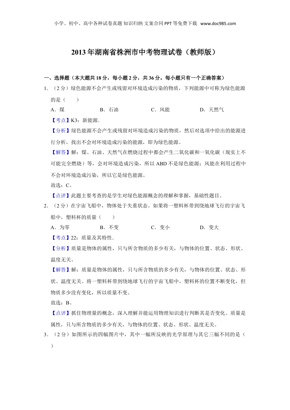 小学、初中、高中各种试卷真题知识归纳文案合同PPT等免费下载www.doc985.com2013年湖南省株洲市中考物理试卷(教师版)一、选择题(本大题共18分,每小题2分,共36分。每小题只有一个正确答案)1.(2分)绿色能源不会产生或残留对环境造成污染的物质,下列能源中可称为绿色能源的是()A.煤B.石油C.风能D.天然气【考点】K3:新能源.菁优网版权所有【分析】绿色能源不会产生或残留对环境造成污染的物质,然后对选项中给出的能源进行分析,找出不会对环境造成污染的能源,即为绿色能源。【解答】解:煤、石油、天然气在燃烧过程中都会产生二氧化碳和一氧化碳(现实上不可能完全燃烧)等,会对环境造成污染,所以ABD不是绿色能源;风能在利用过程中不会对环境造成污染,所以它是绿色能源。故选:C。【点评】此题主要考查的是学生对绿色能源概念的理解和掌握,基础性题目。2.(2分)在宇宙飞船中,物体处于失重状态。如果将一塑料杯带到绕地球飞行的宇宙飞船中,塑料杯的质量()A.为零B.不变C.变小D.变大【考点】22:质量及其特性.菁优网版权所有【分析】质量是物体的属性,只与所含物质的多少有关,与物体的位置、状态、形状、温度无关。【解答】解:质量是物体的属性,只与所含物质的多少有关,与物体的位置、状态、形状、温度无关。将一塑料杯带到绕地球飞行的宇宙飞船中,塑料杯的位置不断变化,但物质多少没有变化,所以质量不变。故选:B。【点评】抓住物理量的概念,深入理解并能运用物理知识进行判断其是否变化。质量是属性,只与所含物质的多少有关,与物体的位置、状态、形状、温度无关。3.(2分)如图所示的四幅图片中,其中一幅所反映的光学原理与其它三幅不同的是()小学、初中、高中各种试卷真题知识归纳文案合同PPT等免费下载www.doc985.comA.瞄准鱼下方插鱼B.放大镜C.湖中的倒影D.水碗中的筷子【考点】A6:光的反射现象;AM:光的折射现象及其应用.菁优网版权所有【分析】(1)光线传播到两种介质的表面上时会发生光的反射现象,例如水面上出现岸上物体的倒影、平面镜成像、玻璃等光滑物体反光都是光的反射形成的;(2)光线在同种不均匀介质中传播或者从一种介质进入另一种介质时,就会出现光的折射现象,例如水池底变浅、水中筷子变弯、海市蜃楼、凸透镜成像等都是光的折射形成的。【解答】解:A、水中鱼反射出的光,在水面处发生了折射,故属于折射现象;B、放大镜是凸透镜,光经过凸透镜时,发生的是折射,故属于折射现象;C、湖中的倒影,是平面镜成像,是由光的反射形成的,是光的反射现象;D、筷子好像在水面处折断了是光在空气与水的界面发生了折射,属于折射现象。综上所述,ABD都发生了折射,C发生了反射。故选:C。【点评】此题主要考查了光的折射、光的反射现象。光的反射是光照射到物体表面又返回的现象,光的折射是由于光从一种介质斜射入另一种介质或在不均匀介质中传播时,传播方向发生变化的现象。它们之间有本质的区别,要注意区分。4.(2分)下列用电器或设备中,没有电磁铁的是()A.电烙铁B.电铃C.电磁起重机D.电磁继电器【考点】CI:电磁铁的其他应用.菁优网版权所有【分析】电磁铁是通电产生电磁的一种装置。在铁芯的外部缠绕与其功率相匹配的导电绕组,这种通有电流的线圈像磁铁一样具有磁性。【解答】解:在题目中所示答案,只有电烙铁是完全的发热装置,而其它电器中均需要电磁铁产生磁性进行工作。故选:A。【点评】本题考查的是电磁铁的应用,电磁铁在通电时有磁性,断电后磁就随之消失。小学、初中、高中各种试卷真题知识归纳文案合同PPT等免费下载www.doc985.com电磁铁在我们的日常生活中有着极其广泛的应用。5.(2分)下列估测不符合实际的是()A.初中物理课本的长度约为26cmB.奥运会男子百米赛跑中运动员的平均速度约为10m/sC.两个鸡蛋的重力约为1ND.人体密度约为0.5×103kg/m3【考点】28:密度及其特性;63:长度的估测;68:速度与物体运动;77:重力大小的估测.菁优网版权所有【分析】首先对题目中涉及的物理量有个初步的了解,对于选项中的单位,可根据需要进行相应的换算或转换,排除与生活实...