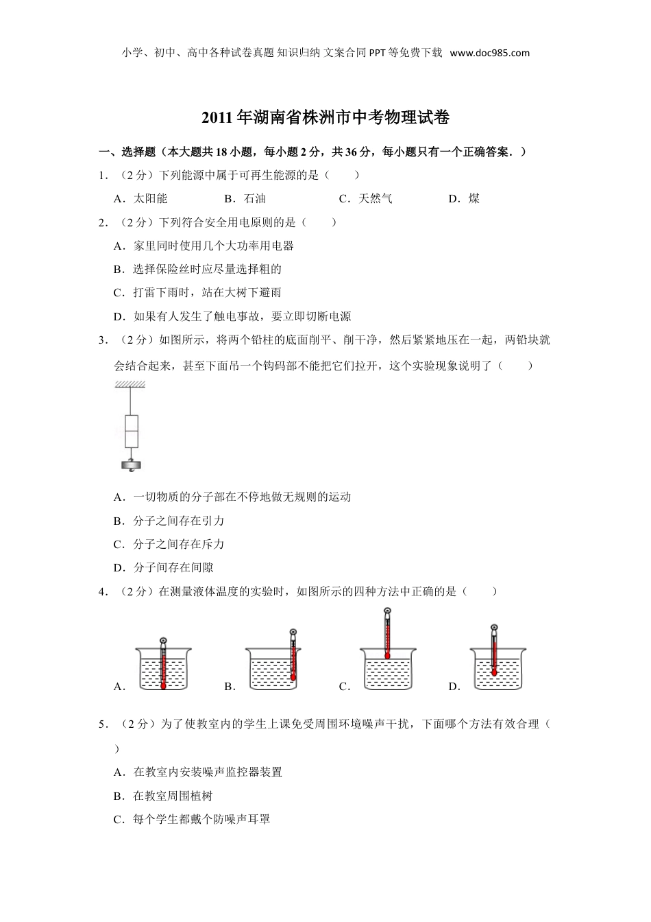 小学、初中、高中各种试卷真题知识归纳文案合同PPT等免费下载www.doc985.com2011年湖南省株洲市中考物理试卷一、选择题(本大题共18小题,每小题2分,共36分,每小题只有一个正确答案.)1.(2分)下列能源中属于可再生能源的是()A.太阳能B.石油C.天然气D.煤2.(2分)下列符合安全用电原则的是()A.家里同时使用几个大功率用电器B.选择保险丝时应尽量选择粗的C.打雷下雨时,站在大树下避雨D.如果有人发生了触电事故,要立即切断电源3.(2分)如图所示,将两个铅柱的底面削平、削干净,然后紧紧地压在一起,两铅块就会结合起来,甚至下面吊一个钩码部不能把它们拉开,这个实验现象说明了()A.一切物质的分子部在不停地做无规则的运动B.分子之间存在引力C.分子之间存在斥力D.分子间存在间隙4.(2分)在测量液体温度的实验时,如图所示的四种方法中正确的是()A.B.C.D.5.(2分)为了使教室内的学生上课免受周围环境噪声干扰,下面哪个方法有效合理()A.在教室内安装噪声监控器装置B.在教室周围植树C.每个学生都戴个防噪声耳罩小学、初中、高中各种试卷真题知识归纳文案合同PPT等免费下载www.doc985.comD.将教室的窗户打开6.(2分)某阻值为4Ω的定值电阻,通过的电流为0.5A,则1min产生的热量是()A.2JB.30JC.60JD.120J7.(2分)用天平称出一个塑料瓶的质量,然后将其剪碎再放到天平上称,比较这个物体在形状变化前后的质量()A.变大B.变小C.不变D.无法确定8.(2分)关于电磁波在生活中的应用,下列说法不正确的是()A.用微波炉加热食品B.电视信号的发射与接收C.使用手机打电话D.做“B超”检查9.(2分)长度测量是物理学中最基本的测量之一,图中的四种工具不属于测量长度的是()A.B.C.D.10.(2分)把一根筷子斜插入盛水的玻璃杯里,从正面看过去的情形和图中哪个图相符()A.B.C.D.小学、初中、高中各种试卷真题知识归纳文案合同PPT等免费下载www.doc985.com11.(2分)今年上半年南方雨水稀少,出现了历史上罕见的旱灾。“雨”主要是由于大气中的水蒸气遇冷变成小水滴降落到地面形成的,这个过程的物态变化是()A.熔化B.汽化C.液化D.凝华12.(2分)点燃两支长度不同的蜡烛,将其固定在桌面上,如图所示,如果用玻璃杯将两支蜡烛罩在里面,两支蜡烛最先熄灭的是()A.长的先熄灭B.短的先熄灭C.同时熄灭D.无法判断13.(2分)株洲沿江风光带有一段人造沙滩,在炙热的夏天赤脚踩在沙滩上感觉烫脚,而站在湘江边的浅水滩处却感到凉爽。形成这种现象的原因,下面解释正确的是()A.沙子的密度小,水的密度大B.沙子的密度大,水的密度小C.沙子的比热容大,水的比热容小D.沙子的比热容小,水的比热容大14.(2分)光敏电阻的阻值随着光照的强弱而改变。“光强”是表示光的强弱程度的物理量,照射光越强,光强越大,光强符号用E表示,国际单位为坎德拉(cd).实验测得光敏电阻的阻值R与光强E间的关系如图所示,由图可知()A.光敏电阻的阻值随光强的增强而变大B.光敏电阻的阻值随光强的增强而变小C.光敏电阻的阻值随光强的增强先变大后变小D.光敏电阻的阻值随光强的增强先变小后变大小学、初中、高中各种试卷真题知识归纳文案合同PPT等免费下载www.doc985.com15.(2分)用大小不同的甲、乙两个力拉同一物体,两力所做的功W与在这两个力的方向上移动的距离S的关系图象如图,由图可知,甲、乙两个力的大小关系是()A.F甲>F乙B.F甲<F乙C.F甲=F乙D.条件不足,无法判断16.(2分)普通白炽灯正常工作时消耗的电能有90%因发热而损失,而新型的LED灯(发光二极管)发光时几乎不发热,从而减少了电能的损失,成为科技创新的重要领域之一。下面有关普通白炽灯和LED灯工作过程的比较说法不正确的是()A.普通白炽灯正常工作时消耗的电能转化为光能和热能B.LED灯的发光原理是电能直接转化为光能C.普通白炽灯正常工作时消耗的电能主要转化为光能D.LED灯提高了电能转化为光能的效率,有利于节约能源17.(2分)如图所示,体积相同的甲、乙、丙三个物体浸没在水中的浮沉情况,此时甲、乙、丙三个物体所受的...