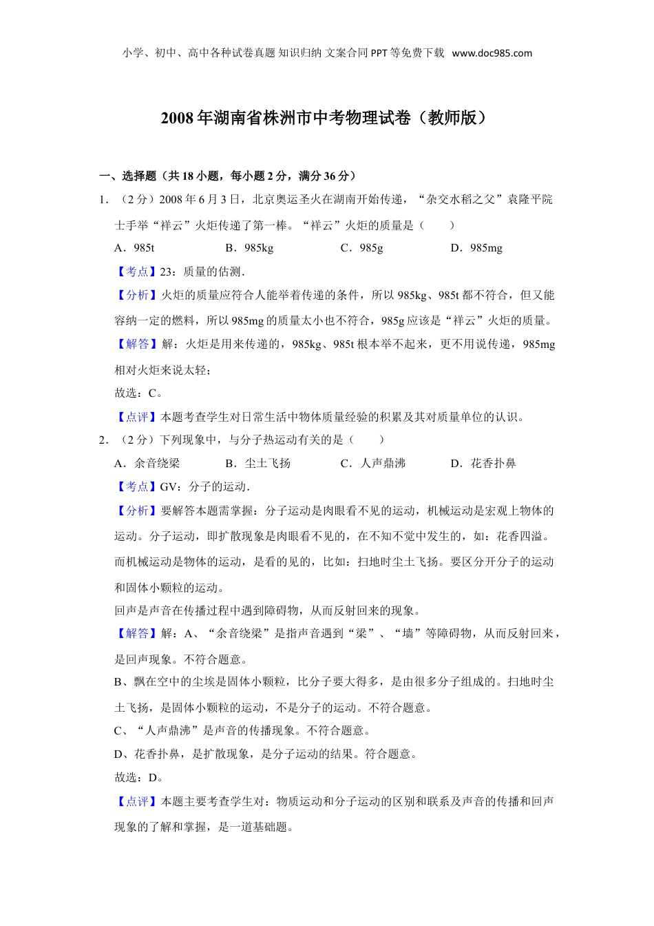 小学、初中、高中各种试卷真题知识归纳文案合同PPT等免费下载www.doc985.com2008年湖南省株洲市中考物理试卷(教师版)一、选择题(共18小题,每小题2分,满分36分)1.(2分)2008年6月3日,北京奥运圣火在湖南开始传递,“杂交水稻之父”袁隆平院士手举“祥云”火炬传递了第一棒。“祥云”火炬的质量是()A.985tB.985kgC.985gD.985mg【考点】23:质量的估测.菁优网版权所有【分析】火炬的质量应符合人能举着传递的条件,所以985kg、985t都不符合,但又能容纳一定的燃料,所以985mg的质量太小也不符合,985g应该是“祥云”火炬的质量。【解答】解:火炬是用来传递的,985kg、985t根本举不起来,更不用说传递,985mg相对火炬来说太轻;故选:C。【点评】本题考查学生对日常生活中物体质量经验的积累及其对质量单位的认识。2.(2分)下列现象中,与分子热运动有关的是()A.余音绕梁B.尘土飞扬C.人声鼎沸D.花香扑鼻【考点】GV:分子的运动.菁优网版权所有【分析】要解答本题需掌握:分子运动是肉眼看不见的运动,机械运动是宏观上物体的运动。分子运动,即扩散现象是肉眼看不见的,在不知不觉中发生的,如:花香四溢。而机械运动是物体的运动,是看的见的,比如:扫地时尘土飞扬。要区分开分子的运动和固体小颗粒的运动。回声是声音在传播过程中遇到障碍物,从而反射回来的现象。【解答】解:A、“余音绕梁”是指声音遇到“梁”、“墙”等障碍物,从而反射回来,是回声现象。不符合题意。B、飘在空中的尘埃是固体小颗粒,比分子要大得多,是由很多分子组成的。扫地时尘土飞扬,是固体小颗粒的运动,不是分子的运动。不符合题意。C、“人声鼎沸”是声音的传播现象。不符合题意。D、花香扑鼻,是扩散现象,是分子运动的结果。符合题意。故选:D。【点评】本题主要考查学生对:物质运动和分子运动的区别和联系及声音的传播和回声现象的了解和掌握,是一道基础题。小学、初中、高中各种试卷真题知识归纳文案合同PPT等免费下载www.doc985.com3.(2分)生活中的刀、斧、剪的刃磨得很薄,这是为了()A.增大压强B.减小压强C.增大压力D.减小压力【考点】84:增大压强的方法及其应用.菁优网版权所有【分析】(1)压强大小的影响因素:压力大小和受力面积大小。(2)增大压强的方法:在压力一定时,减小受力面积来增大压强;在受力面积一定时,增大压力来增大压强。【解答】解:刀、斧、剪的刃磨得很薄,是为了在压力一定时,减小受力面积来增大对物体的压强。故选:A。【点评】掌握压强大小的影响因素,掌握增大和减小压强的方法,能解释生活中的压强问题。4.(2分)能源的开发和利用在“两型”社会的建设中起着很重要的作用。下列能源中,在使用时最安全、最清洁的是()A.煤气B.太阳能C.电能D.核能【考点】K3:新能源.菁优网版权所有【分析】太阳能是一种清洁、无污染、可再生能源,它取之不尽用之不竭,是一种新型的能源,越来越被广泛利用。它的优点很多,比如:太阳能分布广阔,获取方便;清洁不会造成环境污染。【解答】解:煤气在使用时容易造成煤气中毒危险,电能容易造成触电危险,核能也会有核辐射污染,不安全,故A、C、D都不符合题意;而太阳能清洁无污染,是安全、清洁的能源;故选:B。【点评】本题主要考查学生对广义的太阳能的了解和掌握。5.(2分)下列杠杆中,属于费力杠杆的是()A.起子B.道钉撬小学、初中、高中各种试卷真题知识归纳文案合同PPT等免费下载www.doc985.comC.筷子D.钢丝钳【考点】7O:杠杆的分类.菁优网版权所有【分析】可根据动力臂和阻力臂的大小关系来比较判断是什么杠杆,当动力臂大于阻力臂时,是省力杠杆,当动力臂小于阻力臂时,是费力杠杆。【解答】解:A、起子的动力臂大于阻力臂,是省力杠杆,故A不符合题意;B、道钉撬动力臂大于阻力臂,是省力杠杆,故B不符合题意;C、筷子动力臂小于阻力臂,是费力杠杆,故C符合题意;D、钢丝钳动力臂大于阻力臂,是省力杠杆,故D不符合题意;故选:C。【点评】解决这类问题关键是找到支点,然后画出动力臂和阻力臂,比较动力臂和阻力臂的大小,即可得出结论。6.(2分)诗句“...