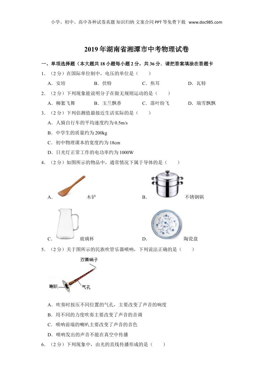 小学、初中、高中各种试卷真题知识归纳文案合同PPT等免费下载www.doc985.com2019年湖南省湘潭市中考物理试卷一、单项选择题(本大题共18小题每小题2分,共36分.请把答案填涂在答题卡1.(2分)在国际单位制中,电压的单位是()A.安培B.伏特C.焦耳D.瓦特2.(2分)下列现象能说明分子在做无规则运动的是()A.柳絮飞舞B.玉兰飘香C.落叶纷飞D.瑞雪飘飘3.(2分)下列估测值最接近生活实际的是()A.人骑自行车的平均速度约为0.5m/sB.中学生的质量约为200kgC.初中物理课本的宽度约为18cmD.日光灯正常工作的电功率约为1000W4.(2分)如图所示的物品中,通常情况下属于导体的是()A.木铲B.不锈钢锅C.玻璃杯D.陶瓷盘5.(2分)关于图所示的民族吹管乐器唢呐,下列说法正确的是()A.吹奏时按压不同位置的气孔,主要改变了声音的响度B.用不同的力度吹奏主要改变了声音的音调C.唢呐前端的喇叭主要改变了声音的音色D.唢呐发出的声音不能在真空中传播6.(2分)下列现象中,由光的直线传播形成的是()小学、初中、高中各种试卷真题知识归纳文案合同PPT等免费下载www.doc985.comA.墙上的“手影”B.露珠下的“叶脉”C.水中的“倒影”D.“折断”的铅笔7.(2分)下列物态变化的实例中属于凝华的是()A.积雪消融B.湖面起雾C.瓦上结霜D.衣服变干8.(2分)如图所示,纸做的“不倒翁”小鸟翅膀上装有两个回形针,将鸟嘴放在指尖上转动而不会掉下来。下列说法正确的是()A.装回形针降低了小鸟的重心B.装回形针升高了小鸟的重心C.小鸟的重心一定在其几何中心上D.小鸟不掉下来是因为鸟嘴上有胶水9.(2分)《流浪地球》电影中描述到了木星。木星质量比地球大得多,木星对地球的引力大小为F1,地球对木星的引力大小为F2,则F1与F2的大小关系为()A.F1<F2B.F1>F2C.F1=F2D.无法确定10.(2分)信用卡刷卡时,其磁条经过刷卡机的缝隙,线圈处会产生感应电流。以下设备与信用卡刷卡时工作原理相同的是()A.排气扇B.电烤炉C.电动机D.发电机11.(2分)下列有关能源的说法正确的是()小学、初中、高中各种试卷真题知识归纳文案合同PPT等免费下载www.doc985.comA.石油是二次能源B.煤炭的大量燃烧不会导致温室效应C.天然气是可再生能源D.太阳能可转化为电能12.(2分)下列说法中正确的是()A.折射角一定小于入射角B.电能表是测量电功的仪表C.导体的横截面积越大,电阻越大D.声音不能传递能量13.(2分)如图所示,水平静止放置的易拉罐会向摩擦过的塑料管滚动,可知它们之间存在()A.电荷间相互吸引力B.电荷间相互排斥力C.磁极间相互吸引力D.磁极间相互排斥力14.(2分)下列做法符合安全用电要求的是()A.用湿布擦拭正在工作的台灯B.在未断开电源的情况下更换灯泡C.一个插座上同时使用多个大功率用电器D.家庭电路中安装保险丝或空气开关15.(2分)在“探究凸透镜成像的规律”时,当烛焰离透镜14cm时成放大的实像,当烛焰离透镜8cm时成放大的虚像,则这个透镜的焦距可能是()A.4cmB.7cmC.10cmD.16cm16.(2分)用托盘天平测物体质量前,调节横梁平衡时,发现指针指在如图所示位置,这时应该()A.将左端平衡螺母向右旋进一些小学、初中、高中各种试卷真题知识归纳文案合同PPT等免费下载www.doc985.comB.将右端平衡螺母向左旋进一些C.将右端平衡螺母向右旋出一些D.将游码向右移动17.(2分)图展示了我国古代劳动人民的智慧成果,对其中涉及的物理知识,说法错误的是()A.孔明灯在上升过程中,只受浮力B.紫砂壶属于连通器C.司南能够指南北是利用了磁体受地磁场的作用D.正在发声的编钟在振动18.(2分)如图是电吹风的简化电路图,其中M是吹风机,R是电热丝。由电路图可知()A.只将开关S1闭合,吹出的是热风B.M和R是串联在电路中的C.将S1和S2都闭合,吹出的是热风D.开关S2可以控制整个电路二、填空作图题(本题每空1分,作图2分共14分.请把答案填在答题卡上.)19.(2分)小球悬浮在静止于斜面上的杯內液体中,请在图中画出小球所受重力G和浮力F两个力的示意图。(设两个力的作用点都在球心,请作图。)小学、初...