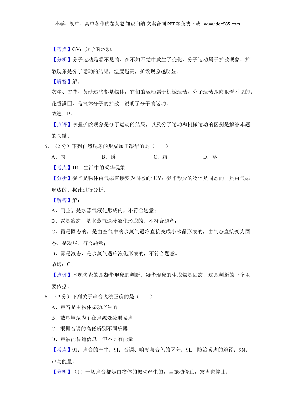 小学、初中、高中各种试卷真题知识归纳文案合同PPT等免费下载www.doc985.com2017年湖南省湘潭市中考物理试卷(教师版)一、选择题(共18小题,每小题2分,满分36分)1.(2分)发现电流周围存在磁场的科学家是()A.牛顿B.安培C.焦耳D.奥斯特【考点】2R:物理常识.【分析】根据物理学史知识、物理学家对物理学的主要贡献,分析解答此题。【解答】解:A、牛顿在力学中的贡献非常大,其发现并总结了牛顿第一运动定律,故A不符合题意;B、安培发现了安培定则,故B不符合题意;C、焦耳发现了焦耳定律,故C不符合题意;D、1820年,丹麦物理学家奥斯特发现了电流的磁效应,发现电流周围存在磁场,故D符合题意。故选:D。【点评】多了解物理学史对培养我们学习物理的兴趣是有帮助的,所以考试中也时有涉及,在学习中应注意。2.(2分)以下有关初三学生的数据合理的是()A.身高是162mB.正常体温45℃C.体重是500ND.步行速度为10m/s【考点】13:温度;63:长度的估测;68:速度与物体运动;77:重力大小的估测.【分析】首先对题目中涉及的物理量有个初步的了解,对于选项中的单位,可根据需要进行相应的换算或转换,排除与生活实际相差较远的选项,找出符合生活实际的答案。【解答】解:A、成年人的身高在170cm左右,中学生的身高略小于成年人,在162cm=1.62m左右。故A不符合实际;B、正常情况下,人的体温在37℃左右,变化幅度很小。故B不符合实际;C、中学生的质量在50kg左右,受到的重力大约为G=mg=50kg×10N/kg=500N左右。故C符合实际;D、中学生正常步行的速度在4km/h=4×m/s≈1.1m/s左右。故D不符合实际。小学、初中、高中各种试卷真题知识归纳文案合同PPT等免费下载www.doc985.com故选:C。【点评】物理学中,对各种物理量的估算能力,是我们应该加强锻炼的重要能力之一,这种能力的提高,对我们的生活同样具有很大的现实意义。3.(2分)下列现象中,由光的折射形成的是()A.“折断”的筷子B.镜中的人C.水中的荷花D.墙上的手影【考点】AM:光的折射现象及其应用.【分析】判断此题要掌握好三种光的现象:光在同种均匀介质中沿直线传播,如:激光准直、小孔成像和影子的形成等;当光照射到两种物质分界面上时,有一部分光被反射回来发生反射现象,如:平面镜成像、水中倒影等;当光从一种介质斜射入另一种介质时,传播方向的会改变,发生折射现象,如:看水里的鱼比实际位置浅等。【解答】解:A、人看到的水下的筷子是虚像,比实际向上弯折,是由于光的折射形成的,故A正确;B、镜中的人属于平面镜成像,是由光的反射形成的,故B错误;C、平静的水面相当于平面镜,荷花在水中的“倒影”相当于平面镜成的像,是光的反射原理,故C错误;D、手在墙壁上的影子由于光的直线传播造成的,故D错误。故选:A。【点评】学习光的直线传播、光的反射、光的折射时,要多留心生活中的实例,影子、日月食、小孔成像是光的直线传播;镜子、倒影、潜望镜是光的反射;看水中的物体、隔着玻璃、杯子或透镜看物体是光的折射。4.(2分)下列现象表明分子做无规则运动的是()A.灰尘四起B.花香满园C.雪花飘飘D.黄沙扑面小学、初中、高中各种试卷真题知识归纳文案合同PPT等免费下载www.doc985.com【考点】GV:分子的运动.【分析】分子运动是看不见的,在不知不觉中发生了变化,分子运动属于扩散现象。扩散现象是分子运动的结果,温度越高,扩散现象越明显。【解答】解:灰尘、雪花、黄沙这些都是物体,它们的运动属于机械运动,分子运动是肉眼看不见的;花香满园,是气体分子的扩散,说明了分子的运动。故选:B。【点评】掌握扩散现象是分子运动的结果,以及分子运动和机械运动的区别是解答本题的关键。5.(2分)下列自然现象的形成属于凝华的是()A.雨B.露C.霜D.雾【考点】1R:生活中的凝华现象.【分析】凝华是物体由气态直接变为固态的过程;凝华形成的物体是固态的,是由气态形成的。据此进行分析。【解答】解:A、雨主要是水蒸气液化形成的,不符合题意;B、露是液态,是水蒸气遇冷液化形成的,不符合题意;C、霜是固态的,是由空气中的水蒸气遇冷直接变成小冰晶形成...