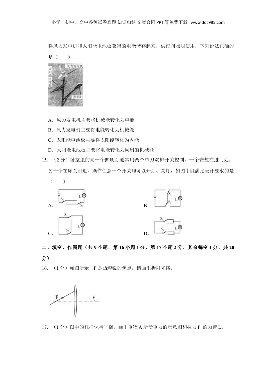 小学、初中、高中各种试卷真题知识归纳文案合同PPT等免费下载www.doc985.com2013年湖南省湘潭市中考物理试卷一、选择题(共15小题,每小题2分,满分31分)1.(2分)以科学家的名字“焦耳”作为单位的物理量是()A.力B.功C.功率D.电流2.(2分)乘客坐在逆流行驶的游轮上,我们说他静止是以哪个对象为参照物()A.江岸的码头B.游轮的船舱C.迎面驶来的汽艇D.奔流的江水3.(2分)图中烛焰上方的空气受热后向上运动,这是由于这部分空气升温后()A.压强变小B.质量变小C.密度变小D.体积变小4.(2分)在繁华的闹市区设立噪声检测器,这是测定声音的()A.音调B.响度C.音色D.声速5.(2分)下列光学仪器可以成正立、等大的虚像是()A.照相机B.平面镜C.显微镜D.幻灯机6.(2分)下列交通工具中,动力设备不是热机的是()A.远洋轮船B.载重汽车C.战斗机D.电动摩托7.(2分)下列所示工具中,使用时能省距离但不省力的是()A.B.C.D.8.(2分)手机在通话时,可听到远方通话者的声音,则从手机中听到通话者的声音和手机接收到的信号分别是()A.声波和声波B.电磁波和声波C.声波和电磁波D.电磁波和电磁波小学、初中、高中各种试卷真题知识归纳文案合同PPT等免费下载www.doc985.com9.(3分)LED高效节能灯,其核心元件是发光二极管,二极管是由下列哪种材料制成()A.合金材料B.超导材料C.半导体材料D.磁性材料10.(2分)如图所示,R是用铅笔芯做成的变阻器,闭合开关,将导线夹向右移动,小灯泡的亮度将()A.变暗B.先变暗后变亮C.变亮D.先变亮后变暗11.(2分)如图所示,就在磁铁中的线圈A和B,用导线串联,当用力使线圈A向右运动时,发现悬挂的线圈B也随着摆动,此时线圈A,B各自的实验原理与下列设备的工作原理相对应的是()A.发电机、电动机B.电动机、发电机C.发电机、发电机D.电动机、电动机12.(2分)如图所示,人参浸泡在酒中,透过圆形酒瓶看到人参的大小比实际人参()A.大B.小C.一样大D.可能小13.(2分)通过直接感知的现象,推测无法直接感知的事实,是常用的物理方法,下列推测不合理的是()A.现象:先看到闪电后听到雷声推测:光速大于声速B.现象:用鱼叉瞄准水中的鱼总又不中推测:从水中射出的光线偏折了C.现象:某物体熔化时,温度保持不变推测:该物体是晶体D.现象:水很难被压缩推测:分子间没有间隙14.(2分)长潭高速全程安装了如图所示的“风光互补”路灯,该路灯内的蓄电池分别小学、初中、高中各种试卷真题知识归纳文案合同PPT等免费下载www.doc985.com将风力发电机和太阳能电池板获得的电能储存起来,供夜间照明使用,下列说法正确的是()A.风力发电机主要将机械能转化为电能B.风力发电机主要将电能转化为机械能C.太阳能电池板主要将太阳能转化为内能D.太阳能电池板主要将电能转化为风扇的机械能15.(2分)卧室里的同一个照明灯通常用两个单刀双掷开关控制,一个安装在进门处,另一个在床头附近,操作任意一个开关均可以开灯、关灯,如图中能满足设计要求的是()A.B.C.D.二、填空、作图题(共9小题,第16小题1分,第17小题2分,其余每空1分,共20分)16.(1分)如图所示,F是凸透镜的焦点,请画出折射光线。17.(1分)图中的杠杆保持平衡,画出重物A所受重力的示意图和拉力F1的力臂L。小学、初中、高中各种试卷真题知识归纳文案合同PPT等免费下载www.doc985.com18.(1分)如图所示,用直尺测得物体A的长度是cm。19.(2分)家庭电路中,控制电灯的开关应接在线上,并且与电灯联。20.(3分)为保证校车行驶安全,规定车速不得超过40km/h,“40km/h”是指校车行驶过程中的(填“最大”“平均”或“最小”)速度;校车行驶时,要求每位学生系好安全带,这是为了防止紧急刹车时,学生由于具有而造成伤害,小车刹车后能迅速停下来,说明力可以改变物体的。21.(3分)工人用400N的拉力,通过如图所示滑轮组,将重600N的物体竖直匀速提升2m,人将绳拉下m,人拉绳做的功为J,滑轮组的机械效率为%。22.(2分)用调节好的天平测量石块的质量,所用砝码和游码位置如图所示,石块质量为g,用...