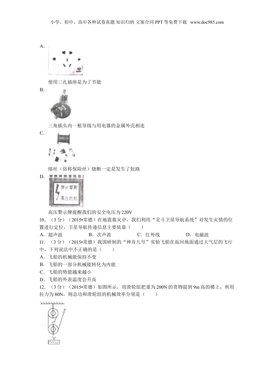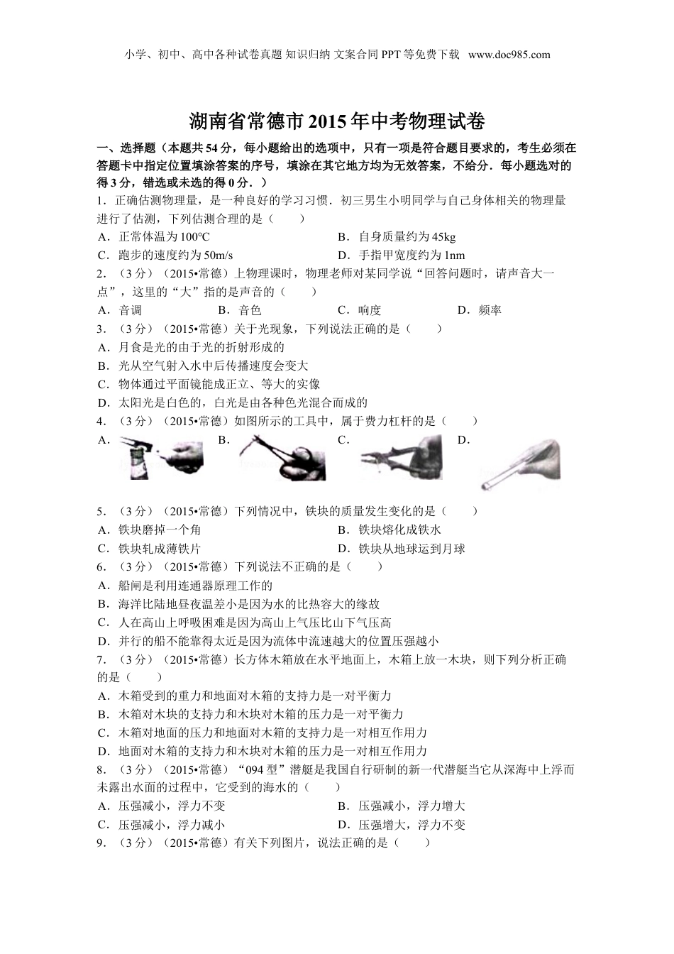 小学、初中、高中各种试卷真题知识归纳文案合同PPT等免费下载www.doc985.com湖南省常德市2015年中考物理试卷一、选择题(本题共54分,每小题给出的选项中,只有一项是符合题目要求的,考生必须在答题卡中指定位置填涂答案的序号,填涂在其它地方均为无效答案,不给分.每小题选对的得3分,错选或未选的得0分.)1.正确估测物理量,是一种良好的学习习惯.初三男生小明同学与自己身体相关的物理量进行了估测,下列估测合理的是()A.正常体温为100℃B.自身质量约为45kgC.跑步的速度约为50m/sD.手指甲宽度约为1nm2.(3分)(2015•常德)上物理课时,物理老师对某同学说“回答问题时,请声音大一点”,这里的“大”指的是声音的()A.音调B.音色C.响度D.频率3.(3分)(2015•常德)关于光现象,下列说法正确的是()A.月食是光的由于光的折射形成的B.光从空气射入水中后传播速度会变大C.物体通过平面镜能成正立、等大的实像D.太阳光是白色的,白光是由各种色光混合而成的4.(3分)(2015•常德)如图所示的工具中,属于费力杠杆的是()A.B.C.D.5.(3分)(2015•常德)下列情况中,铁块的质量发生变化的是()A.铁块磨掉一个角B.铁块熔化成铁水C.铁块轧成薄铁片D.铁块从地球运到月球6.(3分)(2015•常德)下列说法不正确的是()A.船闸是利用连通器原理工作的B.海洋比陆地昼夜温差小是因为水的比热容大的缘故C.人在高山上呼吸困难是因为高山上气压比山下气压高D.并行的船不能靠得太近是因为流体中流速越大的位置压强越小7.(3分)(2015•常德)长方体木箱放在水平地面上,木箱上放一木块,则下列分析正确的是()A.木箱受到的重力和地面对木箱的支持力是一对平衡力B.木箱对木块的支持力和木块对木箱的压力是一对平衡力C.木箱对地面的压力和地面对木箱的支持力是一对相互作用力D.地面对木箱的支持力和木块对木箱的压力是一对相互作用力8.(3分)(2015•常德)“094型”潜艇是我国自行研制的新一代潜艇当它从深海中上浮而未露出水面的过程中,它受到的海水的()A.压强减小,浮力不变B.压强减小,浮力增大C.压强减小,浮力减小D.压强增大,浮力不变9.(3分)(2015•常德)有关下列图片,说法正确的是()小学、初中、高中各种试卷真题知识归纳文案合同PPT等免费下载www.doc985.comA.使用三孔插座是为了节能B.三角插头内一根导线与用电器的金属外壳相连C.熔丝(俗称保险丝)烧断一定是发生了短路D.高压警示牌提醒我们的安全电压为220V10.(3分)(2015•常德)在地震救灾中,我们利用“北斗卫星导航系统”对发生灾情的位置进行定位,卫星导航传递信息主要依靠()A.超声波B.次声波C.红外线D.电磁波11.(3分)(2015•常德)我国研制的“神舟九号”实验飞船在返回地面通过大气层的飞行中,下列说法中不正确的是()A.飞船的机械能保持不变B.飞船的一部分机械能转化为内能C.飞船的势能越来越小D.飞船的外表温度会升高12.(3分)(2015•常德)如图所示,用滑轮组把重为200N的货物提到9m高的楼上,所用拉力为80N,则总功和滑轮组的机械效率分别是()小学、初中、高中各种试卷真题知识归纳文案合同PPT等免费下载www.doc985.comA.1400J80%B.1800J80%C.1800J83.3%D.2160J83.3%13.(3分)(2015•常德)关于能量和信息,下列说法正确的是()A.化石能源、水能、风能均是可再生能源B.目前核电站是利用核聚变释放的能量来发电C.光纤通信是利用激光通过光导纤维来传递信息D.汽油机工作时,将机械能转化为内能14.(3分)(2015•常德)关于热现象,下列说法正确的是()A.雾的形成是液化现象,需要吸热B.冰变成水是熔化现象,需要吸热C.冬天呼出的“白气”是汽化现象,需要吸热D.衣柜里的樟脑丸变小是升华现象,需要放热15.(3分)(2015•常德)如图所示的实验中,演示磁场对通电导体有力的作用的是()A.B.C.D.16.(3分)(2015•常德)甲、乙两个灯泡的铭牌分别是“PZ22025”﹣、“PZ220100”﹣,关于这两个灯泡的描述正确的是()A.甲灯的灯丝粗,电阻大B.甲灯的灯丝细,电阻大C.乙灯的灯丝细,电阻小...
