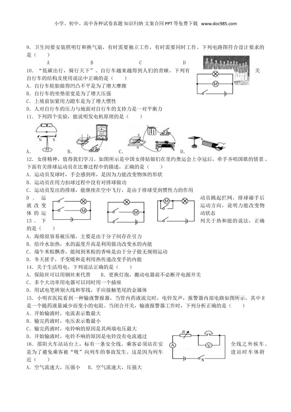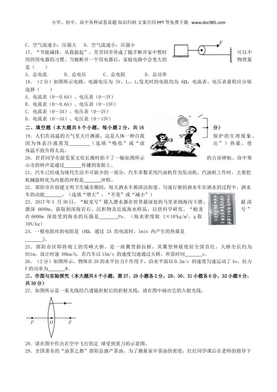 小学、初中、高中各种试卷真题知识归纳文案合同PPT等免费下载www.doc985.com2017年湖南省邵阳市中考物理真题及答案一、选择题(只有一项最符合题意.本大题共18个小题,共36分)1.2017年4月27日,我国的天舟一号货运飞船与天宫二号空间实验室成功对接,首次完成推进剂在轨补加试验,实现了空间推进领域的一次重大技术跨越。如图是它们成功对接时的情形,此时若认为天宫二号是静止的,则所选的参照物是()A.太阳B.月亮C.地球D.天舟一号2.下列关于我们考室里一张单人课桌的估测,最接近实际的是()A.课桌质量约为50kgB.课桌高度约为0.8mC.桌面面积约为4m2D.课桌抽屉容积约为1m33.如图所示是某种物质在熔化过程中温度随时间变化规律的图象,根据图象可知,该物质()A.是晶体,熔点是0℃B.液态的比热容比固态的比热容小C.在4min时,没有出现液态D.在2min至6min过程中内能不变4.为弘扬中华传统文化,邵阳市举办了全市中学生汉字听写大赛。下列词语中涉及的物理现象和对它的解释相符的是()A.清澈见底﹣﹣光的反射B.坐井观天﹣﹣光的折射C.海市蜃楼﹣﹣光的直线传播D.波光粼粼﹣﹣光的反射5.在如图所示的简单机械中,属于省力杠杆的是()A.用钓鱼竿钓鱼B.用锤子撬钉子C.用筷子夹食物D.用镊子取药品6.下列关于光的知识应用的说法,不正确的是()A.照相机的原理是利用凸透镜能成正立、缩小的实像B.电视机遥控器是利用红外线实现遥控的C.近视眼镜是利用凹透镜对光的发散作用D.投影仪的原理是利用凸透镜能成倒立、放大的实像7.下列自然现象的形成过程中,属于凝华的是()A.春天缥缈的雾B.夏天晶莹的露C.秋天轻柔的霜D.冬天凝重的冰8.关于能源、电磁波与信息技术的说法正确的是()A.太阳能、风能、天然气是可再生能源B.光纤通信主要利用电信号传递信息C.手机既能发射电磁波也能接收电磁波D.卫星导航系统主要靠超声波来传递信息小学、初中、高中各种试卷真题知识归纳文案合同PPT等免费下载www.doc985.com9.卫生间要安装照明灯和换气扇,有时需要独立工作,有时需要同时工作。下列电路图符合设计要求的是()ABCD10.“低碳出行,骑行天下”。自行车越来越得到人们的青睐。下列有关自行车的结构及使用说法中正确的是()A.自行车轮胎做得凹凸不平是为了增大摩擦B.自行车的坐垫很宽是为了增大压强C.上坡前加紧用力蹬车是为了增大惯性D.人对自行车的压力与地面对自行车的支持力是一对平衡力11.下列四个实验,能说明发电机原理的是()A.B.C.D.12.女排精神,值得我们学习。如图所示是中国女排姑娘们在里约奥运会上夺冠后,牵手齐唱国歌的情景。下面有关排球运动员在比赛过程中的描述,正确的是()A.运动员发球时,手会感到疼,是因为力能改变物体的形状B.运动员在用力扣球过程中没有对排球做功C.运动员发出的排球,能继续在空中飞行,是由于排球受到惯性力的作用D.运动员跳起拦网,排球碰手后就改变运动方向,说明力能改变物体的运动状态13.下列关于热和能的说法,正确的是()A.海绵很容易被压缩,主要是由于分子间存在引力B.给冷水加热,水的温度升高是利用做功改变水的内能C.端午米粽飘香,能闻到米粽的香味是由于分子做无规则运动D.冬天搓手,手变暖和是利用热传递改变手的内能14.关于生活用电,下列说法正确的是()A.保险丝可以用钢丝来代替B.更换灯泡,搬动电器前不必断开电源开关C.多个大功率用电器可以同时用一个插座D.用试电笔辨别火线和零线,手应接触笔尾的金属体15.小明在医院看到一种输液警报器,当管内药液流完时,电铃发声,报警器内部电路如图所示,其中R是一个随药液量减少而变小的电阻。当闭合开关,输液报警器工作时,下列分析正确的是()A.开始输液时,电流表示数最大B.输完药液时,电压表示数最小C.输完药液时,电铃响的原因是其两端电压最大D.开始输液时,电铃不响的原因是电铃没有电流通过16.邵阳火车站站台上,标有一条安全线。乘客必须站在安全线之外候车。是为了避免乘客被“吸”向列车的事故发生。这是因为列车进站时车体附近()A.空气流速大,压强小B.空气流速大,压强大小学、...