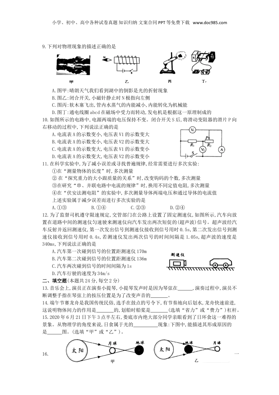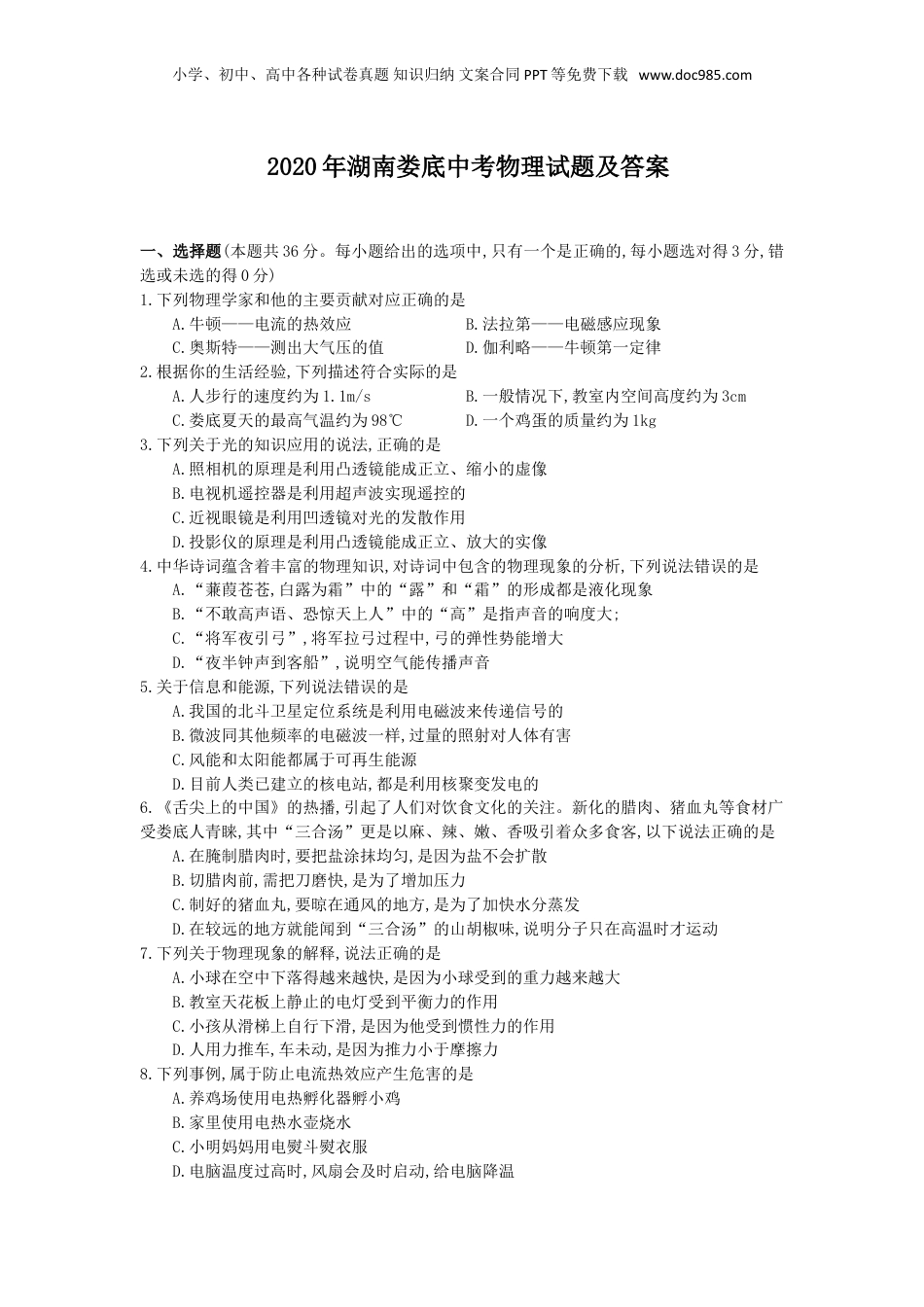 小学、初中、高中各种试卷真题知识归纳文案合同PPT等免费下载www.doc985.com2020年湖南娄底中考物理试题及答案一、选择题(本题共36分。每小题给出的选项中,只有一个是正确的,每小题选对得3分,错选或未选的得0分)1.下列物理学家和他的主要贡献对应正确的是A.牛顿——电流的热效应B.法拉第——电磁感应现象C.奥斯特——测出大气压的值D.伽利略——牛顿第一定律2.根据你的生活经验,下列描述符合实际的是A.人步行的速度约为1.1m/sB.一般情况下,教室内空间高度约为3cmC.娄底夏天的最高气温约为98℃D.一个鸡蛋的质量约为1kg3.下列关于光的知识应用的说法,正确的是A.照相机的原理是利用凸透镜能成正立、缩小的虚像B.电视机遥控器是利用超声波实现遥控的C.近视眼镜是利用凹透镜对光的发散作用D.投影仪的原理是利用凸透镜能成正立、放大的实像4.中华诗词蕴含着丰富的物理知识,对诗词中包含的物理现象的分析,下列说法错误的是A.“蒹葭苍苍,白露为霜”中的“露”和“霜”的形成都是液化现象B.“不敢高声语、恐惊天上人”中的“高”是指声音的响度大;C.“将军夜引弓”,将军拉弓过程中,弓的弹性势能增大D.“夜半钟声到客船”,说明空气能传播声音5.关于信息和能源,下列说法错误的是A.我国的北斗卫星定位系统是利用电磁波来传递信号的B.微波同其他频率的电磁波一样,过量的照射对人体有害C.风能和太阳能都属于可再生能源D.目前人类已建立的核电站,都是利用核聚变发电的6.《舌尖上的中国》的热播,引起了人们对饮食文化的关注。新化的腊肉、猪血丸等食材广受娄底人青睐,其中“三合汤”更是以麻、辣、嫩、香吸引着众多食客,以下说法正确的是A.在腌制腊肉时,要把盐涂抹均匀,是因为盐不会扩散B.切腊肉前,需把刀磨快,是为了增加压力C.制好的猪血丸,要晾在通风的地方,是为了加快水分蒸发D.在较远的地方就能闻到“三合汤”的山胡椒味,说明分子只在高温时才运动7.下列关于物理现象的解释,说法正确的是A.小球在空中下落得越来越快,是因为小球受到的重力越来越大B.教室天花板上静止的电灯受到平衡力的作用C.小孩从滑梯上自行下滑,是因为他受到惯性力的作用D.人用力推车,车未动,是因为推力小于摩擦力8.下列事例,属于防止电流热效应产生危害的是A.养鸡场使用电热孵化器孵小鸡B.家里使用电热水壶烧水C.小明妈妈用电熨斗熨衣服D.电脑温度过高时,风扇会及时启动,给电脑降温小学、初中、高中各种试卷真题知识归纳文案合同PPT等免费下载www.doc985.com9.下列对物理现象的描述正确的是A.图甲:晴朗天气我们看到湖中的倒影是光的折射现象B.图乙:闭合开关,小磁针静止时N极指向左侧C.图丙:软木塞飞出,管内水蒸气的内能减小,内能转化为机械能D.图丁:通电线圈abcd在磁场中受力而转动,发电机是根据这一原理制成的10.如图所示的电路中,电源两端的电压保持不变。闭合开关S后,将滑动变阻器的滑片P向右移动的过程中,下列说法正确的是A.电流表A的示数变小,电压表V1的示数变大B.电流表A的示数变小,电压表V2的示数变大C.电流表A的示数变大,电压表V1的示数变小D.电流表A的示数变大,电压表V2的示数变小11.在科学实验中,为了减小误差或寻找普遍规律,经常需要进行多次实验:①在“测量物体的长度”时,多次测量②在“探究重力的大小跟质量的关系”时,改变钩码的个数,多次测量③在研究“串、并联电路中电流的规律”时,换用不同定值电阻,多次测量④在“伏安法测电阻”的实验中,多次测量导体两端电压和通过导体的电流值上述实验属于减少误差而进行多次实验的是A.①③B.①④C.②③D.②④12.为了监督司机遵守限速规定,交管部门在公路上设置了固定测速仪,如图所示,汽车向放置在道路中间的测速仪匀速驶来测速仪向汽车发出两次短促的(超声波)信号。超声波经汽车反射并返回测速仪,第一次发出信号到测速仪接收到信号用时0.5s,第二次发出信号到测速仪接收到信号用时0.4s,若测速仪发出两次信号的时间间隔是1.05s,超声波的速度是340ms,下列说法正确的是A.汽车第一次碰到信号的位置距测速仪170mB.汽车第二次碰到信号的位置距测速仪136mC.汽车两次碰到信号的时间间隔为1sD.汽车行驶的速度为34m/s二、填空题(本题共24分,每空2分)13.音乐会上,演员正在演奏小...
