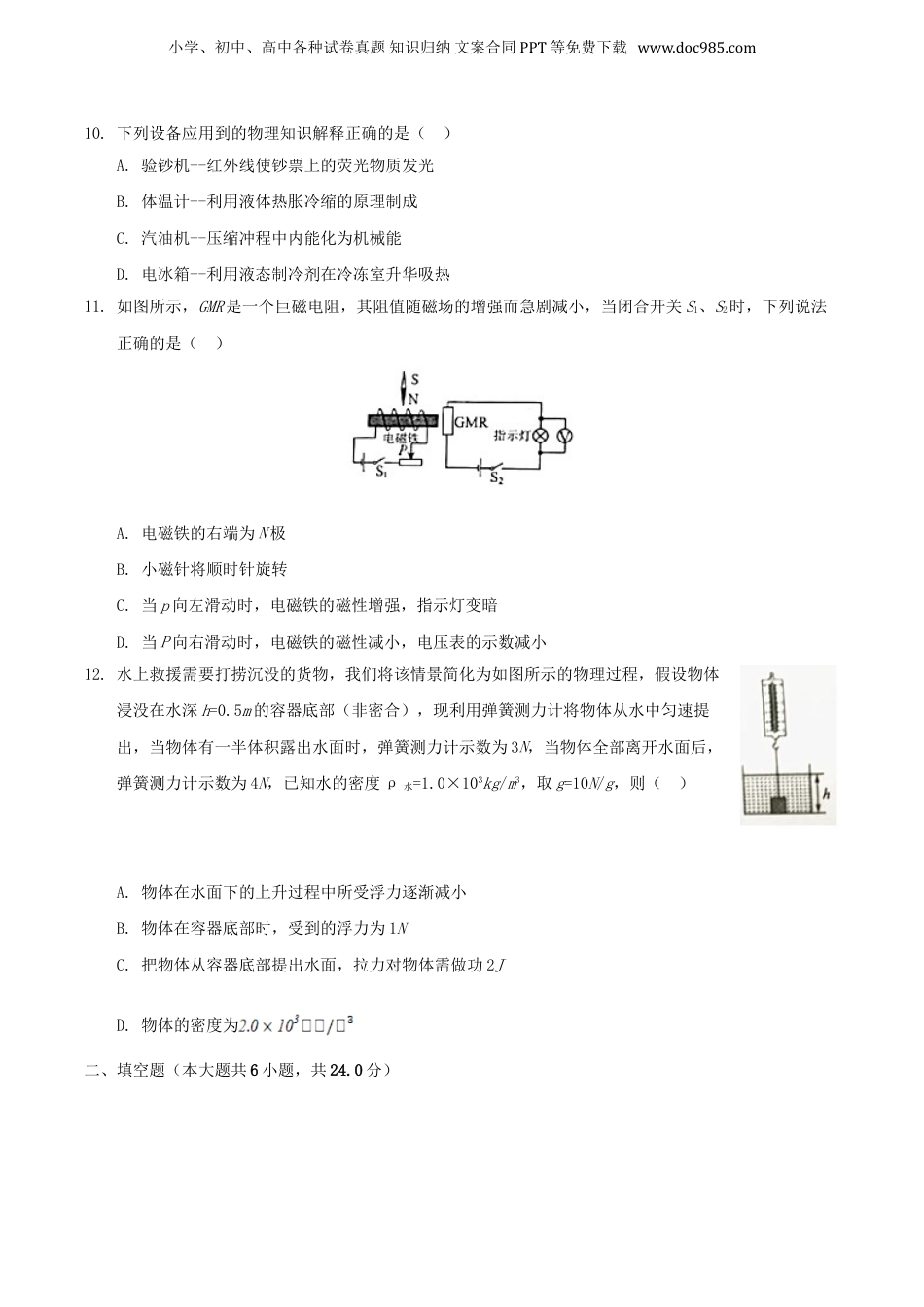 小学、初中、高中各种试卷真题知识归纳文案合同PPT等免费下载www.doc985.com2019年湖南省娄底市中考物理试题及答案解析一、单选题(本大题共12小题,共36.0分)1.下列估算数据最接近事实的是()A.一部华为5G手机的质量约2kgB.人体的电阻大约为C.家用液晶电视机额定功率约100WD.教室门的高度约180mm2.关于声现象的说法正确的是()A.物体的振幅越大音调越高B.声音在真空中的传播速度是C.打雷时捂住耳朵可以防止雷声的产生D.地震、火山喷发等自然现象都伴有次声波的产生3.清代诗人袁枚的《苔》:“白日不到处,青春恰自来。苔花如米小,也学牡丹开”其中“白日不到处”主要涉及的物理知识是()A.光的直线传播B.光的反射C.光的折射D.光的色散4.用一段细铁丝做一个支架作为转动轴,把一根中间戳有小孔(没有戳穿)的饮料吸管放在转动轴上,吸管能在水平面内自由转动(如图所示)。用餐巾纸摩擦吸管使其带电,将带负电的橡胶棒靠近带电吸管的一端时,发现吸管被推开,下列说法正确的是()A.吸管和橡胶棒带异种电荷B.吸管和餐巾纸摩擦后,两者带同种电荷C.吸管和餐巾纸摩擦时,吸管得电子带负电D.吸管和餐巾纸摩擦时,吸管失电子带负电5.学习了分子动理论之后,小明总结了很多生活中与分子动理论有关的现象,下列总结中不正确的是()A.“花气袭人知骤暖”说明分子的热运动与温度有关B.人造木板黏结剂中的甲醛扩散到空气中造成环境污染C.用透明胶带揭下纸上写错的字,是因为胶带与纸之间有相互的斥力D.“破镜不能重圆”是分子间的距离太大,作用力变得十分微弱小学、初中、高中各种试卷真题知识归纳文案合同PPT等免费下载www.doc985.com6.如图所示,电源电压保持不变,闭合开关S,当滑动变阻器的滑片P向左移动时,下列说法正确的是()A.通过滑动变阻器的电流变小B.电路中的总电流不变C.电流表和电压表的示数都逐渐变大D.电压表示数与电流表示数的比值不变7.下列关于能源与可持续发展及信息传递的叙述中正确的是()A.石油是可再生能源B.娄底广播电台发射的电磁波是靠电流的迅速变化产生的C.北斗3号卫星定位系统传递信息利用的是超声波D.太阳内部每时每刻都在发生着核裂变释放巨大的核能8.现在各学校都在开展“足球进校园”活动,关于同学们在足球比赛中涉及的物理知识,下列分析正确的是()①足球鞋底凹凸不平,是为了减小与地面的接触面积,从而减小摩擦力②用头顶足球攻门时,头感到疼,说明物体间力的作用是相互的③足球能在空中飞行,是因为运动员对飞行的足球仍有力的作用④守门员及时截住射门的足球,说明力可以改变物体的运动状态A.B.C.D.9.在“探究影响电流热效应的因素”实验中,可通过观察U型管中液面高度变化来比较电阻产生热量的多少(如图),以下研究中所采用方法与此相同的是()A.通过观察小磁针的偏转判定电流周围是否存在磁场B.用水流类比电流来建立电流的概念C.用温度--时间图象来描述固体熔化过程D.探究导体电阻大小与横截面积的关系时需保持材料和长度不变小学、初中、高中各种试卷真题知识归纳文案合同PPT等免费下载www.doc985.com10.下列设备应用到的物理知识解释正确的是()A.验钞机--红外线使钞票上的荧光物质发光B.体温计--利用液体热胀冷缩的原理制成C.汽油机--压缩冲程中内能化为机械能D.电冰箱--利用液态制冷剂在冷冻室升华吸热11.如图所示,GMR是一个巨磁电阻,其阻值随磁场的增强而急剧减小,当闭合开关S1、S2时,下列说法正确的是()A.电磁铁的右端为N极B.小磁针将顺时针旋转C.当p向左滑动时,电磁铁的磁性增强,指示灯变暗D.当P向右滑动时,电磁铁的磁性减小,电压表的示数减小12.水上救援需要打捞沉没的货物,我们将该情景简化为如图所示的物理过程,假设物体浸没在水深h=0.5m的容器底部(非密合),现利用弹簧测力计将物体从水中匀速提出,当物体有一半体积露出水面时,弹簧测力计示数为3N,当物体全部离开水面后,弹簧测力计示数为4N,已知水的密度ρ水=1.0×103kg/m3,取g=10N/g,则()A.物体在水面下的上升过程中所受浮力逐渐减小B.物体在容器底部时,受到的浮力为1NC.把物体从容器底部提出水面,拉力对物体需做功2JD.物体的密度为二、填...