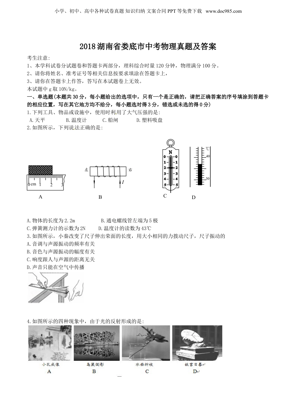 小学、初中、高中各种试卷真题知识归纳文案合同PPT等免费下载www.doc985.com2018湖南省娄底市中考物理真题及答案考生注意:1、本学科试卷分试题卷和答题卡两部分,理科综合时量120分钟,物理满分100分。2、请你将姓名、准考证号等相关信息按要求填涂在答题卡上,3、请你在答题卡上作答,答写在本试题卷上无效。本试题中g取10N/kg。一、单选题(本题共30分,每小题给出的选项中,只有一个是正确的,请把正确答案的序号填涂到答题卡的相应位置,写在其它地方均不给分,每小题选对得3分,错选或未选的得0分)1.下列工具、物品或设施中,使用时利用了大气压强的是:A.天平B.温度计C.船闸D.塑料吸盘2.如图所示,下列说法正确的是:[来源:Z&xx&k.Com][来源:学。科。网Z。X。X。K]A.物体的长度为2.2mB.通电螺线管左端为5极C.弹簧测力计的示数为2ND.温度计的读数为43℃3.如图所示,小秦改变了尺子伸出荣面的长度,用大小相同的力拨动尺子,尺子振动的A.音调与声源振动的频率有关B.音色与声源振动的幅度有关C.响度跟人与声源的距离无关D.声音只能在空气中传播4.如图所示的四种现象中,由于光的反射形成的是:ABIDC0123cm40℃30左右小学、初中、高中各种试卷真题知识归纳文案合同PPT等免费下载www.doc985.com5.全国中小学安全教育平台”和物理学科都强调了安全用电。下列做法符合’安全用电要求的是:A.选用插座时,所有家用电器都使用两孔插座B.更换灯泡时,不需断开电源开关C.有人触电时,首先切断电源D.家用电器电线绝缘皮破损了仍继续使用6.共享单车是节能环保的交通工具。关于小秦骑共享单车上学的情形,下列说法正确的是:A.小秦骑行的速度最高可以达到50m/sB.小秦骑车转弯时,运动状态没有发生改变C.小秦下坡时不蹬车,单车越来越快是因为惯性增大[来源:学科网]D.在骑行过程中,相对于路旁的建筑物是运动的7.小明从电冰箱的冷冻室拿出一块猪肉解冻,一会儿小明发现肉上起了一些白箱,这A.冰的熔解现象,吸热B.冰的汽化现象,吸热C.水蒸气的凝华现象,放热D.水蒸气的凝固现象,放热8.在平直的公路上,小明坐在车上用电子手表的秒表功能测出了汽车连续通过5根电线杆的时间为10s,相邻电线杆的距离为50米,则汽车的平均速度约为A.90km/hB.70km/hC.50km/hD.40km/h9.社团活动在娄底各校轰轰烈烈开展,小明参加了杂技社团,他常常在平整松软的土地上练习单脚站立和单手倒立。当他单脚站立时,在地面上留下了一个凹陷的鞋印,单手倒立时留下了一个凹陷的手掌印,那么A.单脚站立时对地面的压力大于单手倒立时对地面的压力B.单脚站立时对地面的压力小于单手倒立时对地面的压力C.手掌印凹陷的深度大于鞋印凹陷的深度D.手掌印凹陷的深度等于鞋印凹陷的深度10.甲图是灯泡L和定值电阻R的I-U图象,将L和R先后以乙图和丙图两种方式连在同电源上,若乙图中UL:UR=m,丙图中,IL:IR=n,则下述正确的是:A.m=nB、m>nC.m<nD.mn=1小学、初中、高中各种试卷真题知识归纳文案合同PPT等免费下载www.doc985.com二、填空题(本题共24分,每空2分,答案填写在答题卡的相应位置)11.太阳是巨大的“核能火炉”,是人类能源的宝库。(1)太阳光通过三楼镜,被分解成影色光束的现象叫做(2)核能在些发达国家已成为常规能源,它是能源(选填“可再生”或“不可再生”)。12.如图所示,闭合开关,将滑动变阻器滑片向右滑动,弹簧将(选填“伸长”或“缩短”。如果用电流表替代虚线框内仪器,然后将条形磁体迅速插入线圈中,与之相连的电流表的指针会发生偏转,这是_现象。[来源:学+科+网Z+X+X+K]13.现有“220V100W”的电灯泡一只,将它接在电压为“110V”的电路中,实际功率为_____W,消耗1kWh的电能可供它连续工作___h14.劣质的油性油漆、板材、涂料、胶粘剂等材料含有较多的甲醛、苯、二甲苯等有毒有机物,用来装修房屋,会造成室内环境污染,这是因为有毒有机物分子都在做永不停息的无规则运动,这种现象在夏天时特别严重,因为越高,越剧烈。15.研究物理问题时常常用到“控制变量法”、“等效替代法”、“模型法”、“类比法”等方法,下面是初中物理中的几个研究实例:①用总电阻表示同一段电路上串联的两个电阻;②弹簧形变时具有...