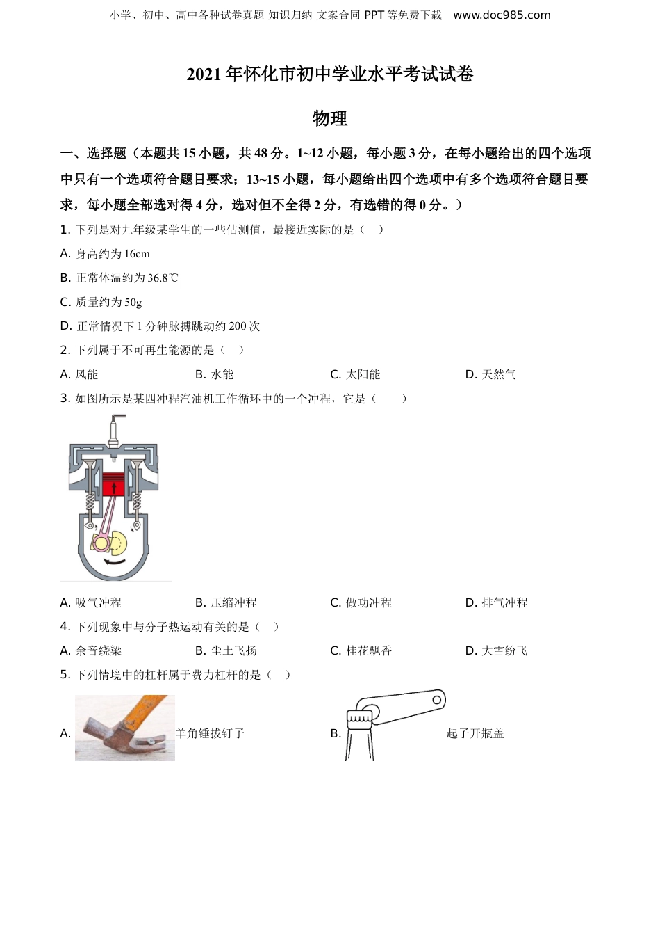 小学、初中、高中各种试卷真题知识归纳文案合同PPT等免费下载www.doc985.com2021年怀化市初中学业水平考试试卷物理一、选择题(本题共15小题,共48分。1~12小题,每小题3分,在每小题给出的四个选项中只有一个选项符合题目要求;13~15小题,每小题给出四个选项中有多个选项符合题目要求,每小题全部选对得4分,选对但不全得2分,有选错的得0分。)1.下列是对九年级某学生的一些估测值,最接近实际的是()A.身高约为16cmB.正常体温约为36.8℃C.质量约为50gD.正常情况下1分钟脉搏跳动约200次2.下列属于不可再生能源的是()A.风能B.水能C.太阳能D.天然气3.如图所示是某四冲程汽油机工作循环中的一个冲程,它是()A.吸气冲程B.压缩冲程C.做功冲程D.排气冲程4.下列现象中与分子热运动有关的是()A.余音绕梁B.尘土飞扬C.桂花飘香D.大雪纷飞5.下列情境中的杠杆属于费力杠杆的是()A.羊角锤拔钉子B.起子开瓶盖小学、初中、高中各种试卷真题知识归纳文案合同PPT等免费下载www.doc985.comC.镊子夹物D.钳子剪导线6.田径运动会上,运动员投出的铅球在下落过程中,下列说法正确的是()A.动能增加B.重力势能增加C.动能转化为重力势能D.机械能增加7.如图所示的电路中,电阻阻值。开关S闭合后,电阻、两端的电压分别为、。通过、的电流分别为、,下列判断正确的是()A.B.C.D.8.为迎接建党一百周年,师生们高唱《没有共产党就没有新中国》,以抒发浓浓的爱党爱国之情。“高唱”中的“高”形容的是声音的()A.响度B.音调C.音色D.速度9.关于能源、信息与材料,下列说法不正确的是()A.垃圾分类有利于环保和节约能源B.用光导纤维制成的光缆,可以在很短时间内传递大量的信息C.航空器材常采用密度大的合金,可以减小航空器的质量D.若用超导材料制造输电线可以大大降低电能损耗10.如图所示,将两只相同的气球在自己的头发上摩擦后,就可以让一只气球在另一只气球上方“跳舞”。对该现象解释正确的是()小学、初中、高中各种试卷真题知识归纳文案合同PPT等免费下载www.doc985.comA.摩擦的方法创造了电荷使两气球带了电B.摩擦的方法使气球分子发生转移而带电C.两气球因带了异种电荷而互相排斥D.这种相互排斥现象与验电器的两片金属箔张开时原理相同11.某人用水平方向的力推物体,使物体在粗糙程度相同的水平面上做匀速直线运动,下列说法正确的是()A.人对物体的推力等于水平面对物体的摩擦力B.若增大推力,物体仍做匀速直线运动C.若撤去推力,物体所受摩擦力增大D.若撤去推力,物体的运动状态不会发生改变12.在新型冠状病毒疫情防治期间,经常使用图甲所示的非接触式红外线测温枪。图乙是它的工作原理图,是定值电阻,R是红外线热敏电阻,其阻值随人体温度变化的图象如图丙所示。闭合开关S后,对该电路分析正确的是()A.体温越高,R的阻值越大B.体温越高,电压表的示数越大C.体温越低,R两端的电压越小D.体温越低,通过的电流越大13.关于安全用电,下列说法正确的有()A.检修电路前切断电源B.在电线上晾晒衣服C.空气开关跳闸后,可立即合上D.使用试电笔辨别零线和火线时,手应接触笔尾金属体14.在如图所示的四个实例中,与小孔成像原理相同的有()小学、初中、高中各种试卷真题知识归纳文案合同PPT等免费下载www.doc985.comA.玉带桥在水中的“倒影”B.日晷面上呈现晷针的影子C.筷子在水中“折断”D.手影游戏15.下列实验装置与探究内容相符的有()A.甲图可探究电流的磁效应B.乙图可探究发电机的工作原理C.丙图可探究发电机的工作原理D.丁图可探究电动机的工作原理二、填空题(本大题共8小题,每空1分,共16分。把答案写在答题卡横线上的空白处,不要求写出解题过程。)16.工程师把三峡水电站水库大坝设计成上窄下宽的形状,是因为水的深度越深,压强越______,(选填“大”或“小”)。当水库水深为100m时,坝底受到的水的压强是______Pa(已知,)。17.2021年5月15日,天问一号着陆巡视器成功着陆火星表面,它与地球控制台之间利用______(选填“电磁波”、“超声波”或“次声波”)来传递信息,地球控制台发出的指令经过2秒传播的距离是______m。18.寒冷的冬天,我们可以坐在电火箱内取暖...