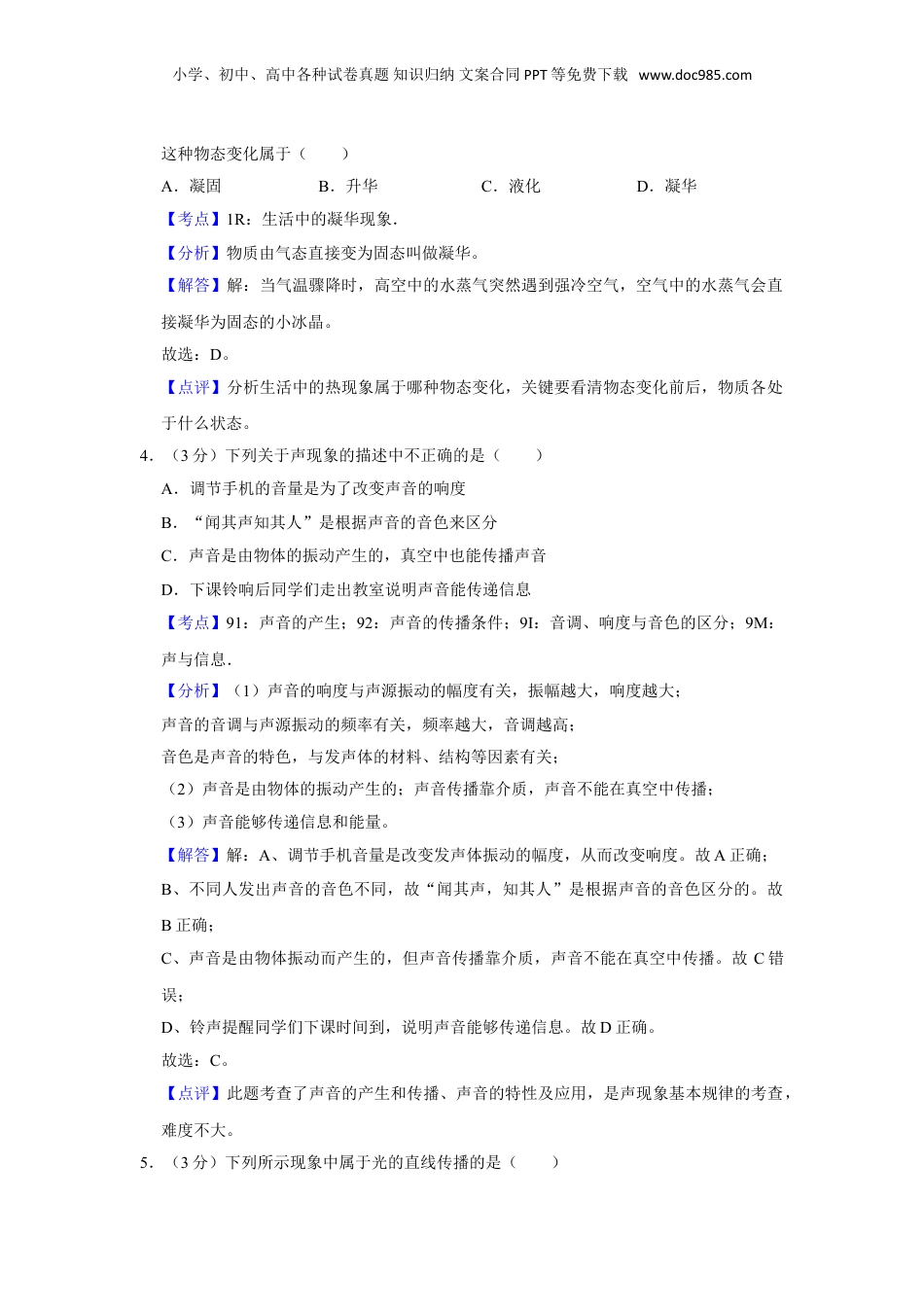 小学、初中、高中各种试卷真题知识归纳文案合同PPT等免费下载www.doc985.com2019年湖南省怀化市中考物理试卷(教师版)一、选择题(本大題包括16小题,每小題3分,共48分每小題只有一个选项符合题意)1.(3分)下列属于不可再生能源的是()A.煤B.风能C.太阳能D.水能【考点】K2:能源的分类.菁优网版权所有【分析】解答本题要清楚可再生能源与不可再生能源的区别,使用之后可以在短时间内从自然界中再次产生的能源是可再生能源,使用之后在短时间内无法在自然界中再次产生的能源是不可再生能源。【解答】解:A、根据可再生和不可再生能源的区别,可知:煤、石油、天然气等化石源是短时间内不能再次产生的,是不可再生能源;故A符合题意;BCD、太阳能、水能、风能等在短时间内可以再次产生或可以源源不断从自然界获得,是可再生能源,故BCD不合题意。故选:A。【点评】要掌握可再生能源和不可再生能源的特点。重点记住化石能源、核能是不可再生能源;太阳能、潮汐能、风、水能是可再生能源。2.(3分)下列物质在一般情况下都属于导体的是()A.石墨、塑料B.铜、大地C.橡胶、玻璃D.陶瓷、铜【考点】HJ:导体.菁优网版权所有【分析】善于导电的物体叫导体,如:各种金属、酸碱盐溶液、石墨、人体、大地等;不善于导电的物体叫绝缘体,如:玻璃、橡胶、陶瓷、空气、蒸馏水等。【解答】解:正常情况下,A、石墨是导体,塑料是绝缘体。故A不符合题意;B、铜和大地都是导体。故B符合题意;C、橡胶和玻璃都是绝缘体。故C不符合题意;D、陶瓷是绝缘体,铜是导体。故D不符合题意。故选:B。【点评】记忆一些常见的导体和绝缘体,遇到这类题型才能得心应手。3.(3分)在水循环中。高空中的水蒸气突然遇到强冷空气,温度急剧下降形成小冰晶。小学、初中、高中各种试卷真题知识归纳文案合同PPT等免费下载www.doc985.com这种物态变化属于()A.凝固B.升华C.液化D.凝华【考点】1R:生活中的凝华现象.菁优网版权所有【分析】物质由气态直接变为固态叫做凝华。【解答】解:当气温骤降时,高空中的水蒸气突然遇到强冷空气,空气中的水蒸气会直接凝华为固态的小冰晶。故选:D。【点评】分析生活中的热现象属于哪种物态变化,关键要看清物态变化前后,物质各处于什么状态。4.(3分)下列关于声现象的描述中不正确的是()A.调节手机的音量是为了改变声音的响度B.“闻其声知其人”是根据声音的音色来区分C.声音是由物体的振动产生的,真空中也能传播声音D.下课铃响后同学们走出教室说明声音能传递信息【考点】91:声音的产生;92:声音的传播条件;9I:音调、响度与音色的区分;9M:声与信息.菁优网版权所有【分析】(1)声音的响度与声源振动的幅度有关,振幅越大,响度越大;声音的音调与声源振动的频率有关,频率越大,音调越高;音色是声音的特色,与发声体的材料、结构等因素有关;(2)声音是由物体的振动产生的;声音传播靠介质,声音不能在真空中传播;(3)声音能够传递信息和能量。【解答】解:A、调节手机音量是改变发声体振动的幅度,从而改变响度。故A正确;B、不同人发出声音的音色不同,故“闻其声,知其人”是根据声音的音色区分的。故B正确;C、声音是由物体振动而产生的,但声音传播靠介质,声音不能在真空中传播。故C错误;D、铃声提醒同学们下课时间到,说明声音能够传递信息。故D正确。故选:C。【点评】此题考查了声音的产生和传播、声音的特性及应用,是声现象基本规律的考查,难度不大。5.(3分)下列所示现象中属于光的直线传播的是()小学、初中、高中各种试卷真题知识归纳文案合同PPT等免费下载www.doc985.comA.岸边的树木在水中的倒影B.铅笔在水中“折断”C.雨后彩虹D.投到车身上的手影【考点】A3:光直线传播的应用.菁优网版权所有【分析】光在自然界中存在三种光现象:(1)光在同种均匀物质中沿直线传播,在日常生活中,激光准直、小孔成像和影子的形成等都是光沿直线传播形成的;(2)当光照射到物体界面上时,有一部分光被反射回来,例如:平面镜成像、水中倒影等;(3)当光从一种介质斜射入另一种介质时,传播方向的会偏折,发生折射...